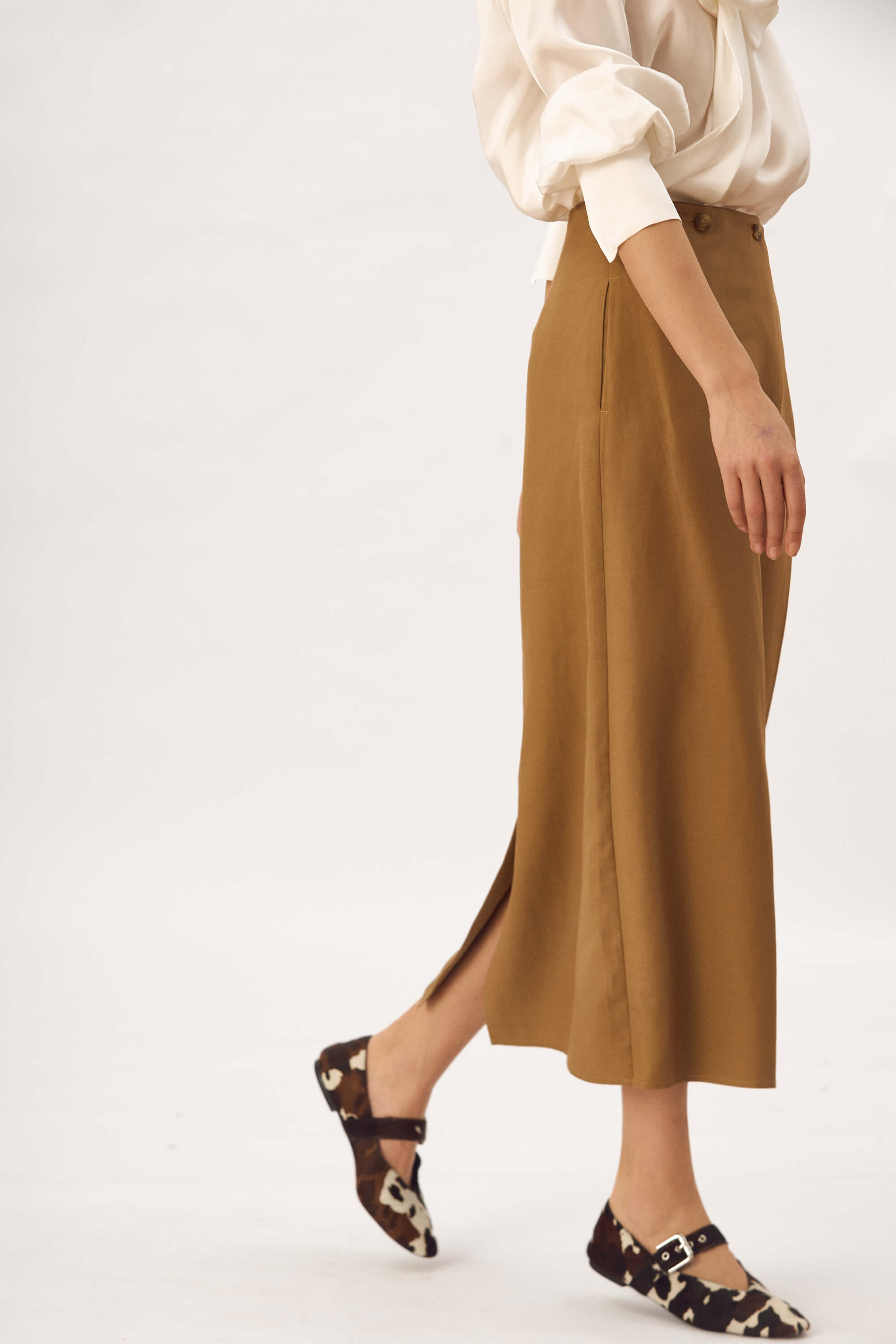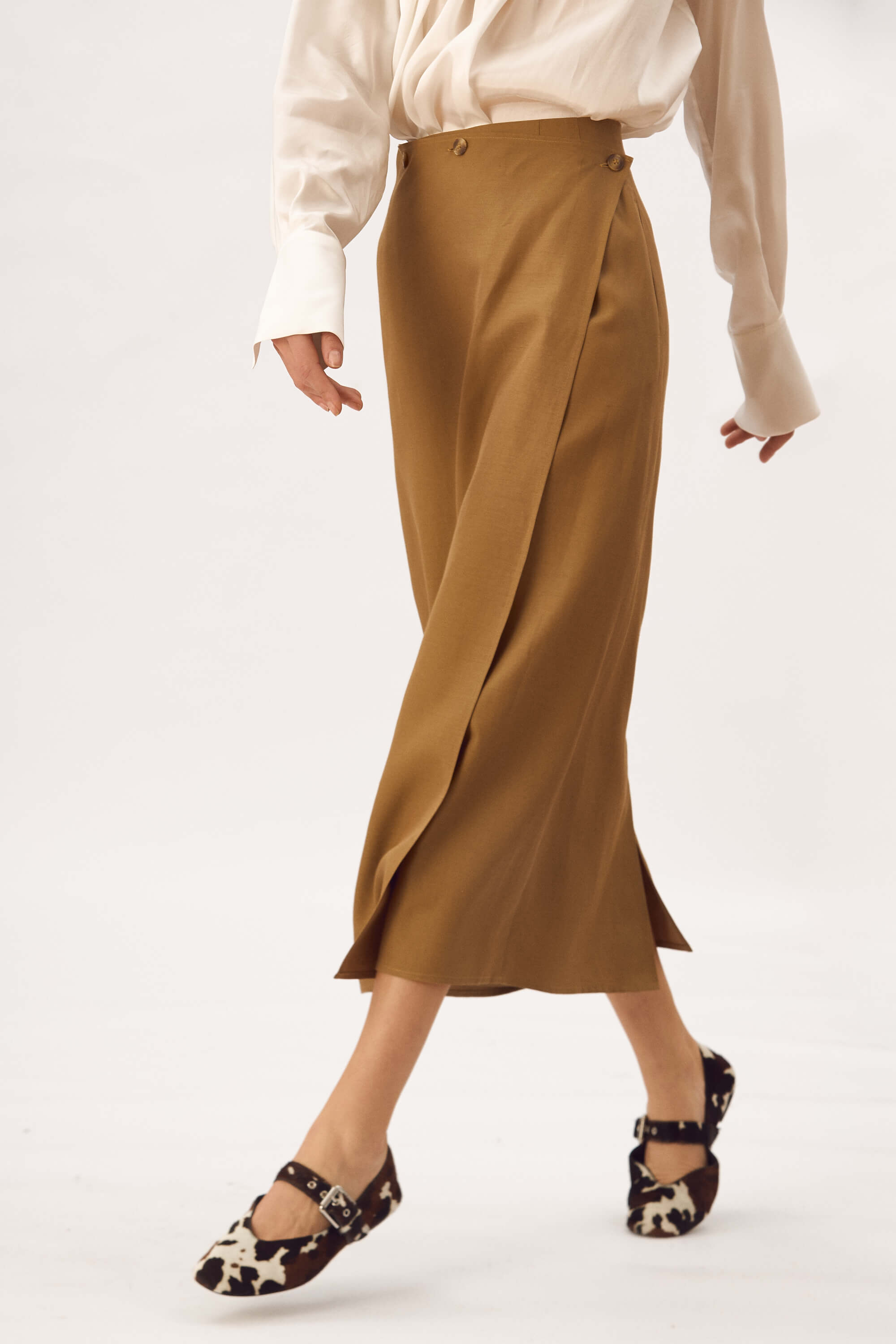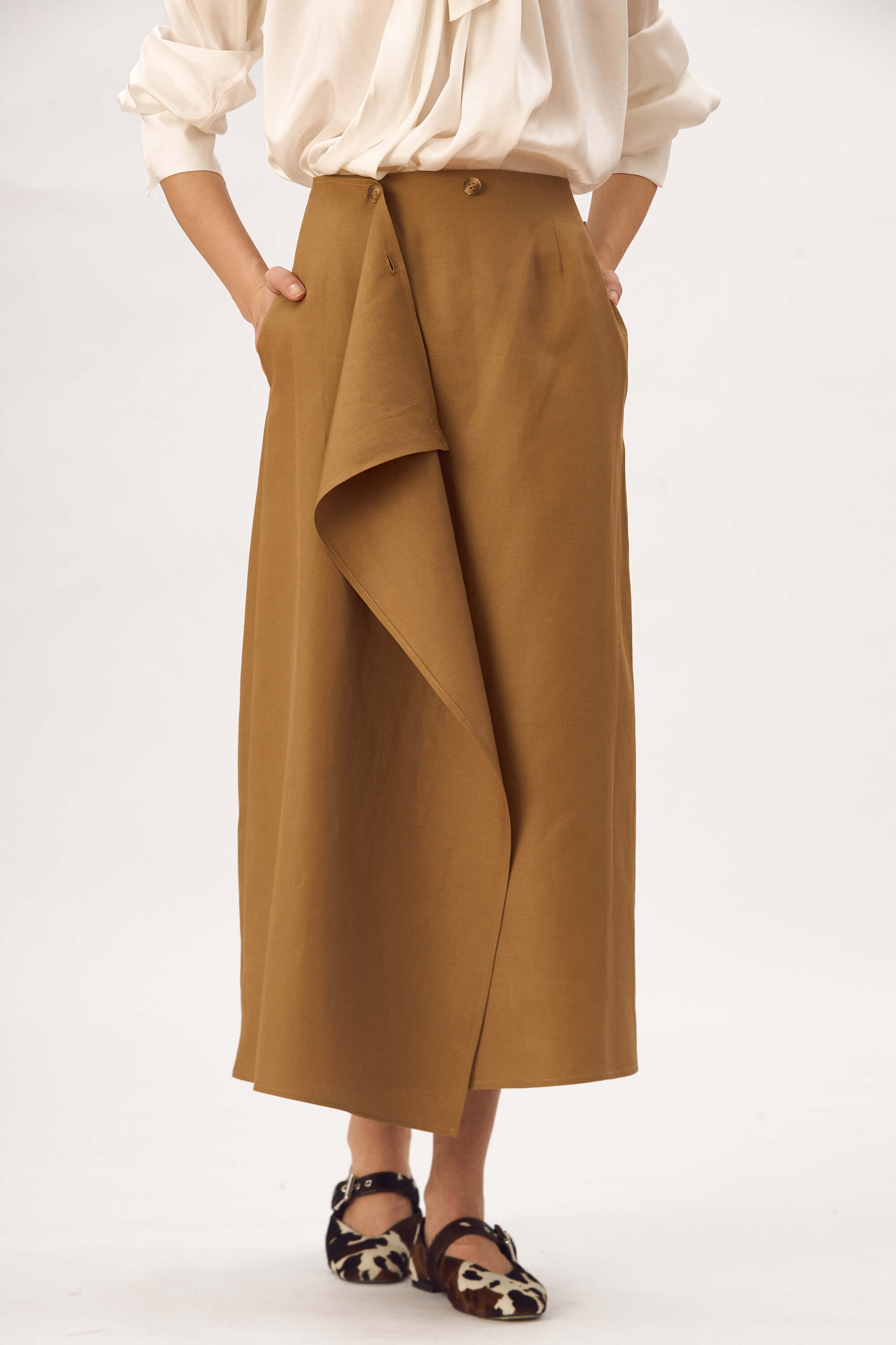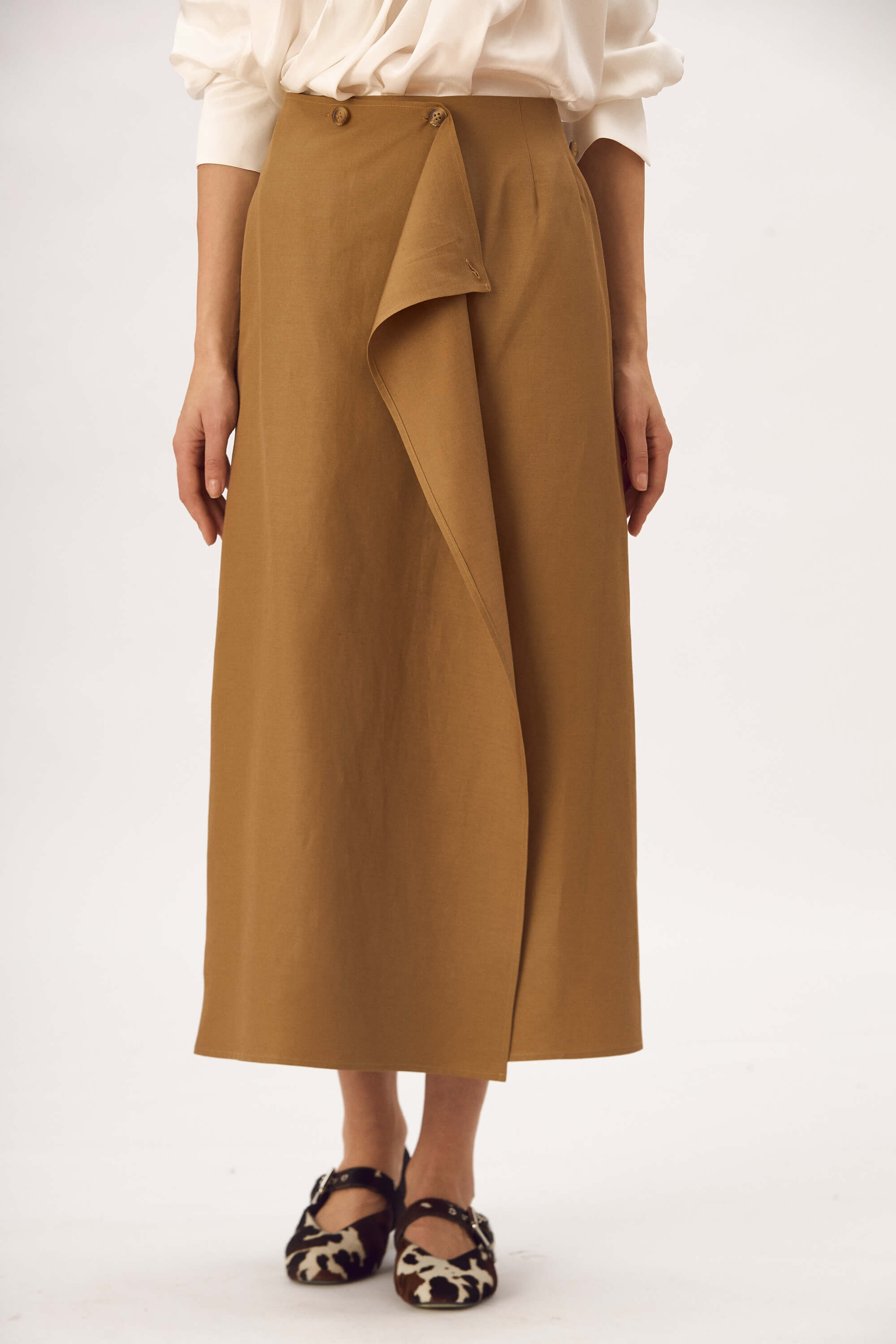 Fusta din amestec de in cu bumbac, cu panou frontal reglabil cu nasturi, care cade pe o parte, buzunare laterale si inchidere cu fermoar ascuns la spate si slit.