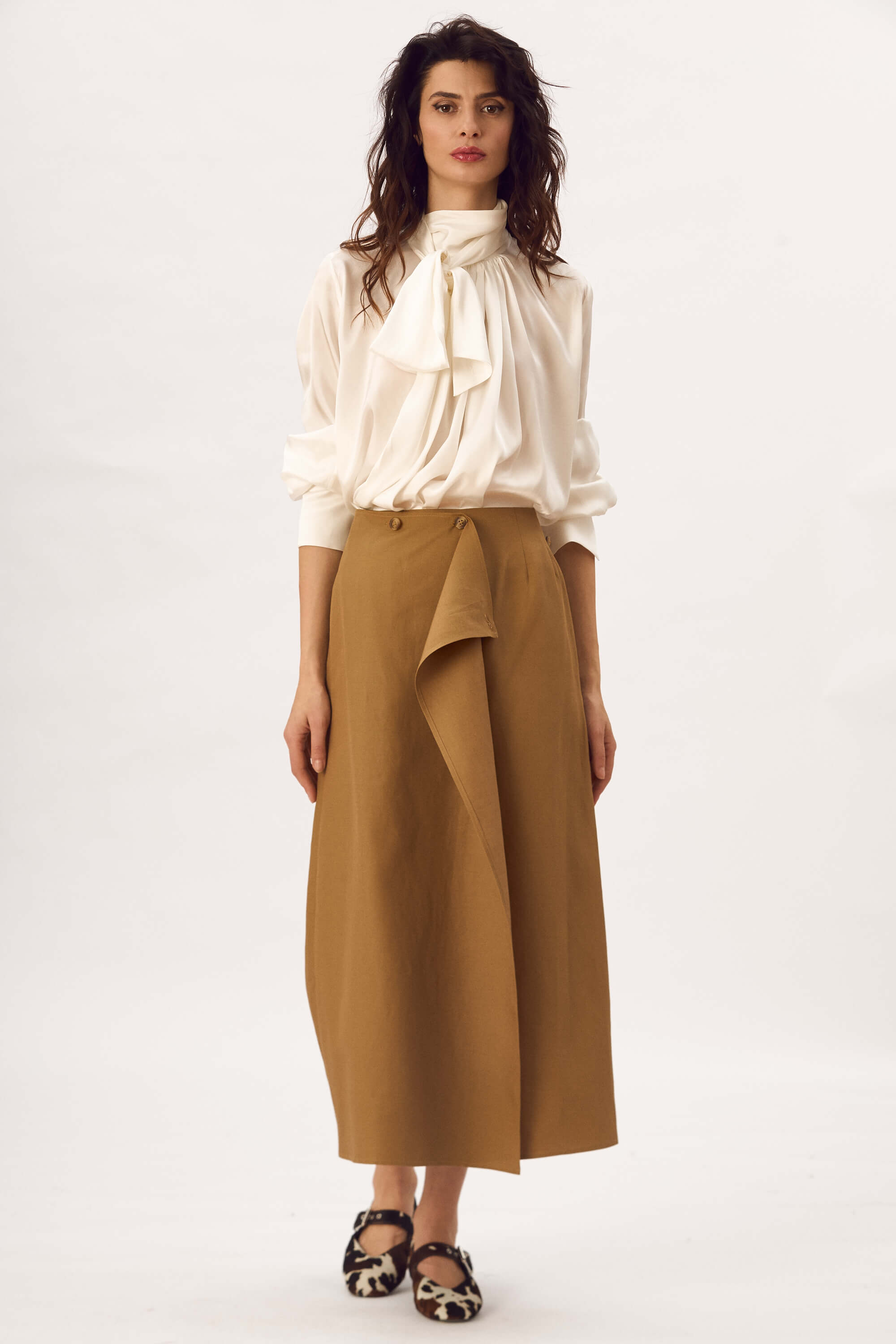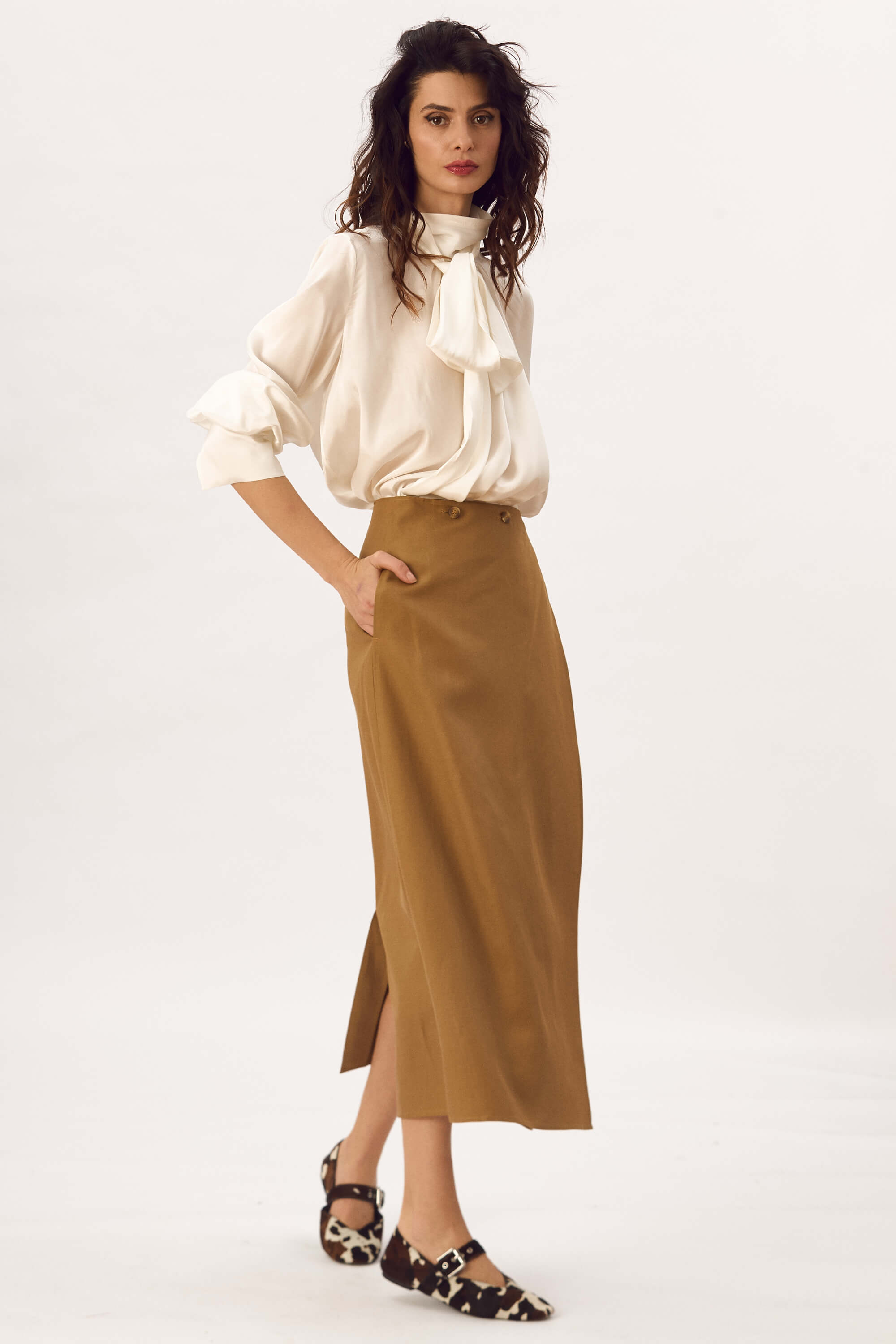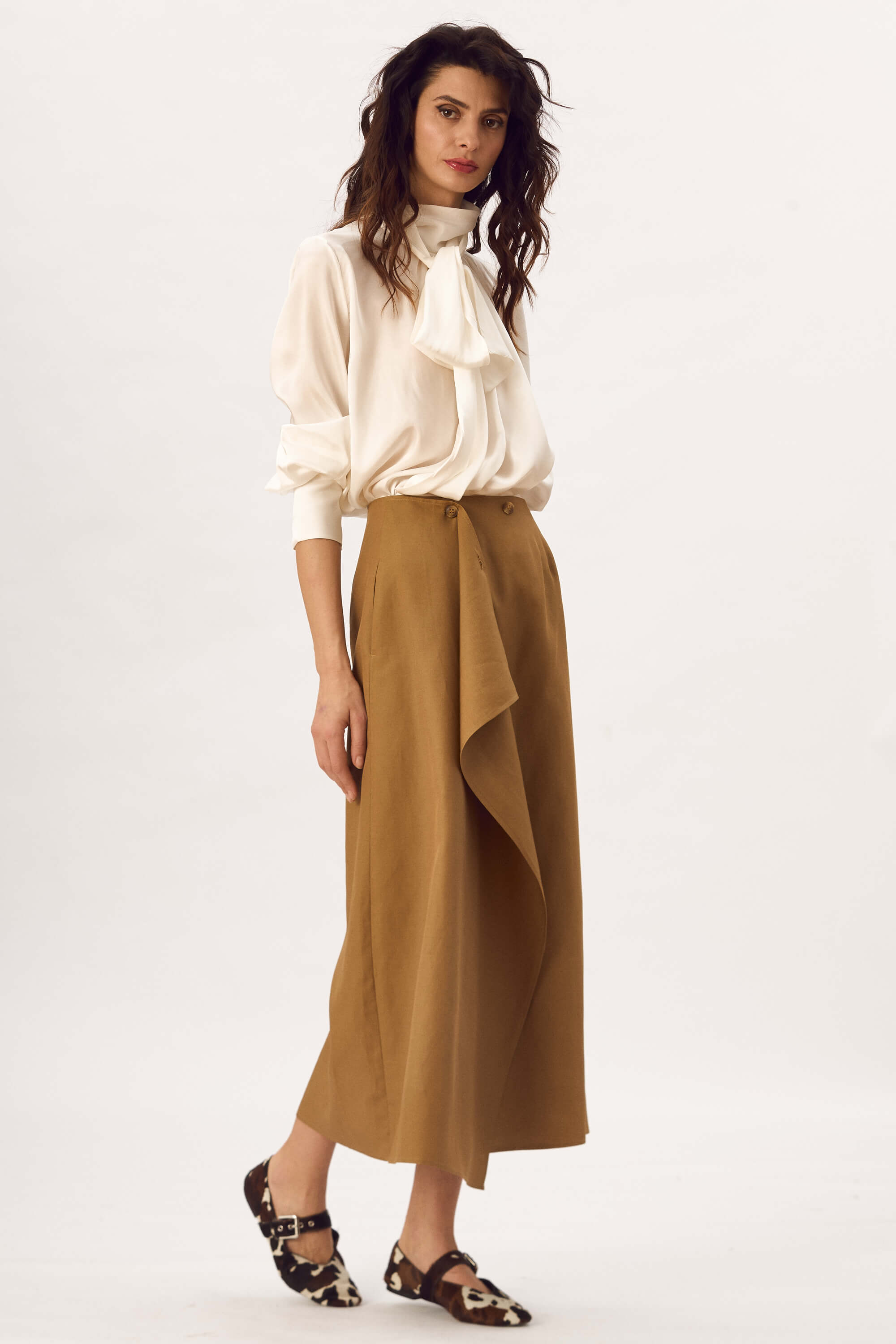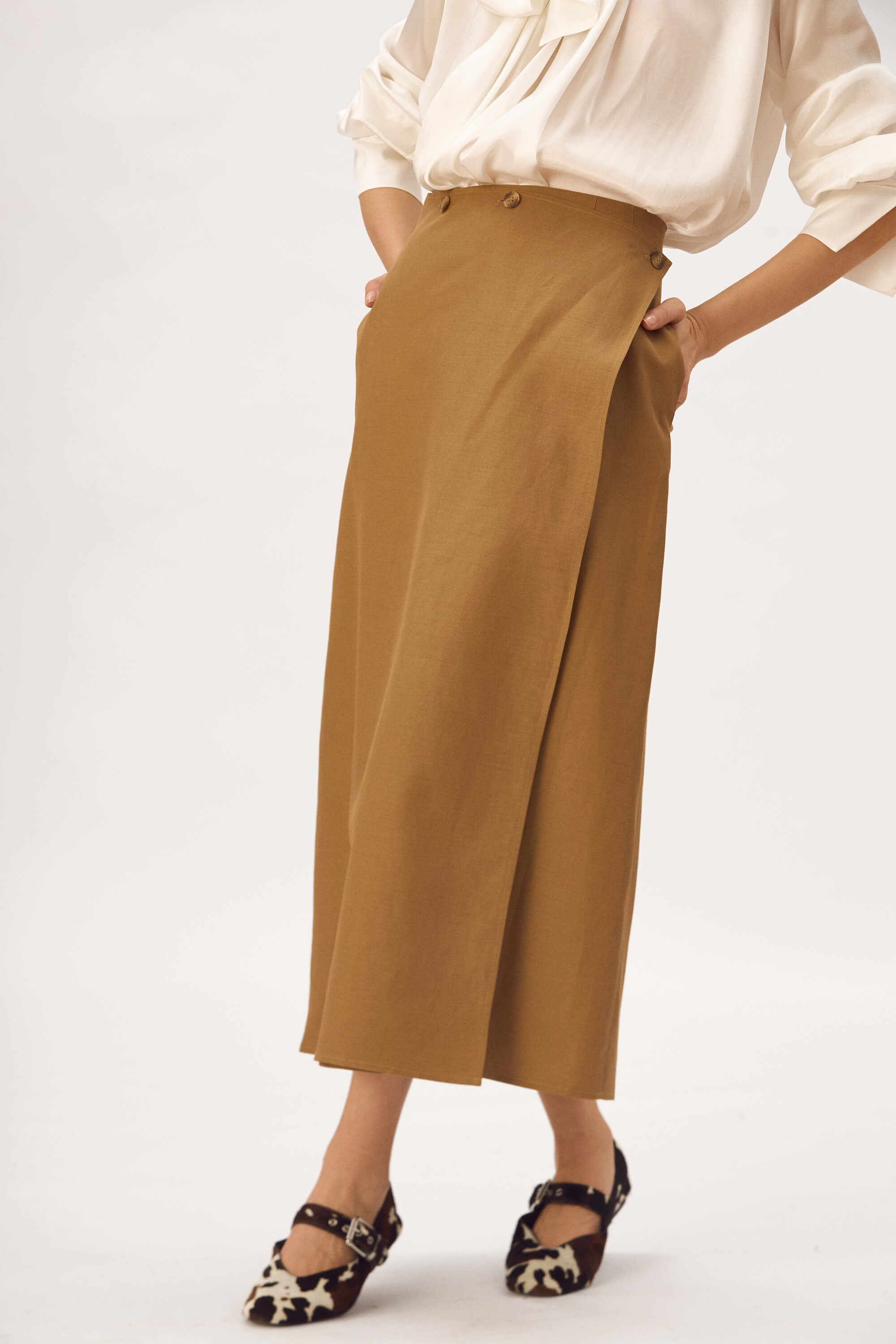 Fusta din amestec de in cu bumbac, cu panou frontal reglabil cu nasturi, care cade pe o parte, buzunare laterale si inchidere cu fermoar ascuns la spate si slit.
