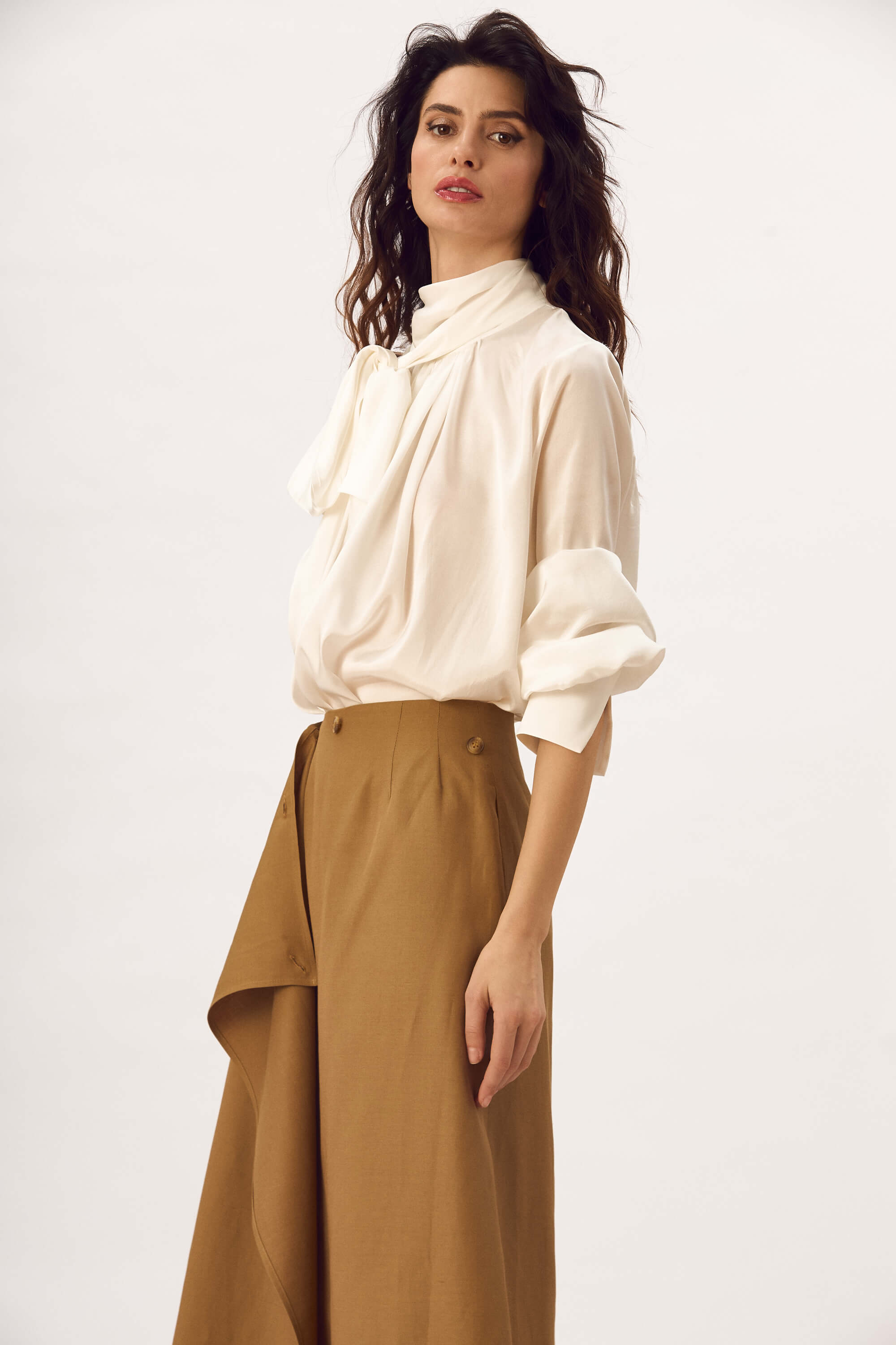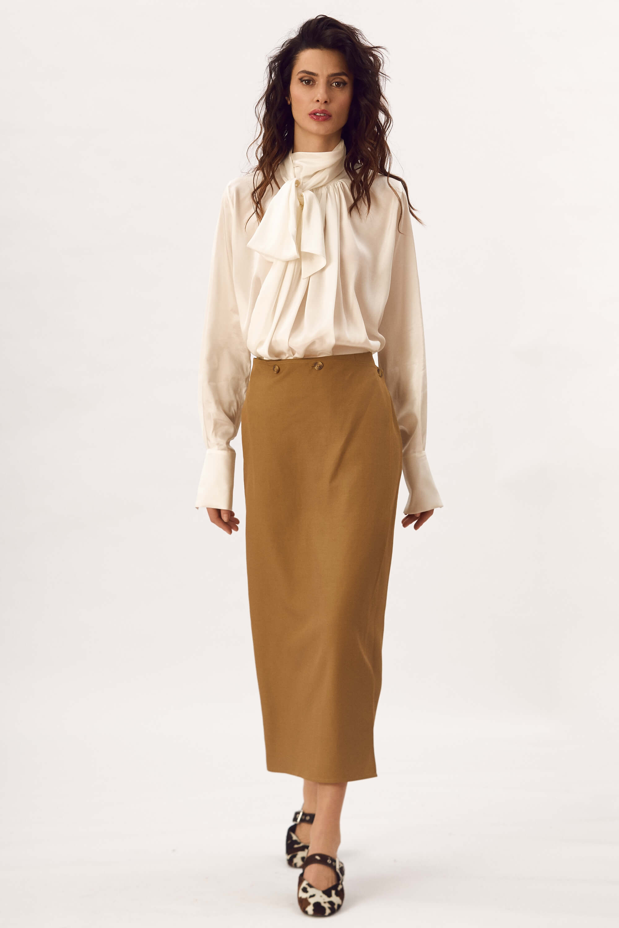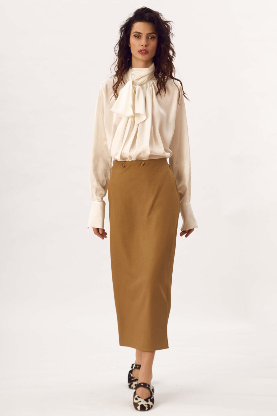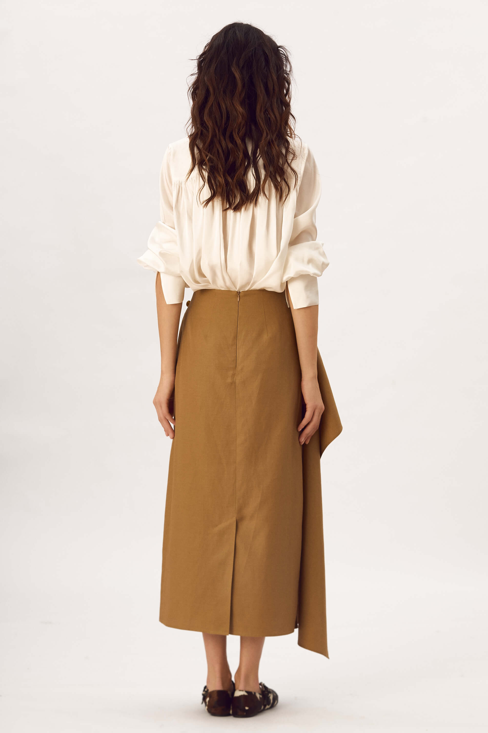 Fusta din amestec de in cu bumbac, cu panou frontal reglabil cu nasturi, care cade pe o parte, buzunare laterale si inchidere cu fermoar ascuns la spate si slit.