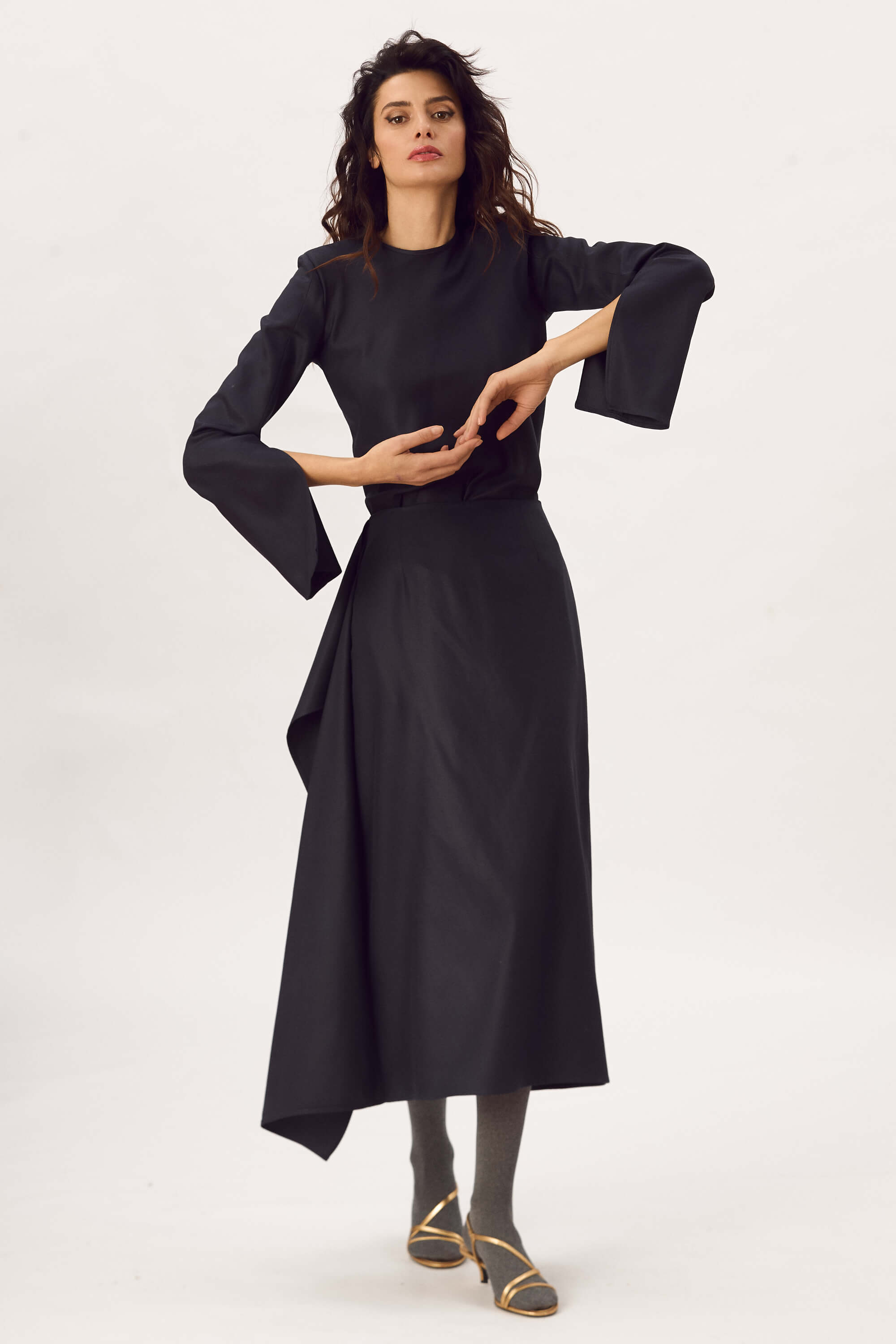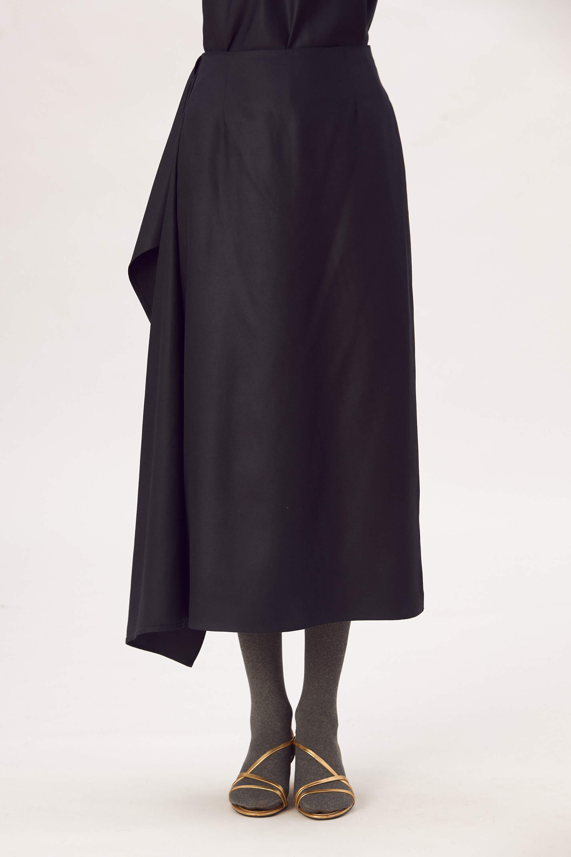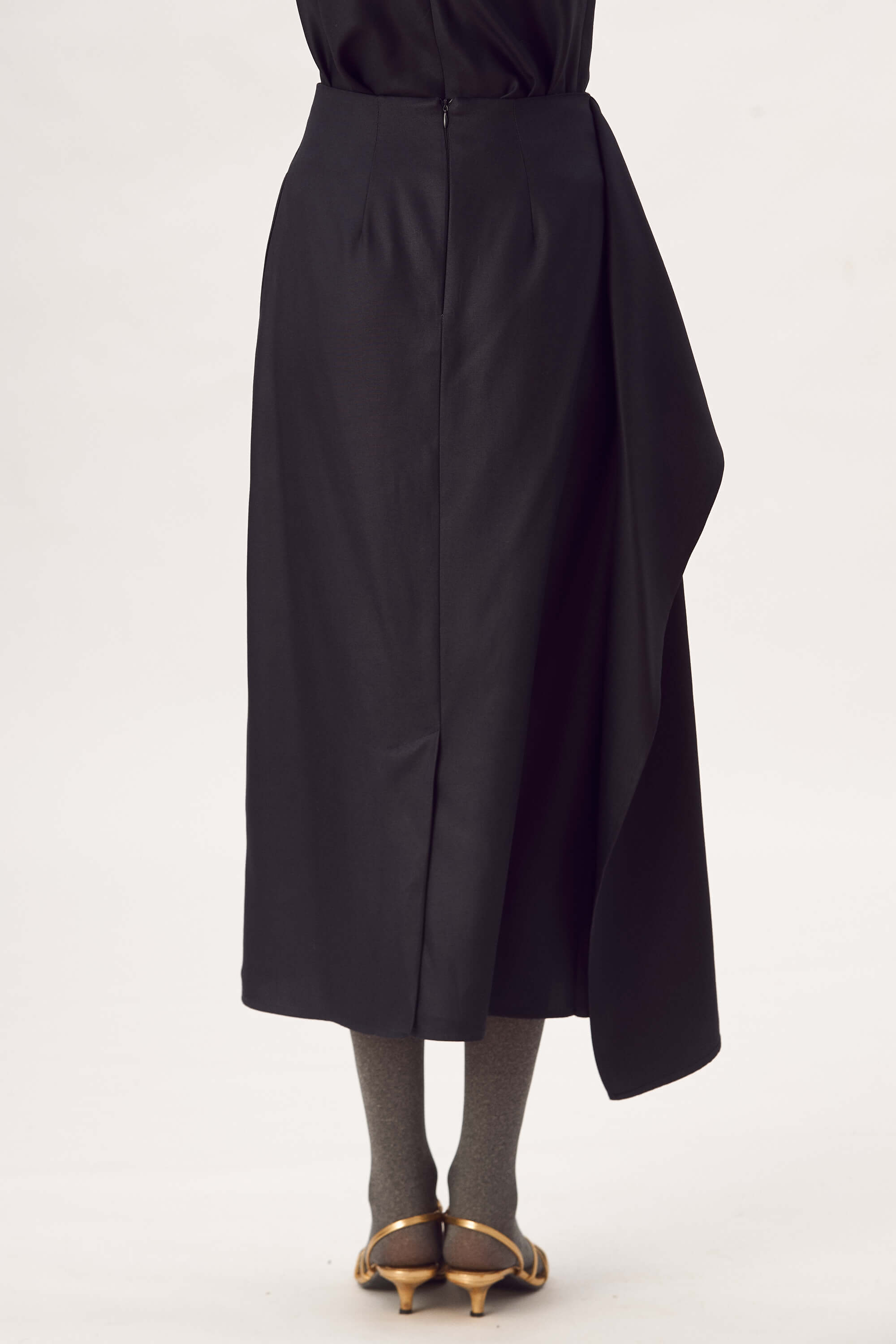 Fusta din amestec de lyocell cu bumbac, cu panou lateral drapat, care cade pe o parte, buzunare laterale, inchidere cu fermoar ascuns la spate, croiala dreapta la baza cu slit la spate.