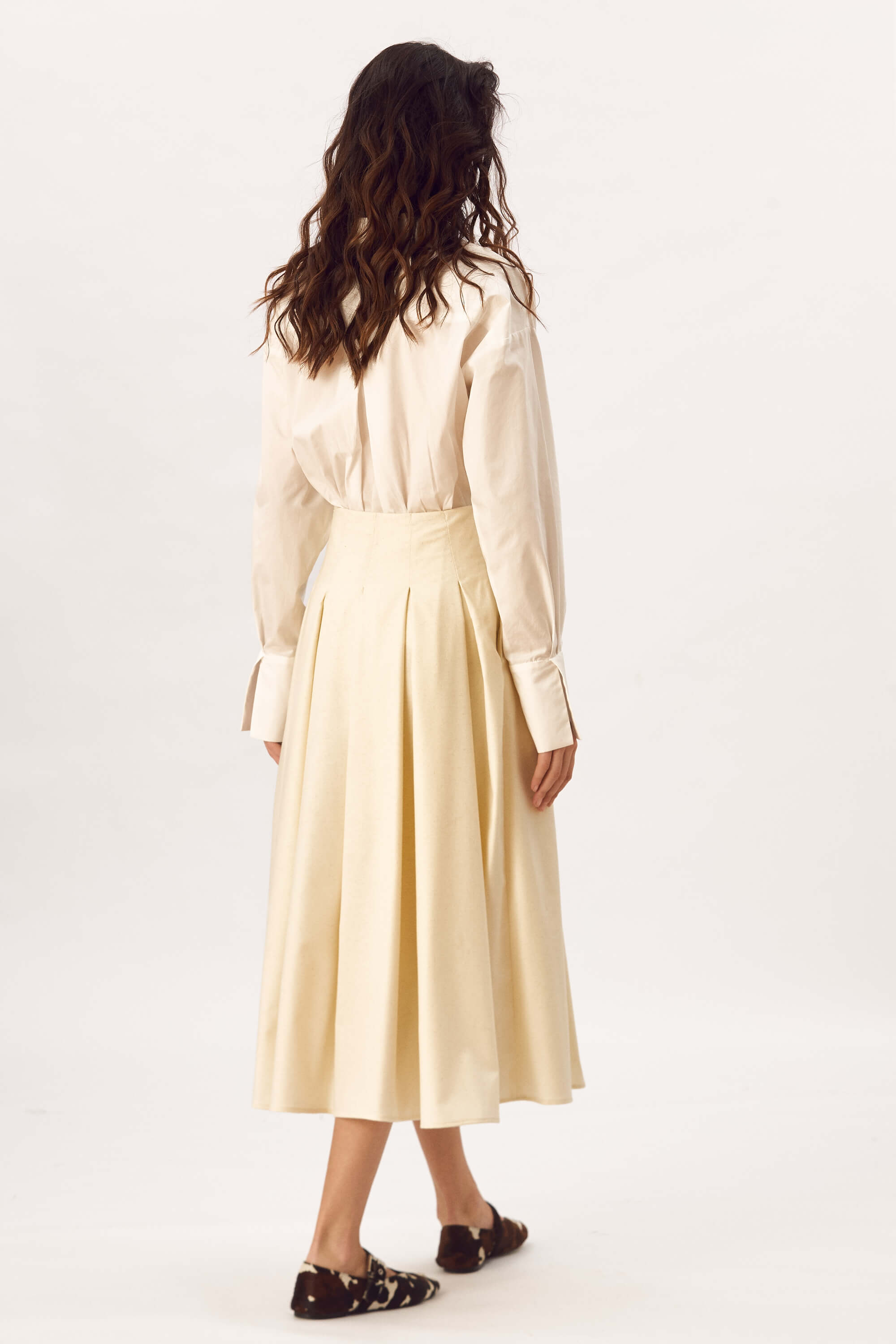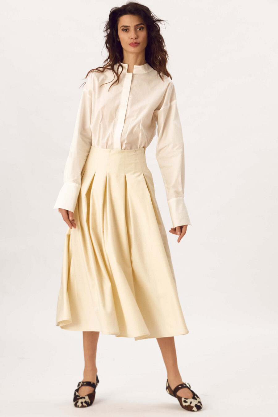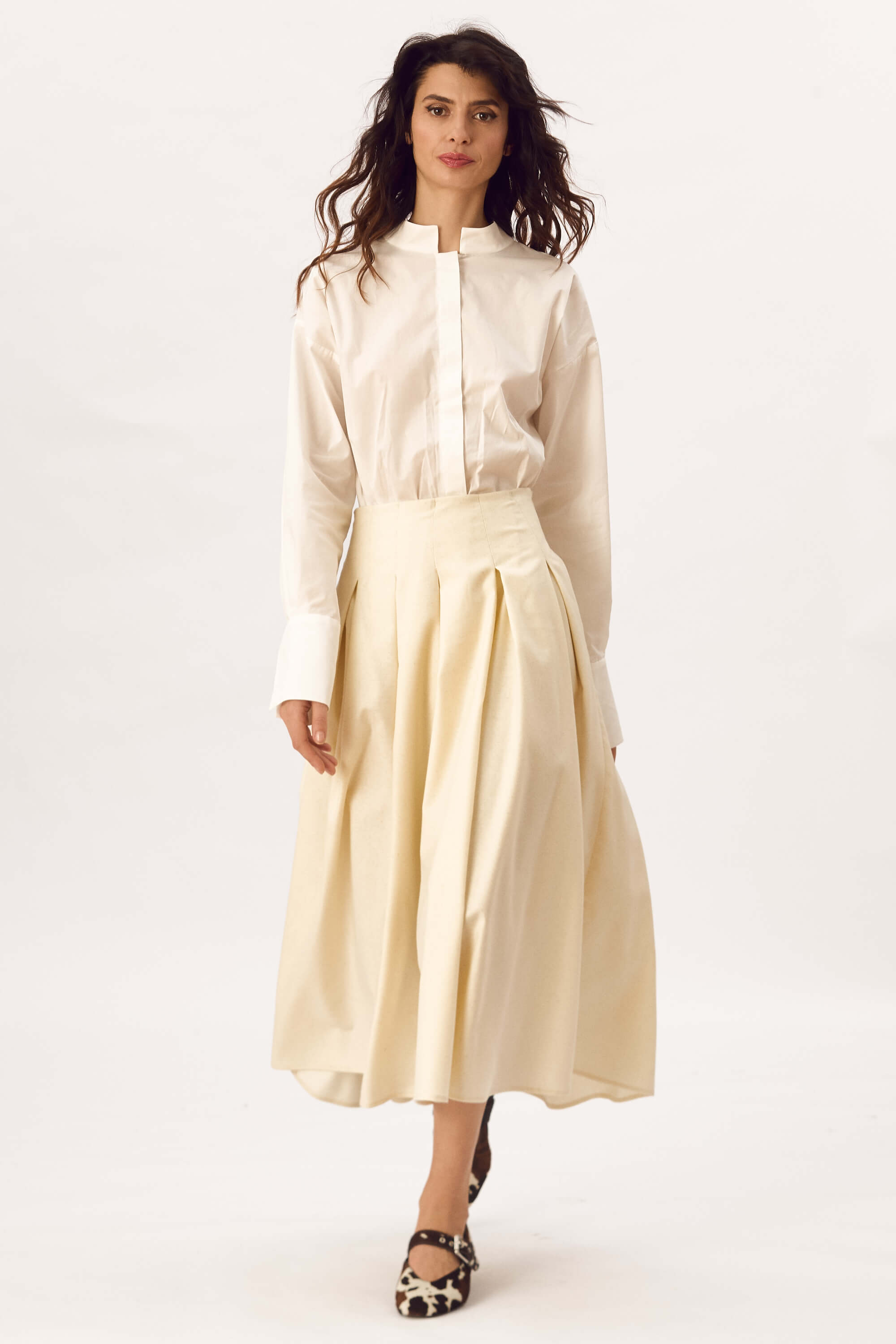 Fusta pana la gamba, din lana subtire, cu pliuri de jur imprejur pentru o silueta cu volum. Talie inalta cu fermoar si buzunare laterale.