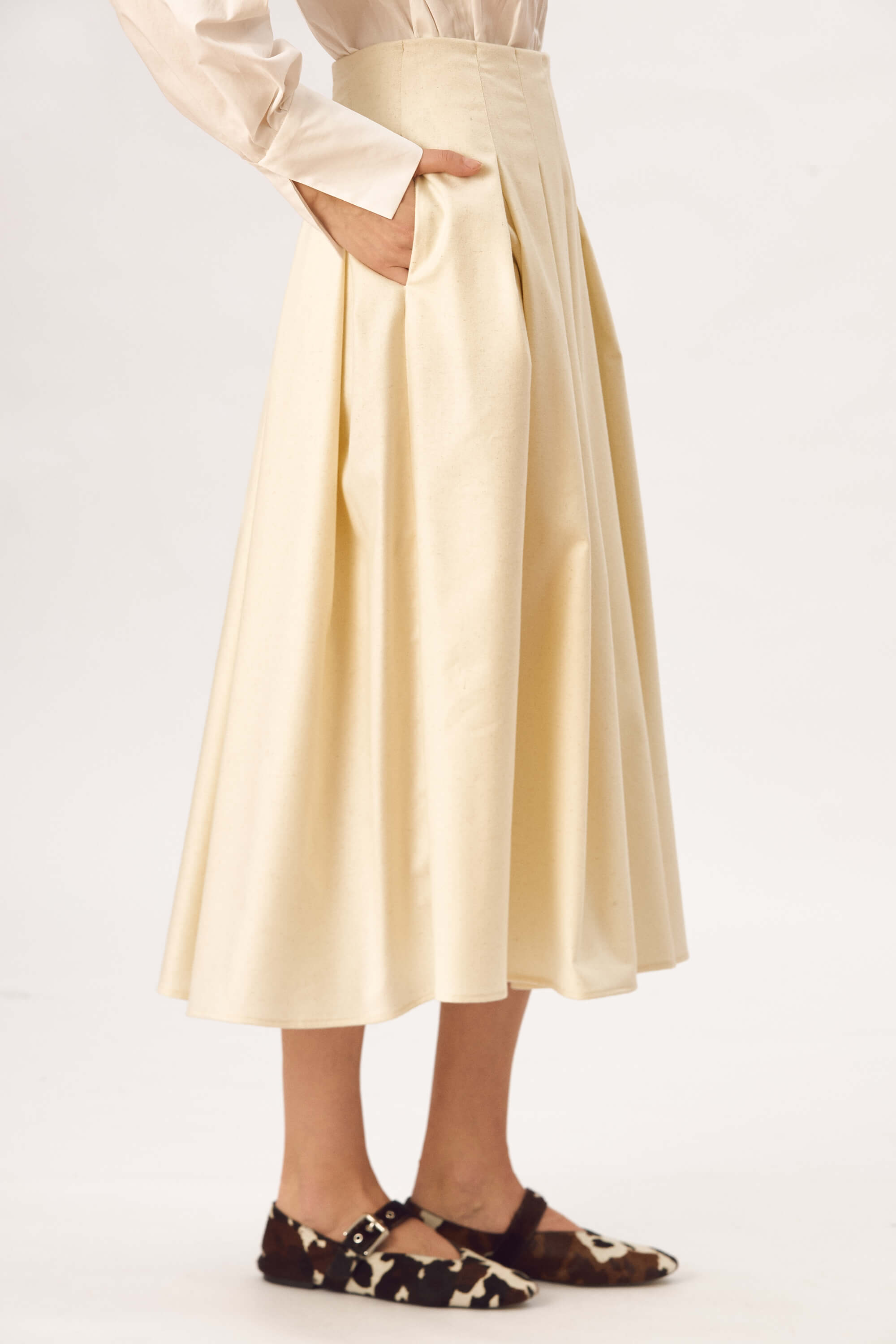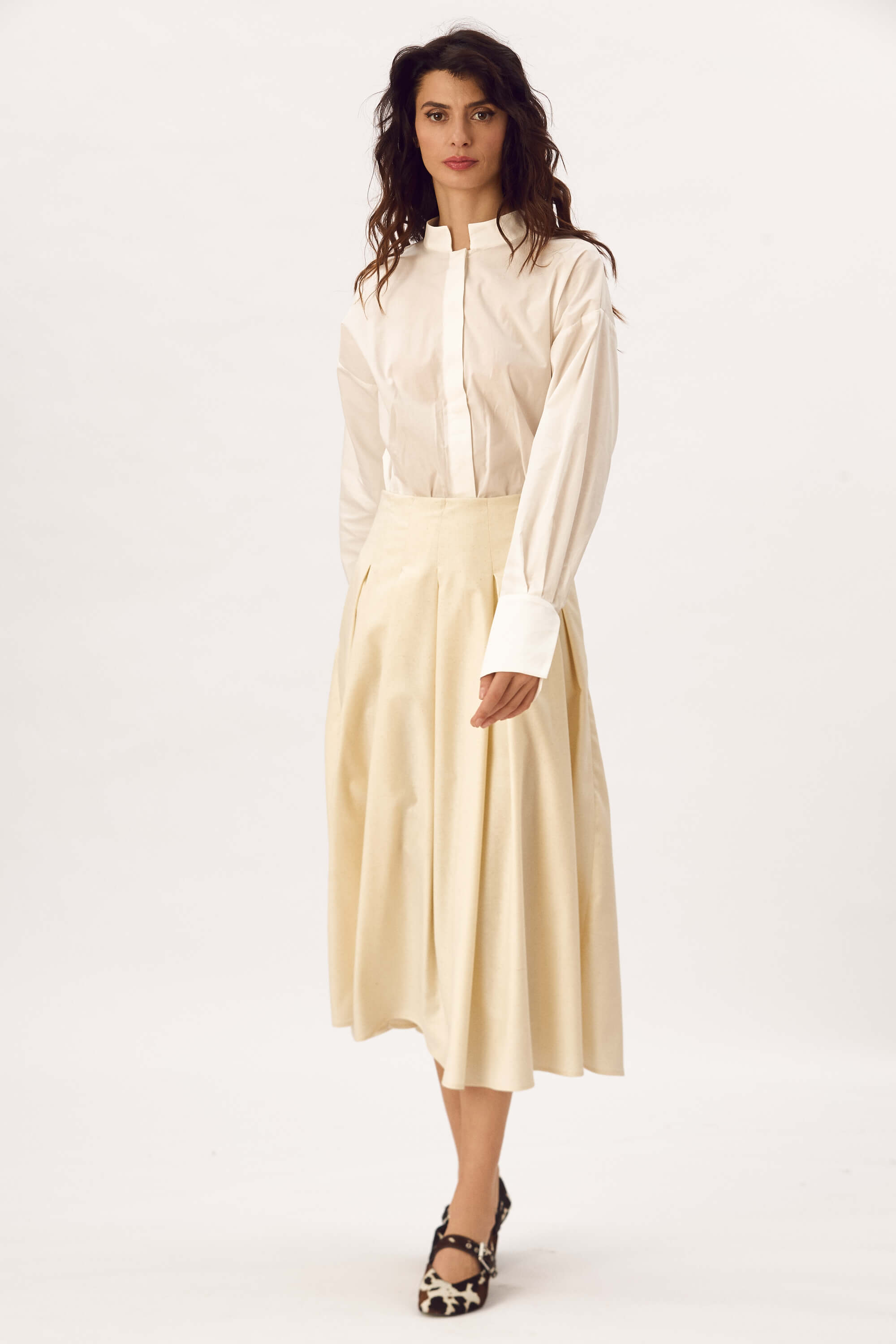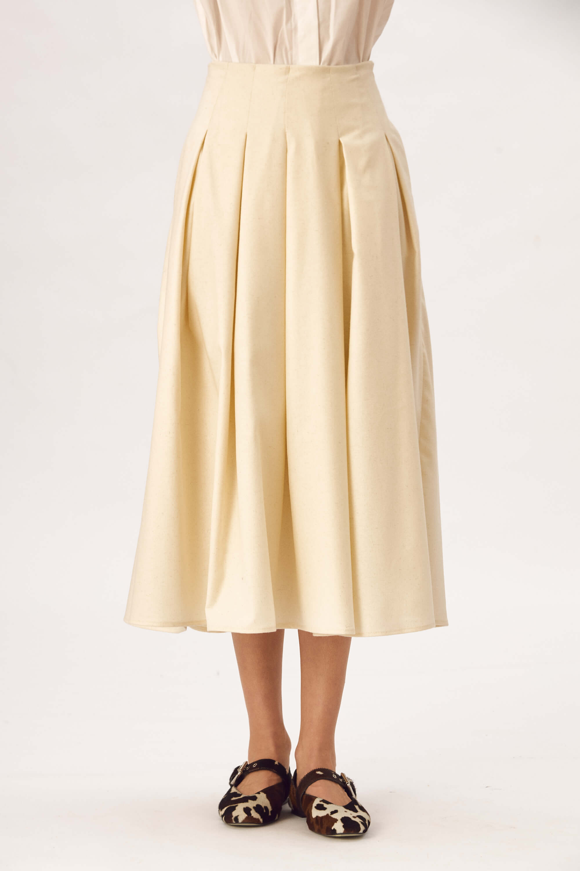 Fusta pana la gamba, din lana subtire, cu pliuri de jur imprejur pentru o silueta cu volum. Talie inalta cu fermoar si buzunare laterale.