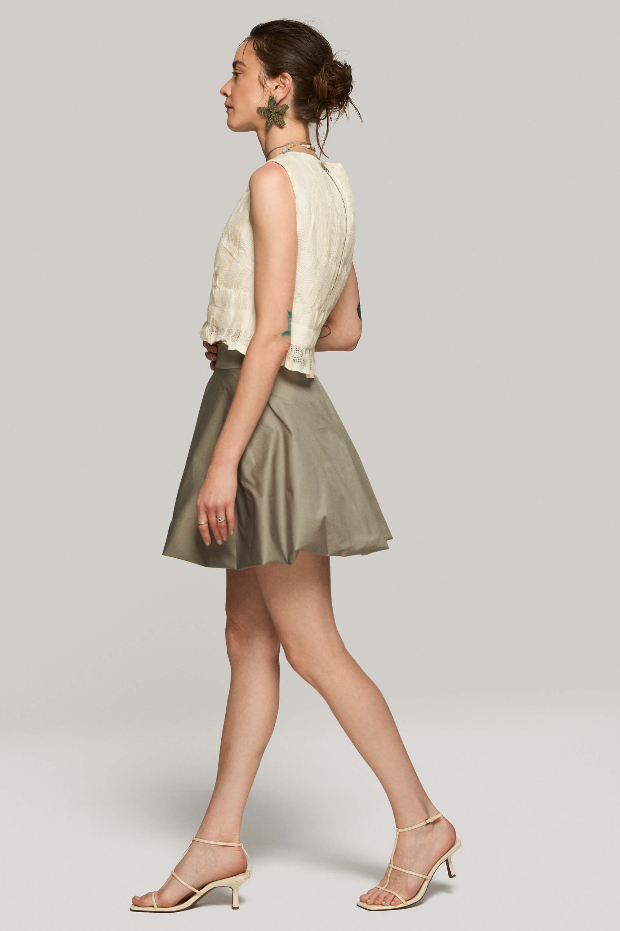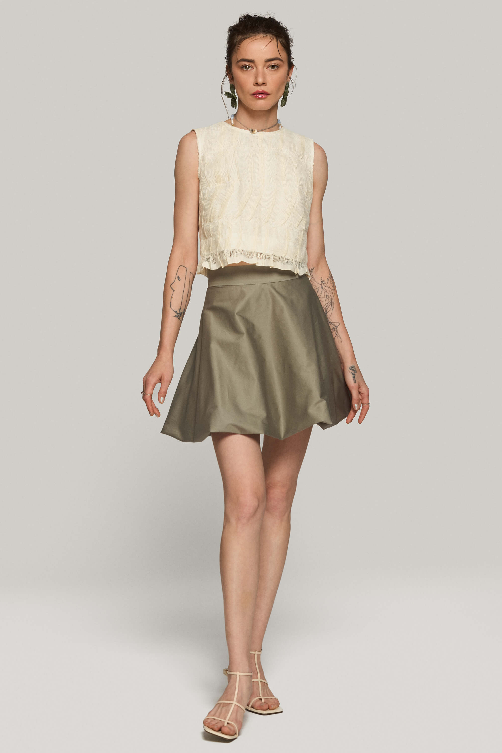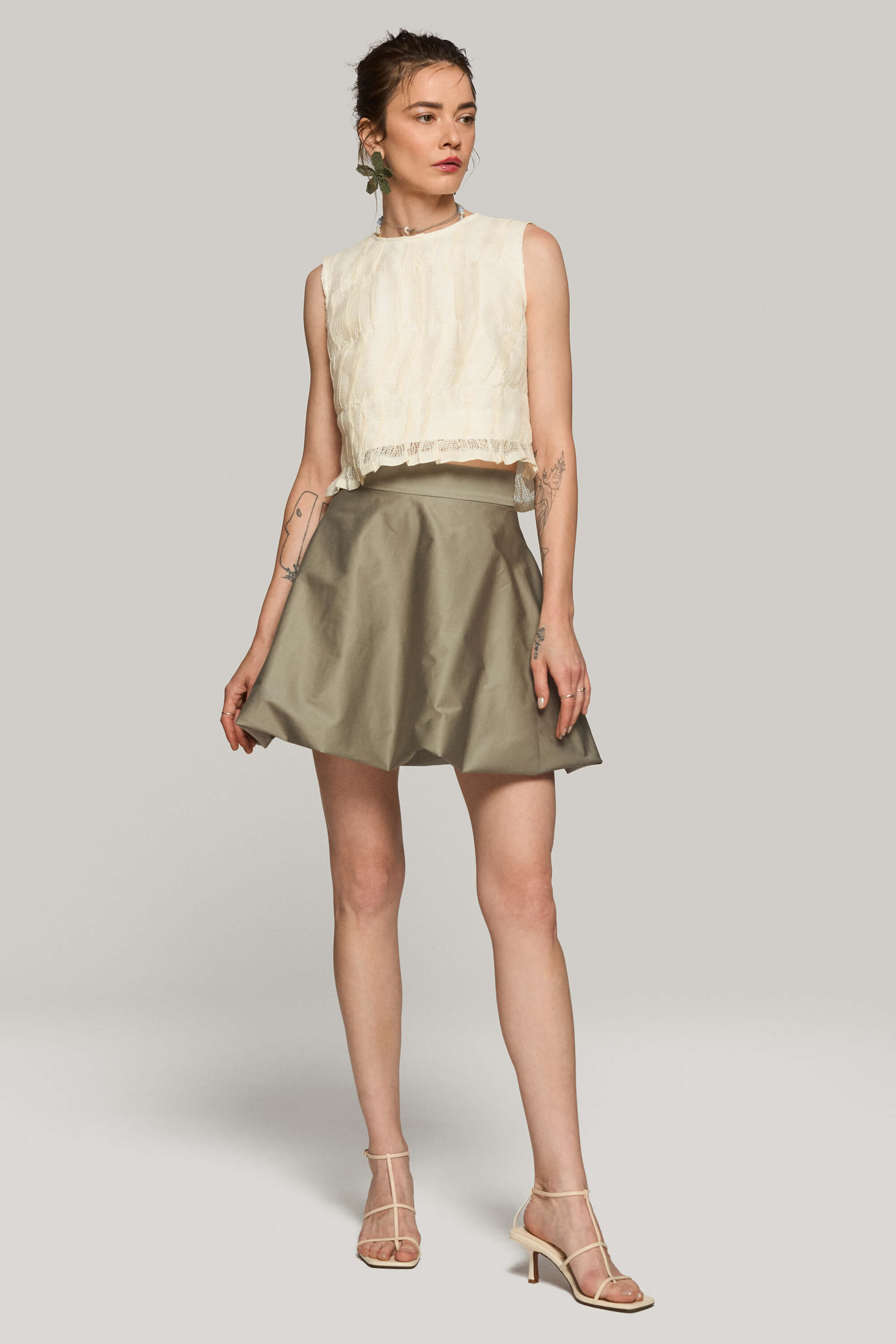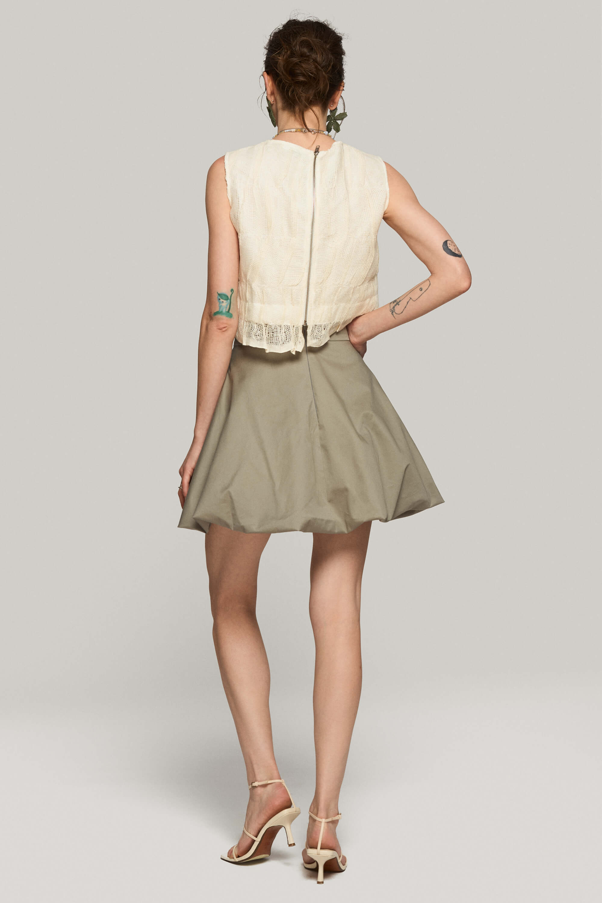 Fusta scurta din bumbac satinat, cu tiv tip balon pentru o silueta voluminoasa si inchidere cu fermoar ascuns la spate.