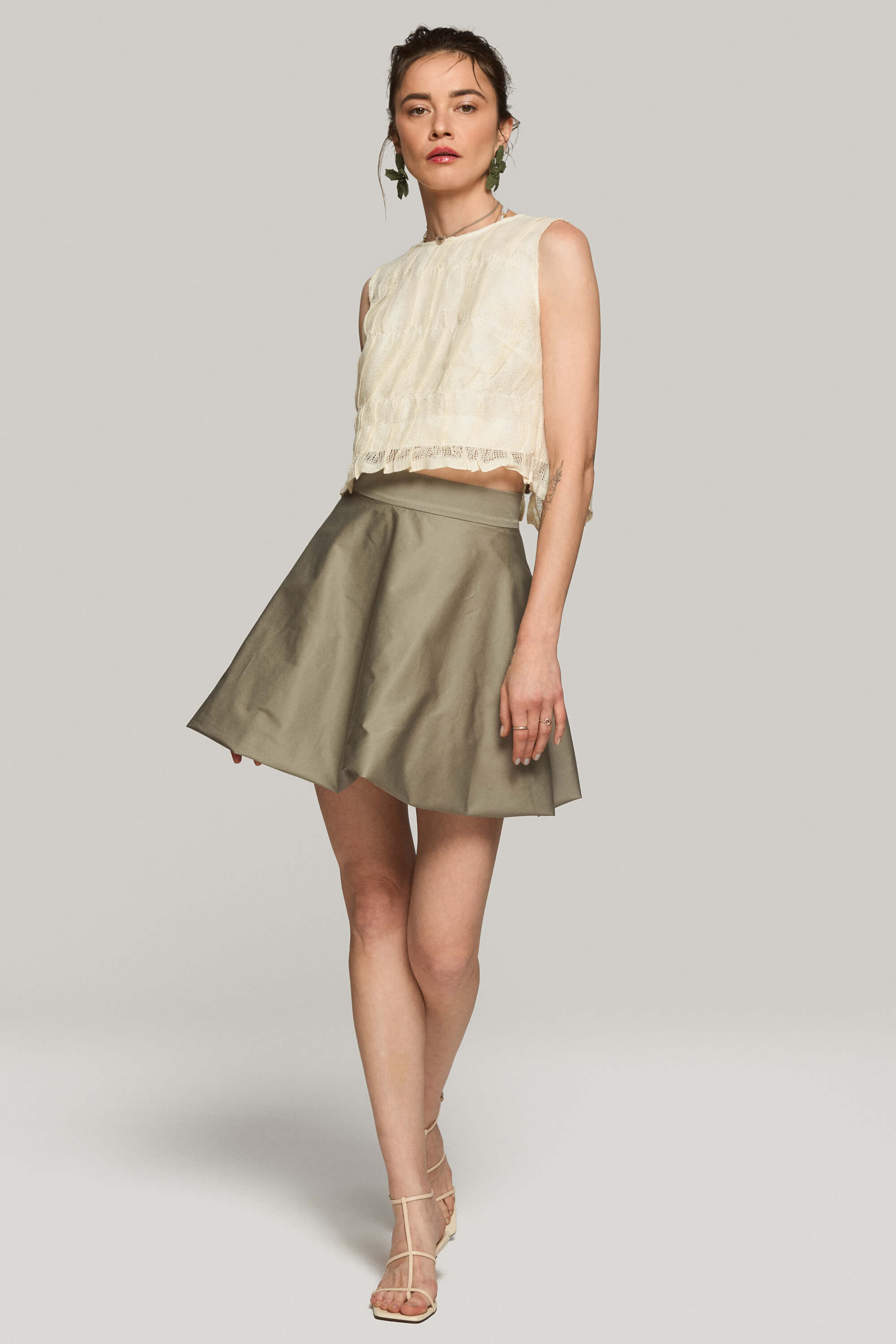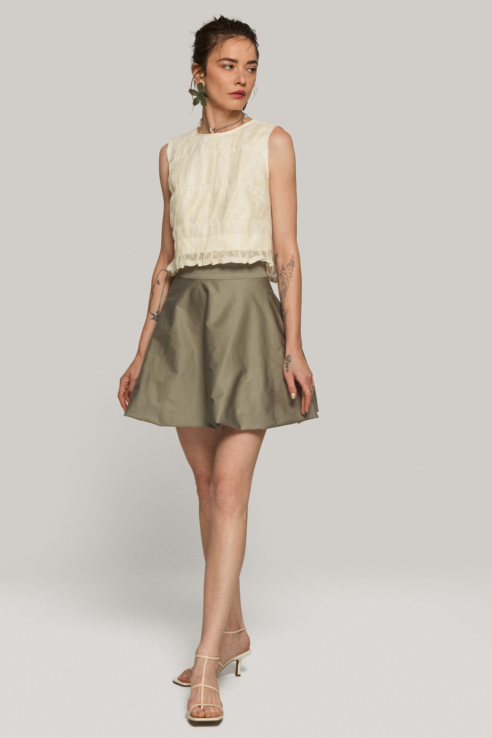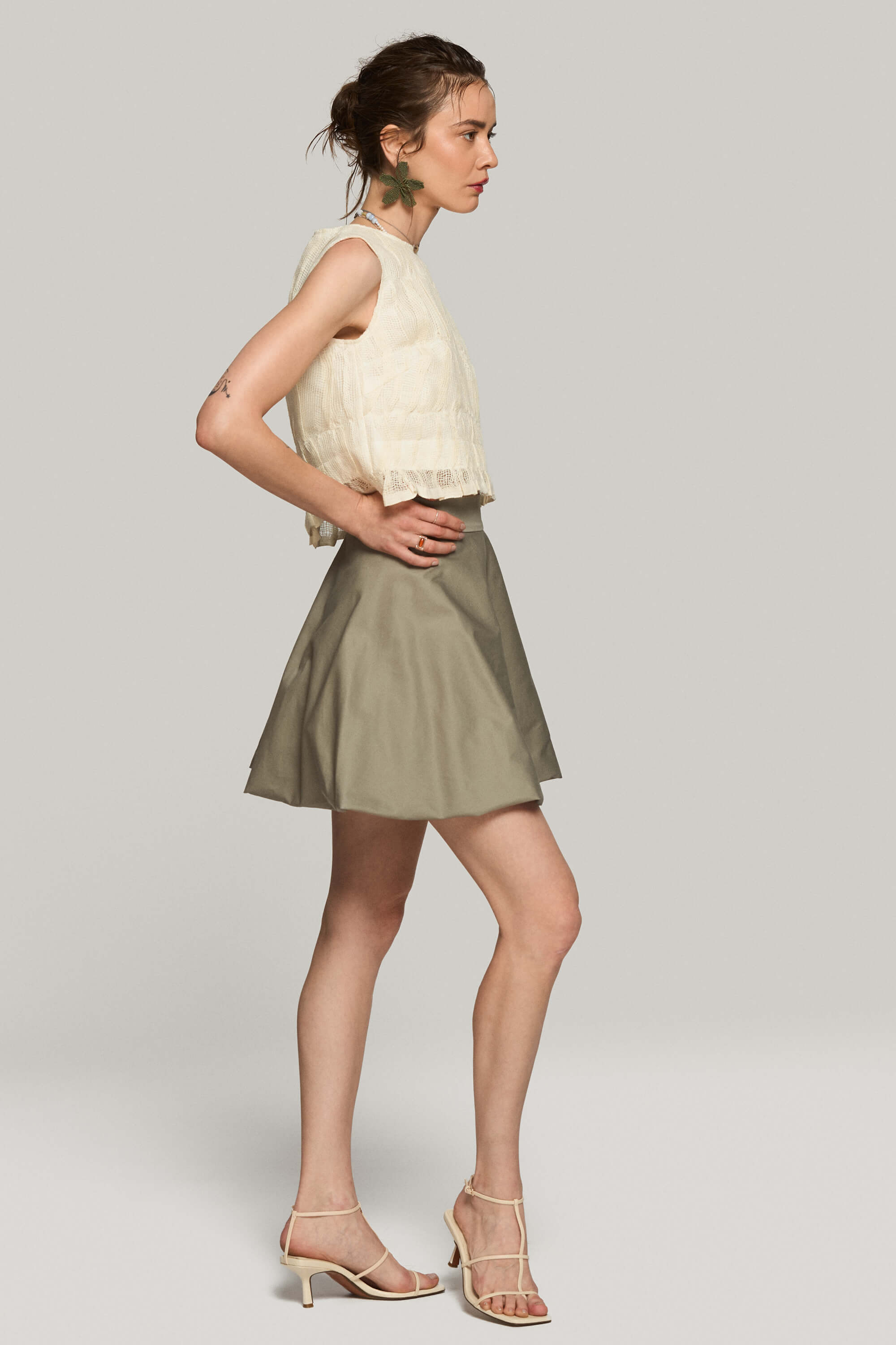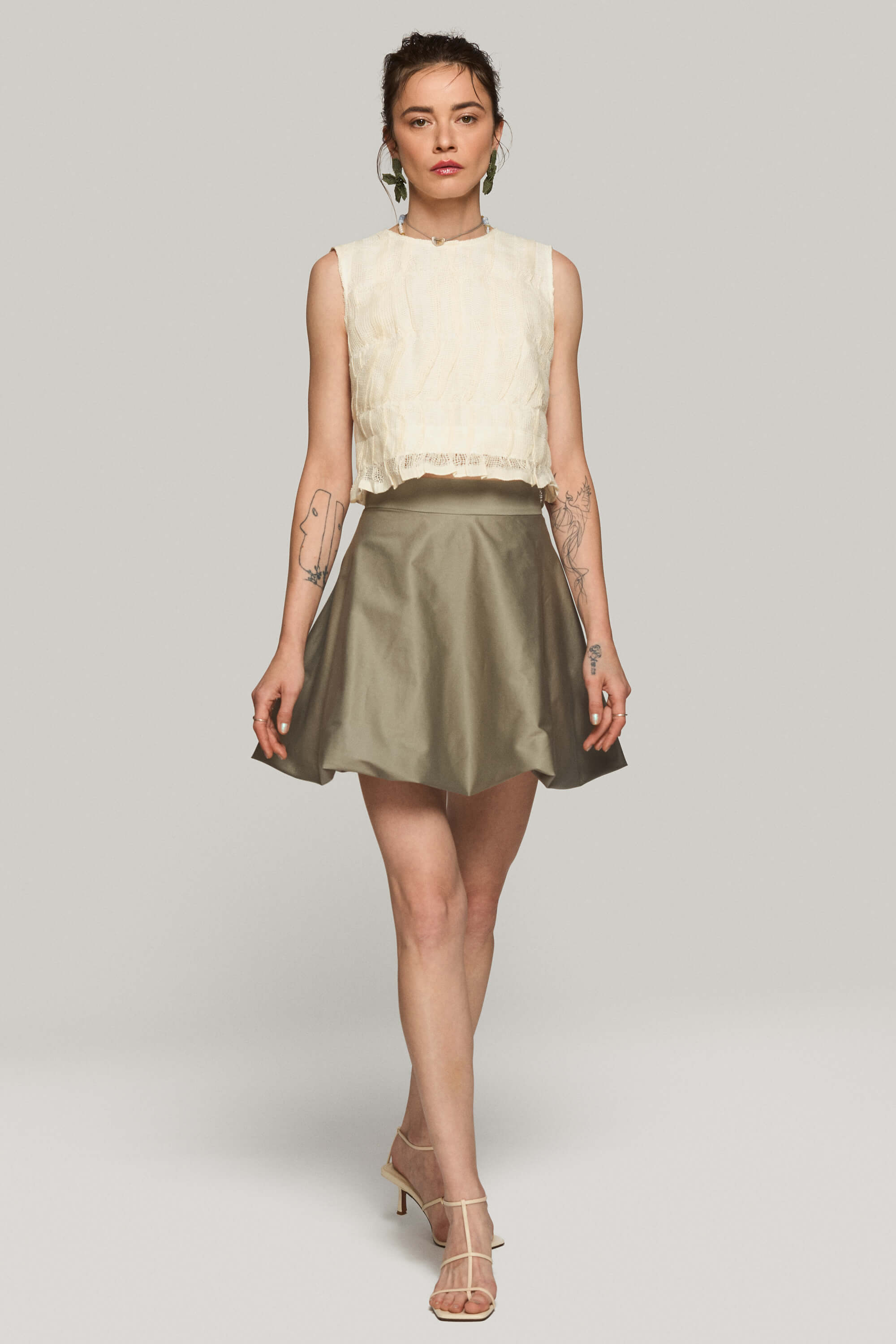 Fusta scurta din bumbac satinat, cu tiv tip balon pentru o silueta voluminoasa si inchidere cu fermoar ascuns la spate.