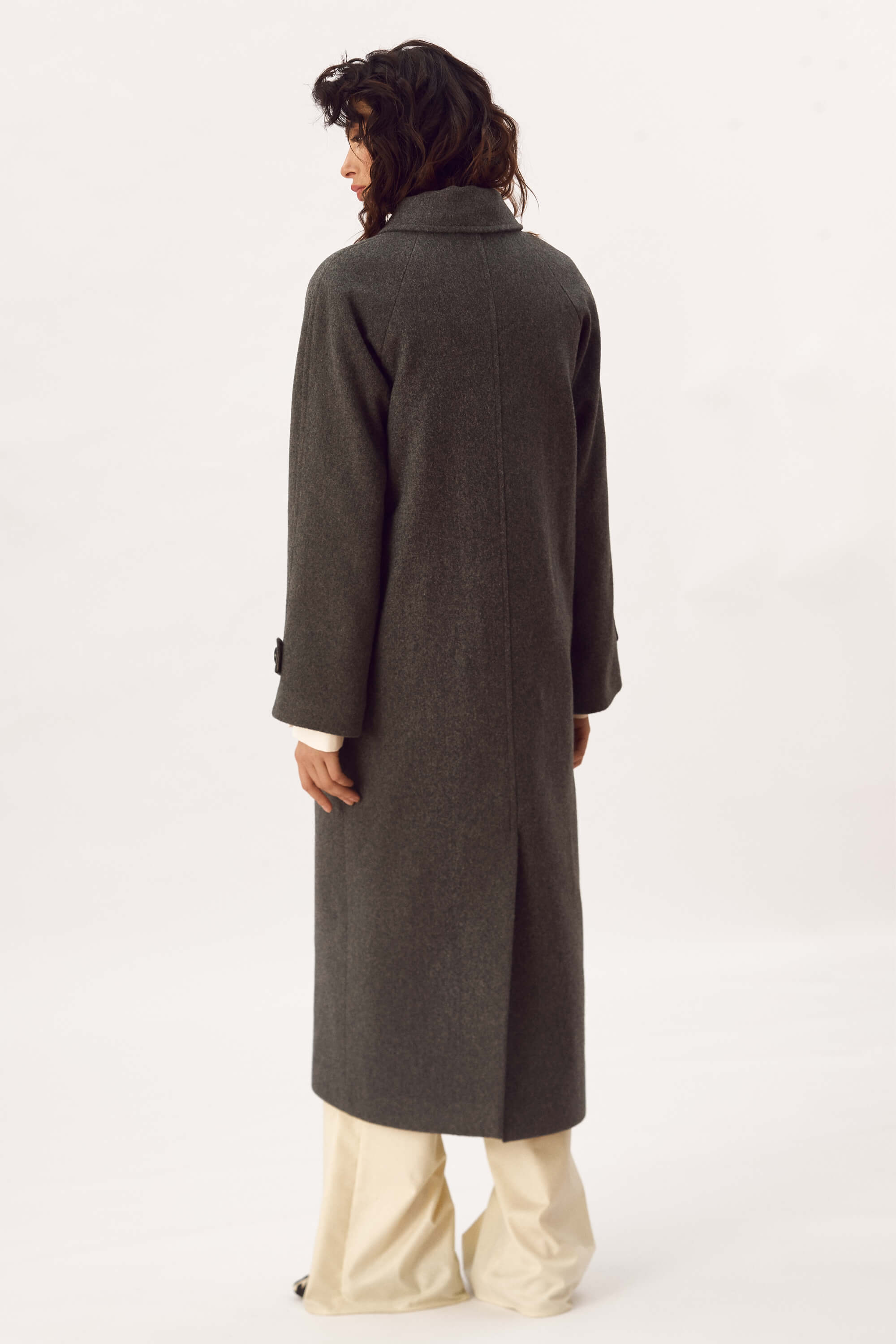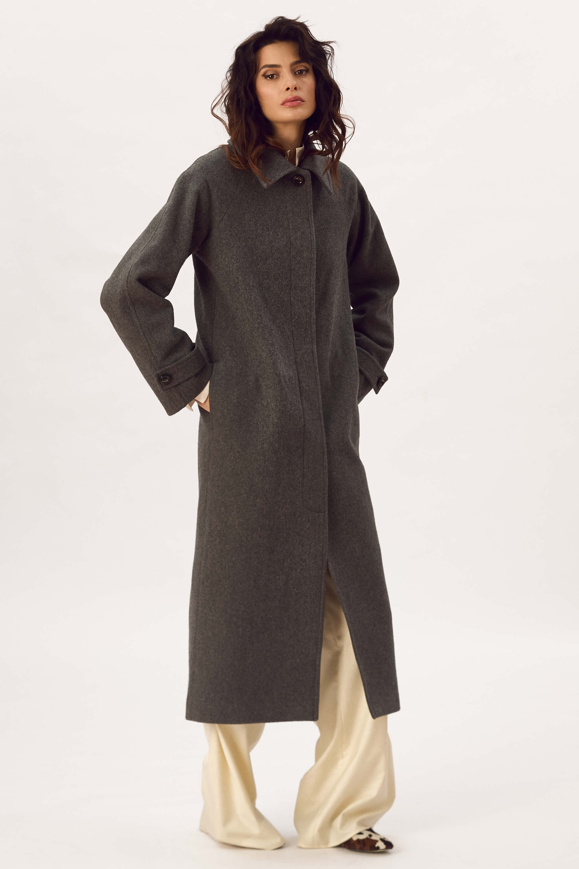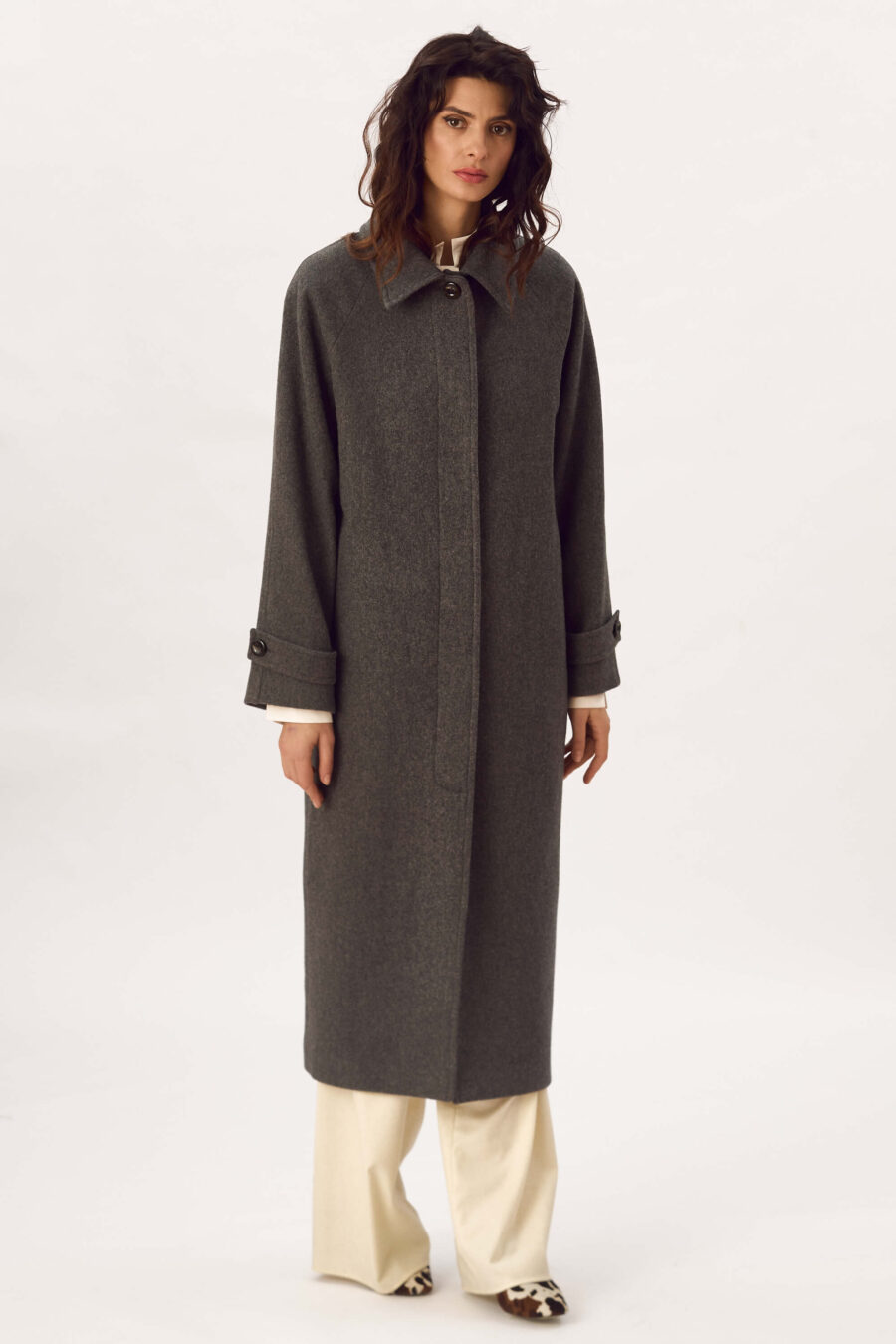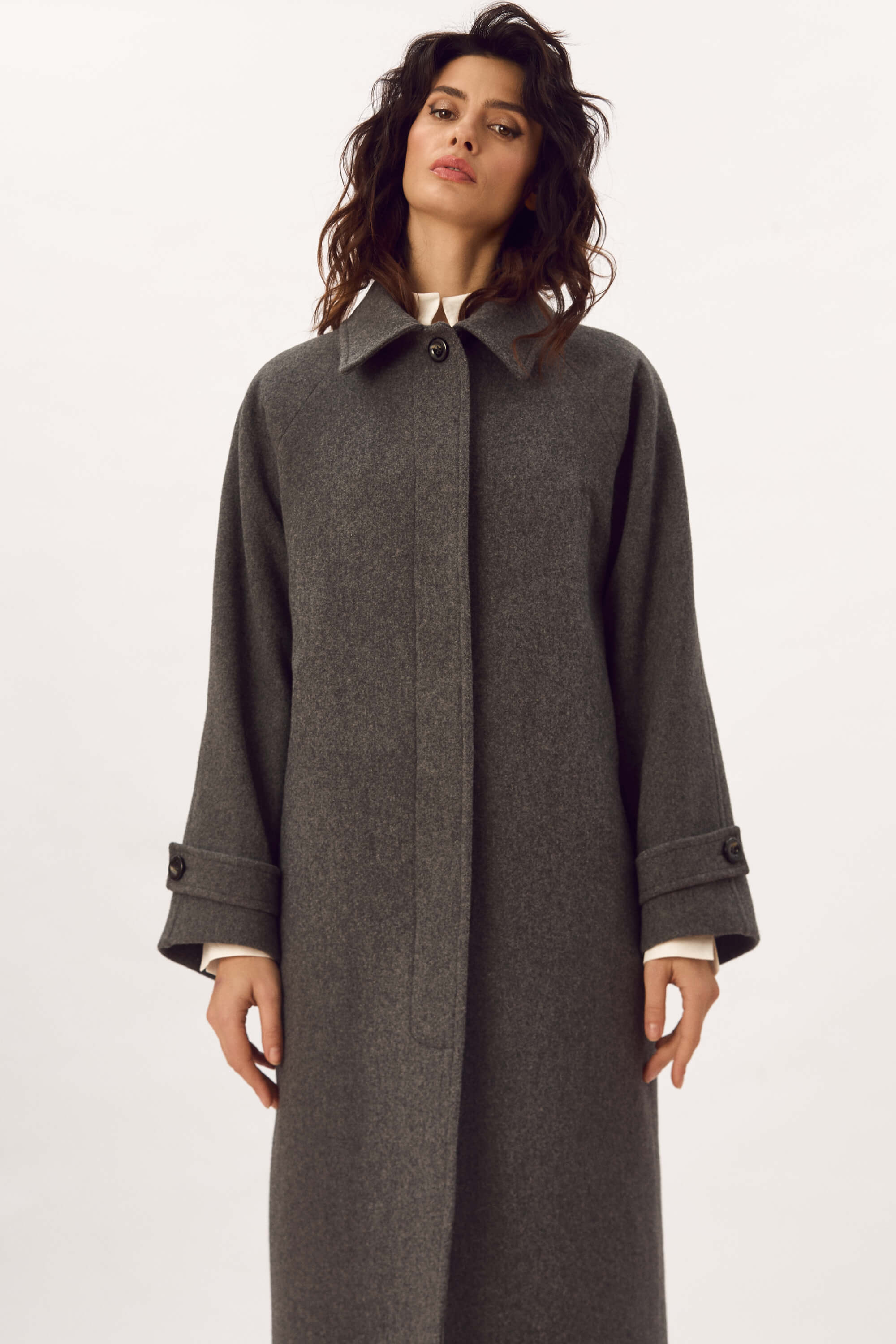 Palton din lana, cu guler si nasturi ascunsi in fata, maneci raglan lungi cu barete cu nasture, buzunare in cusaturile laterale si slit la spate. Captusit.
