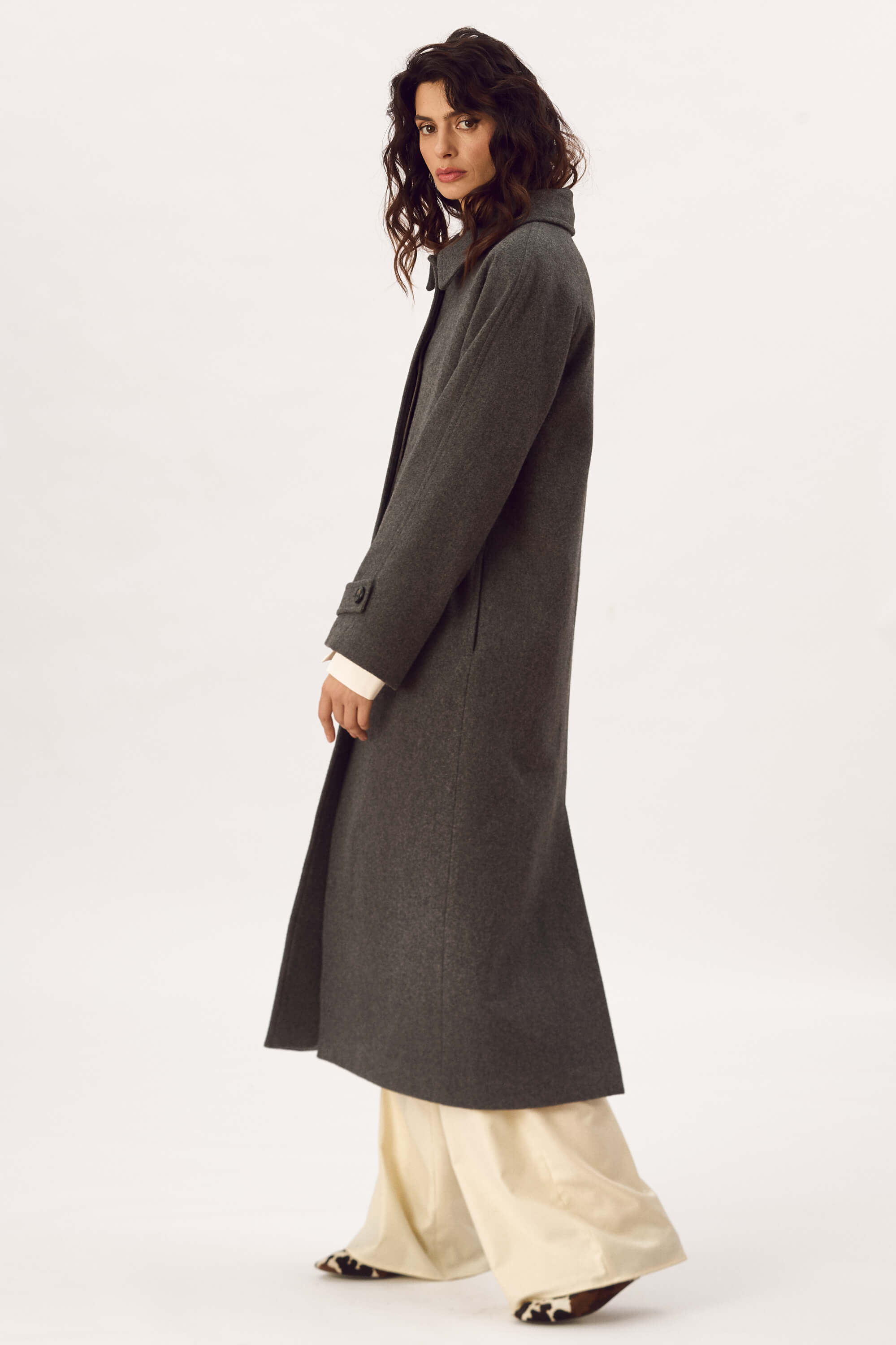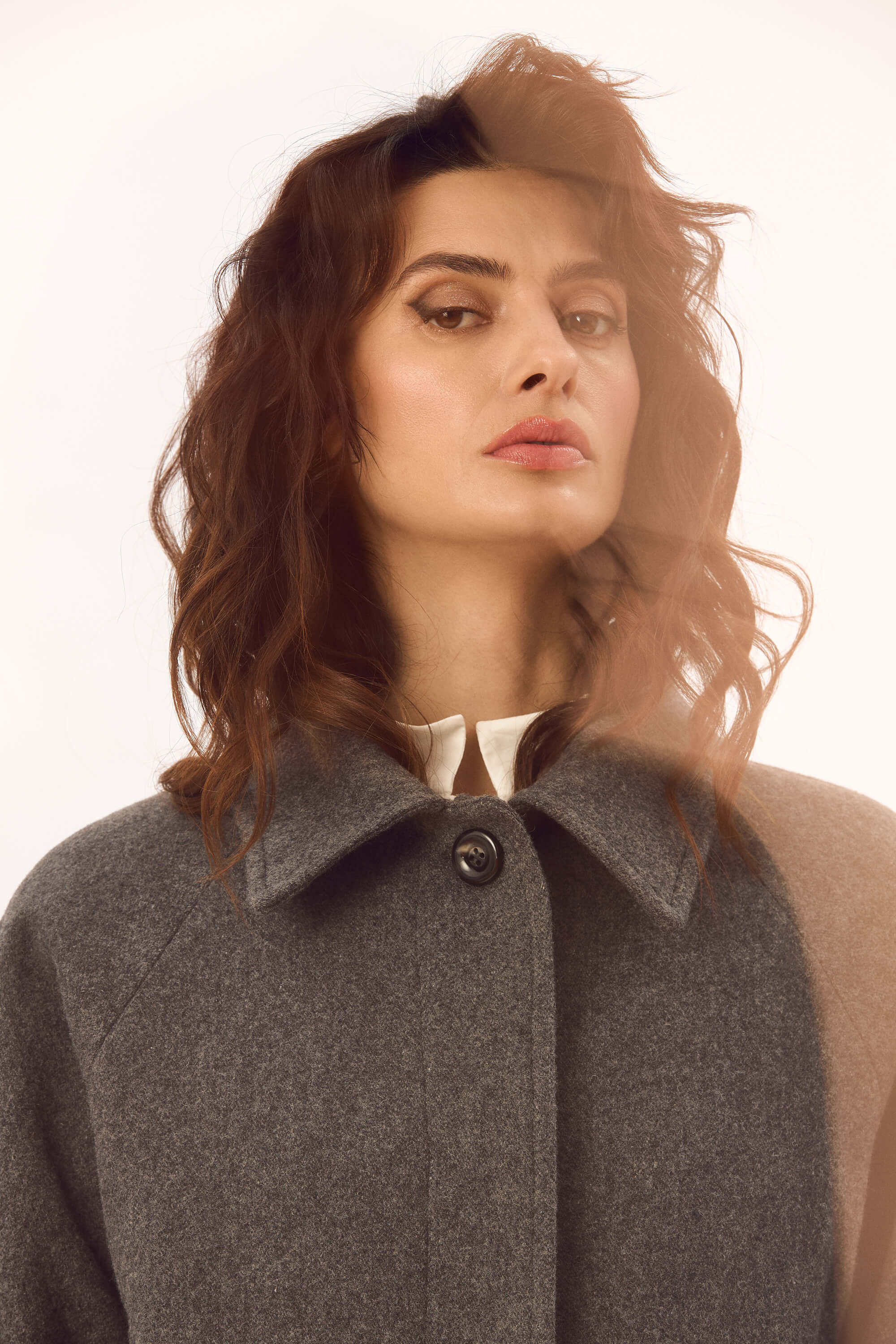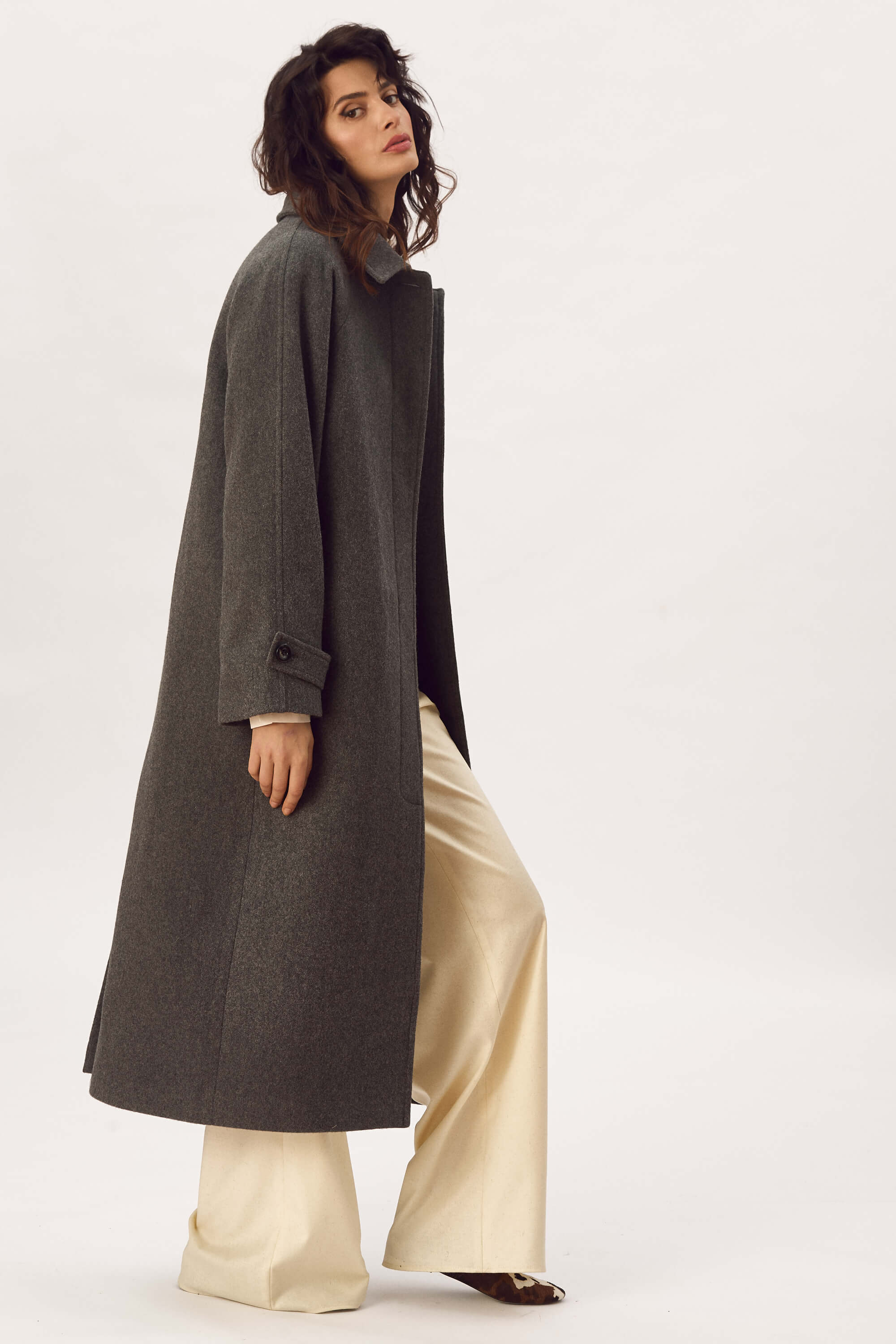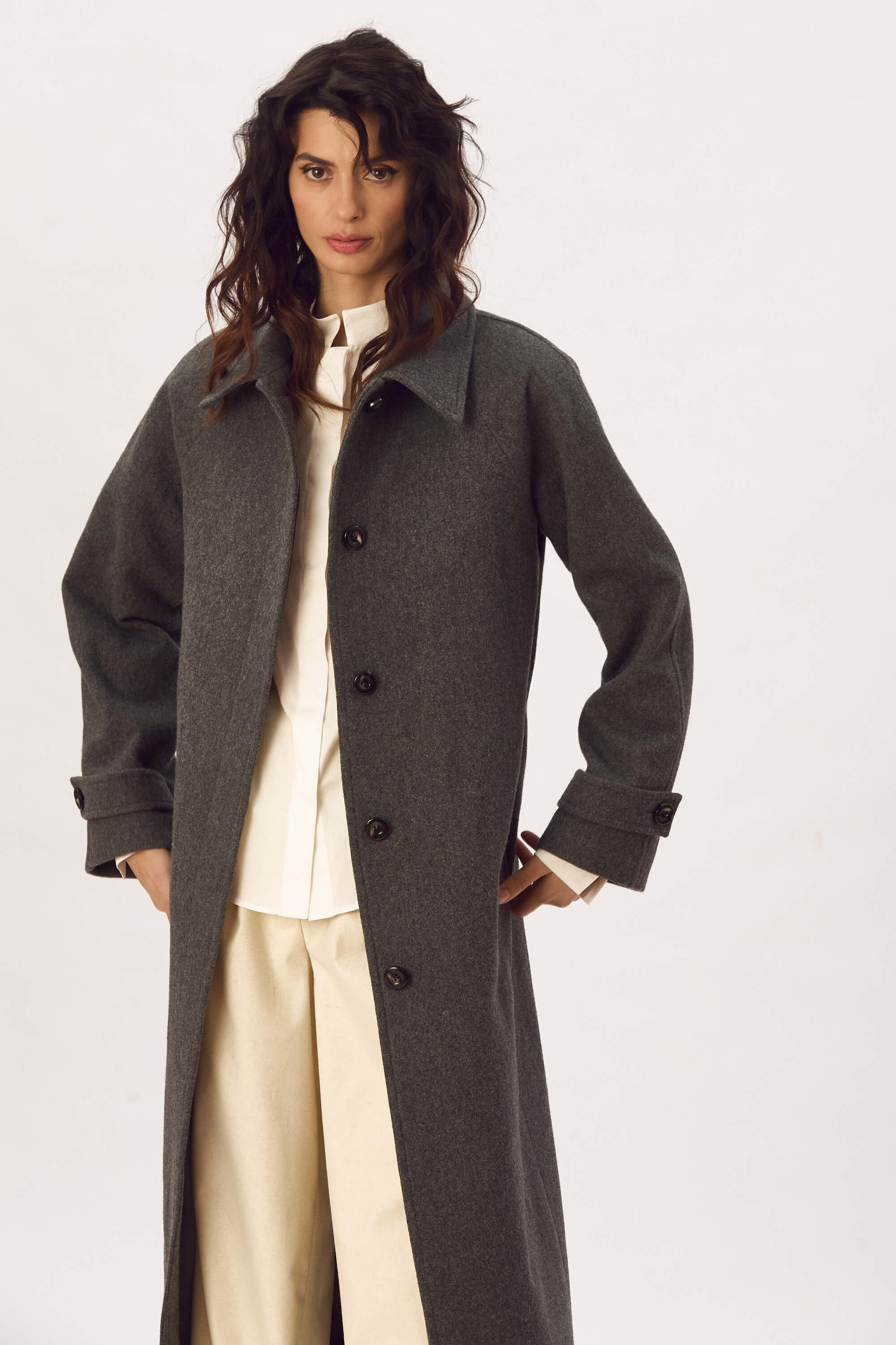 Palton din lana, cu guler si nasturi ascunsi in fata, maneci raglan lungi cu barete cu nasture, buzunare in cusaturile laterale si slit la spate. Captusit.