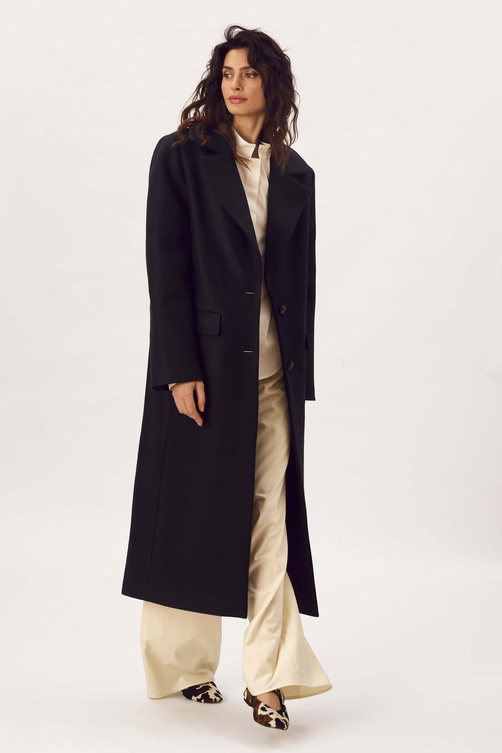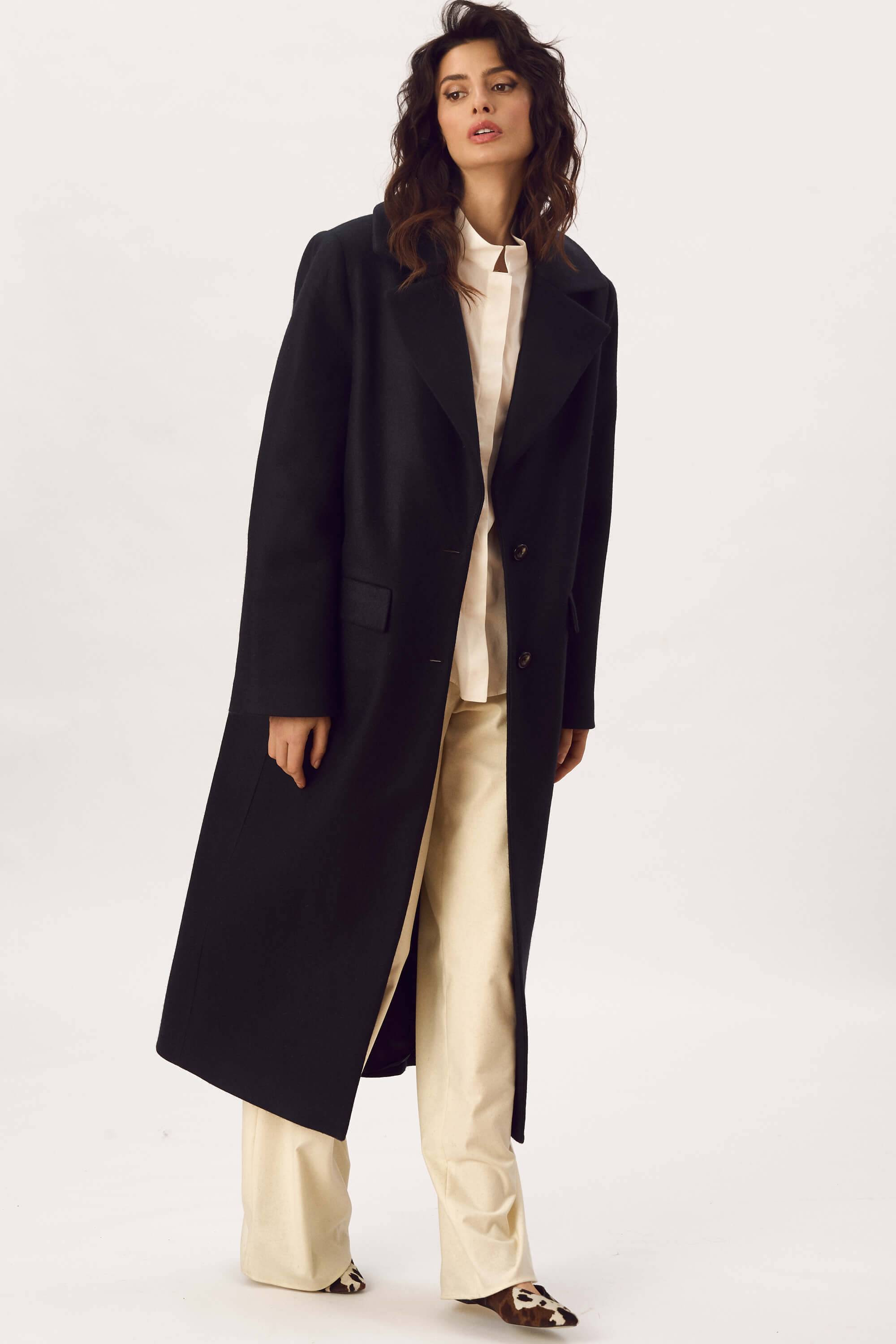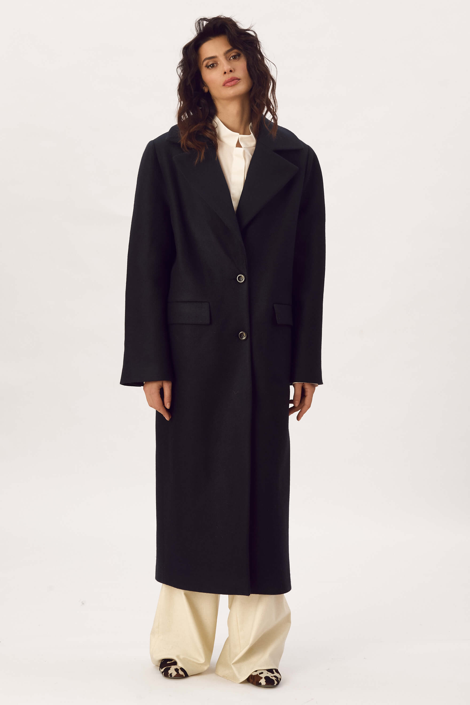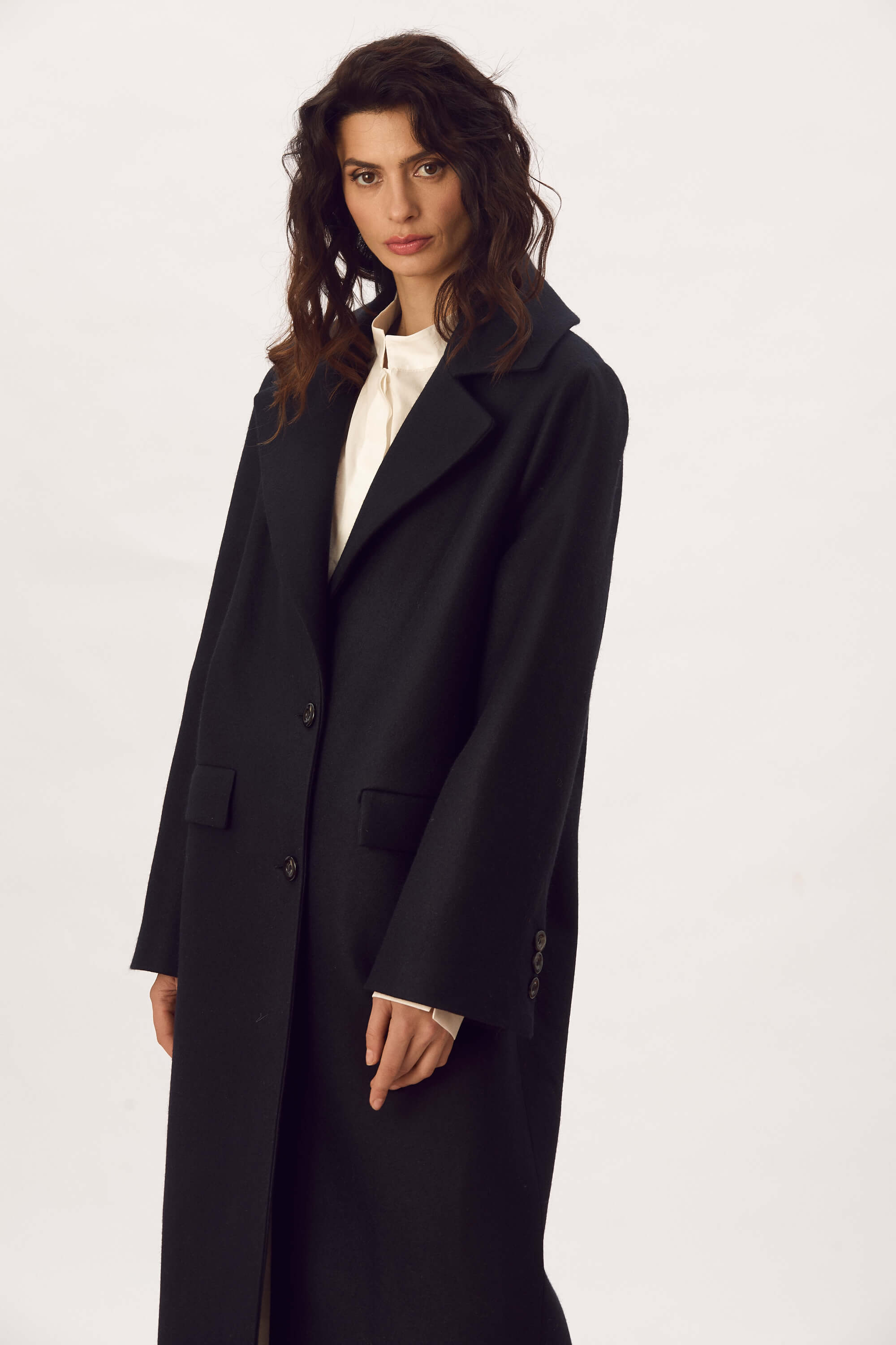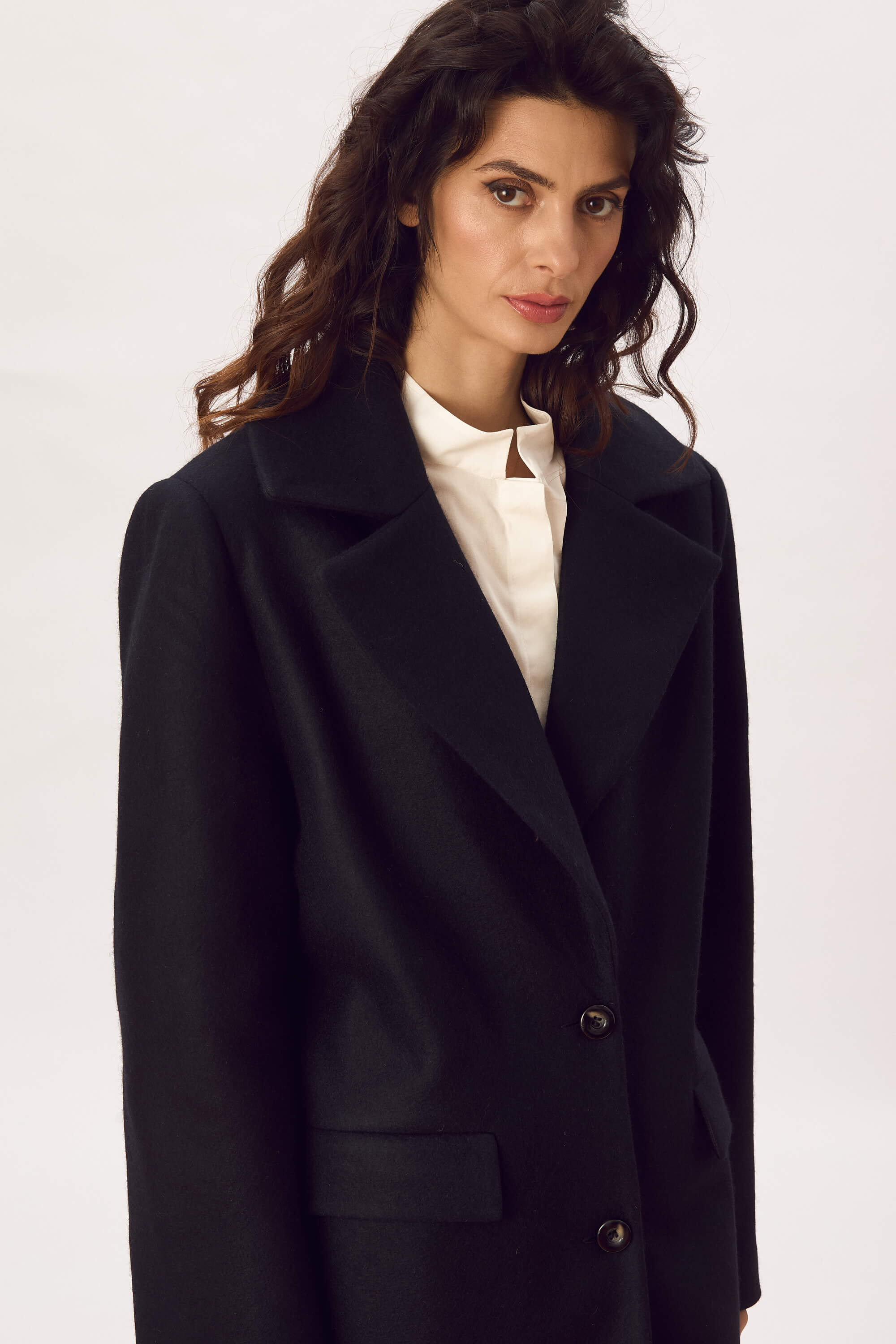 Palton supradimensionat din fetru de lana, la un rand de nasturi, cu revere crestate, buzunare frontale cu clapa, maneci lungi si largi si slit la spate. Captusit.