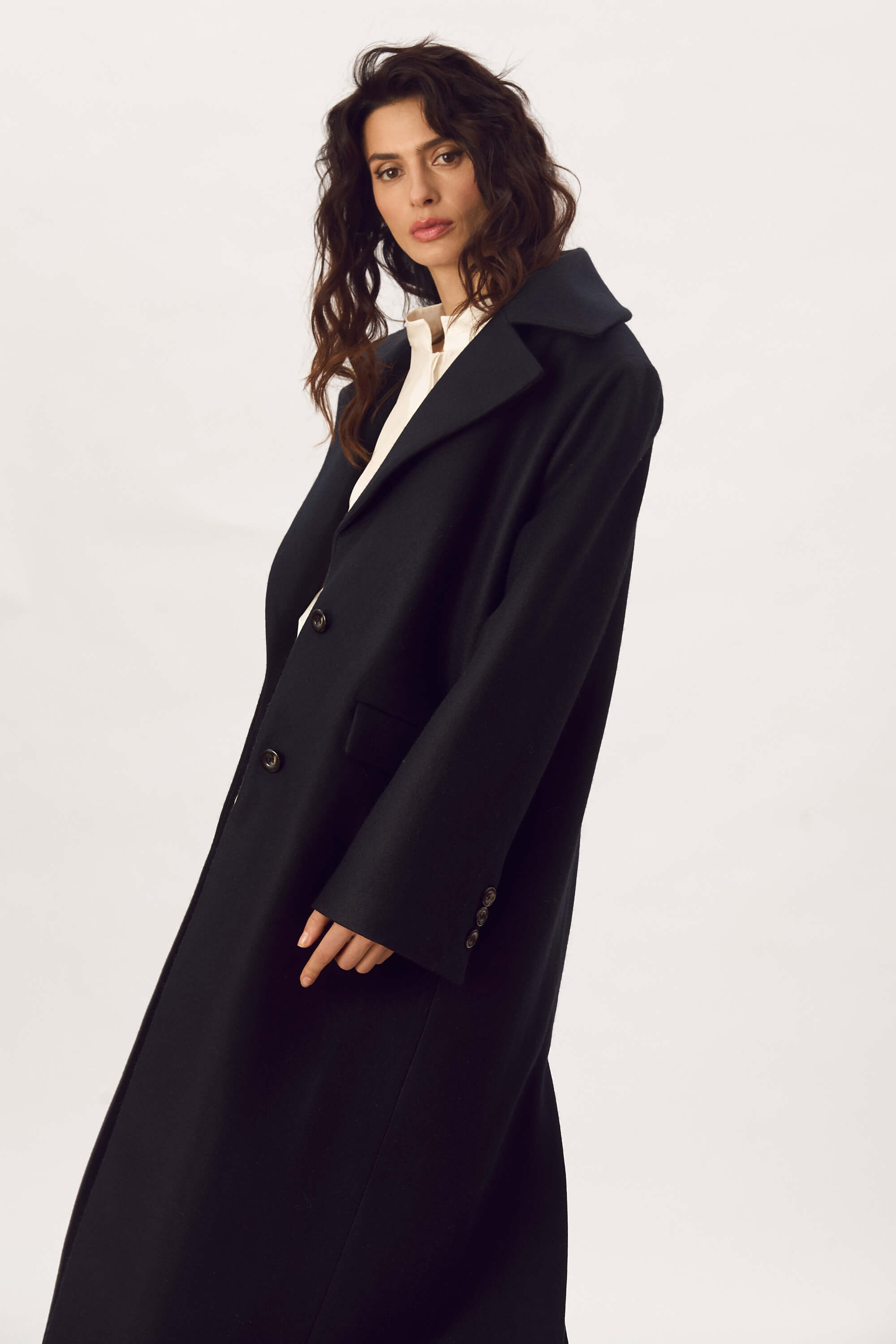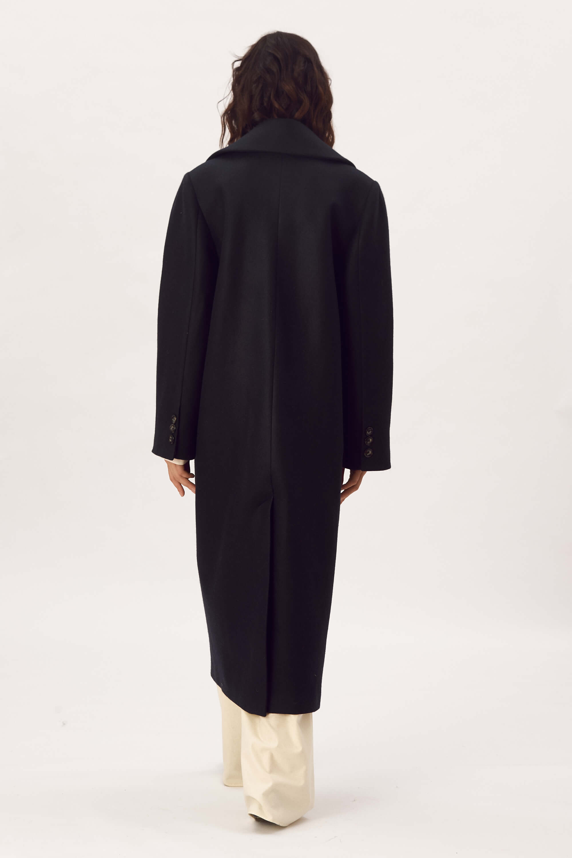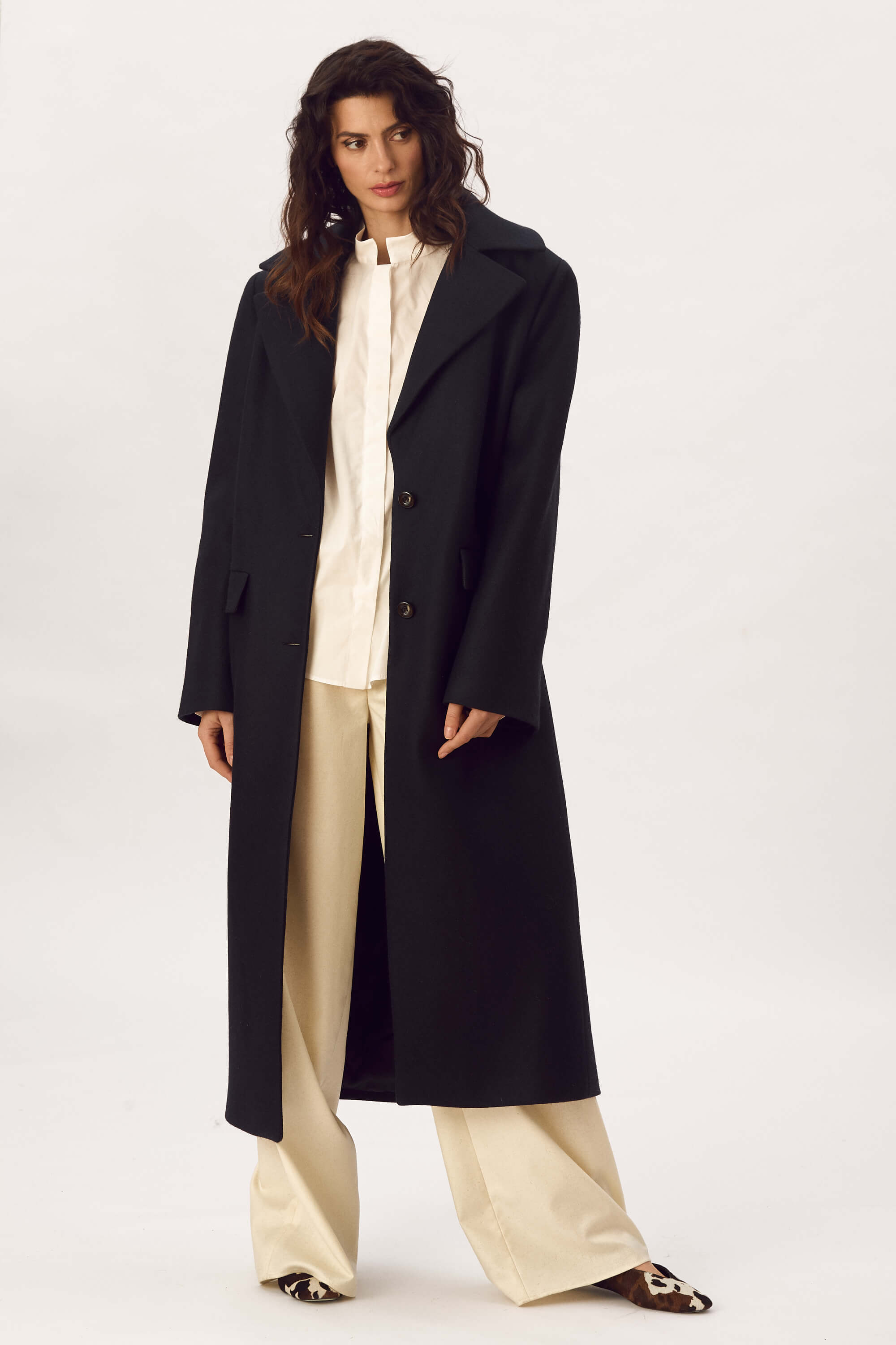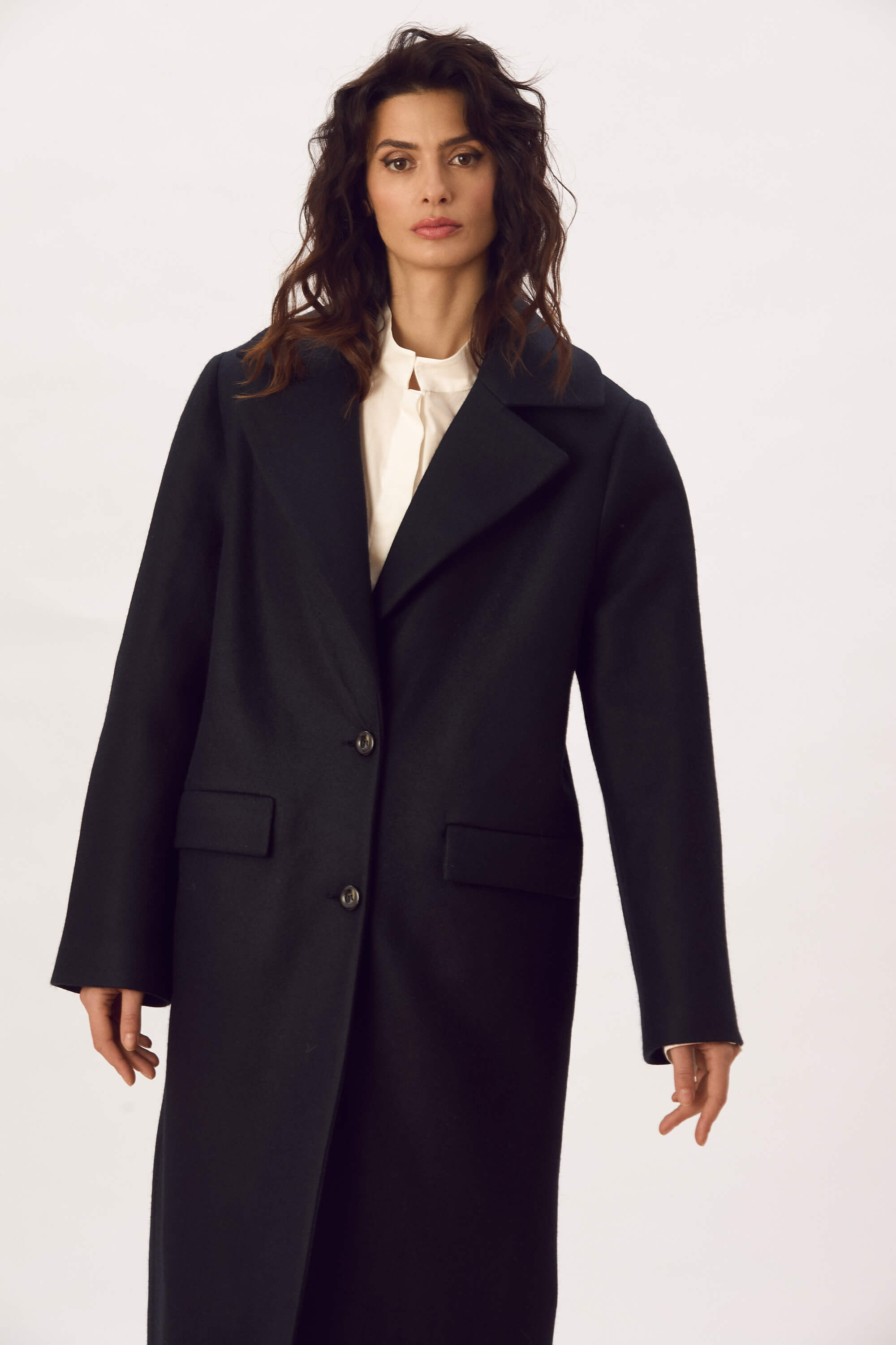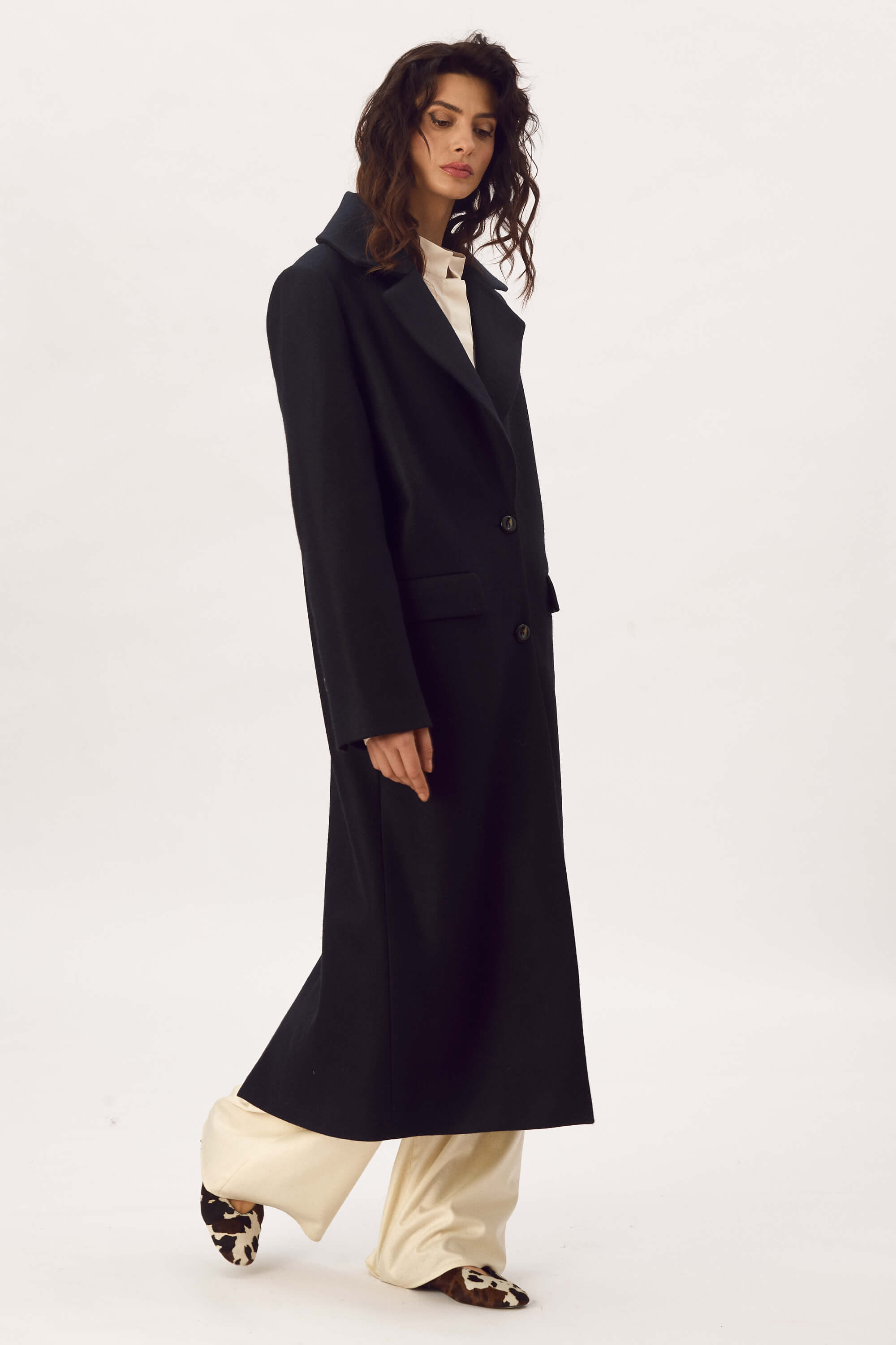 Palton supradimensionat din fetru de lana, la un rand de nasturi, cu revere crestate, buzunare frontale cu clapa, maneci lungi si largi si slit la spate. Captusit.