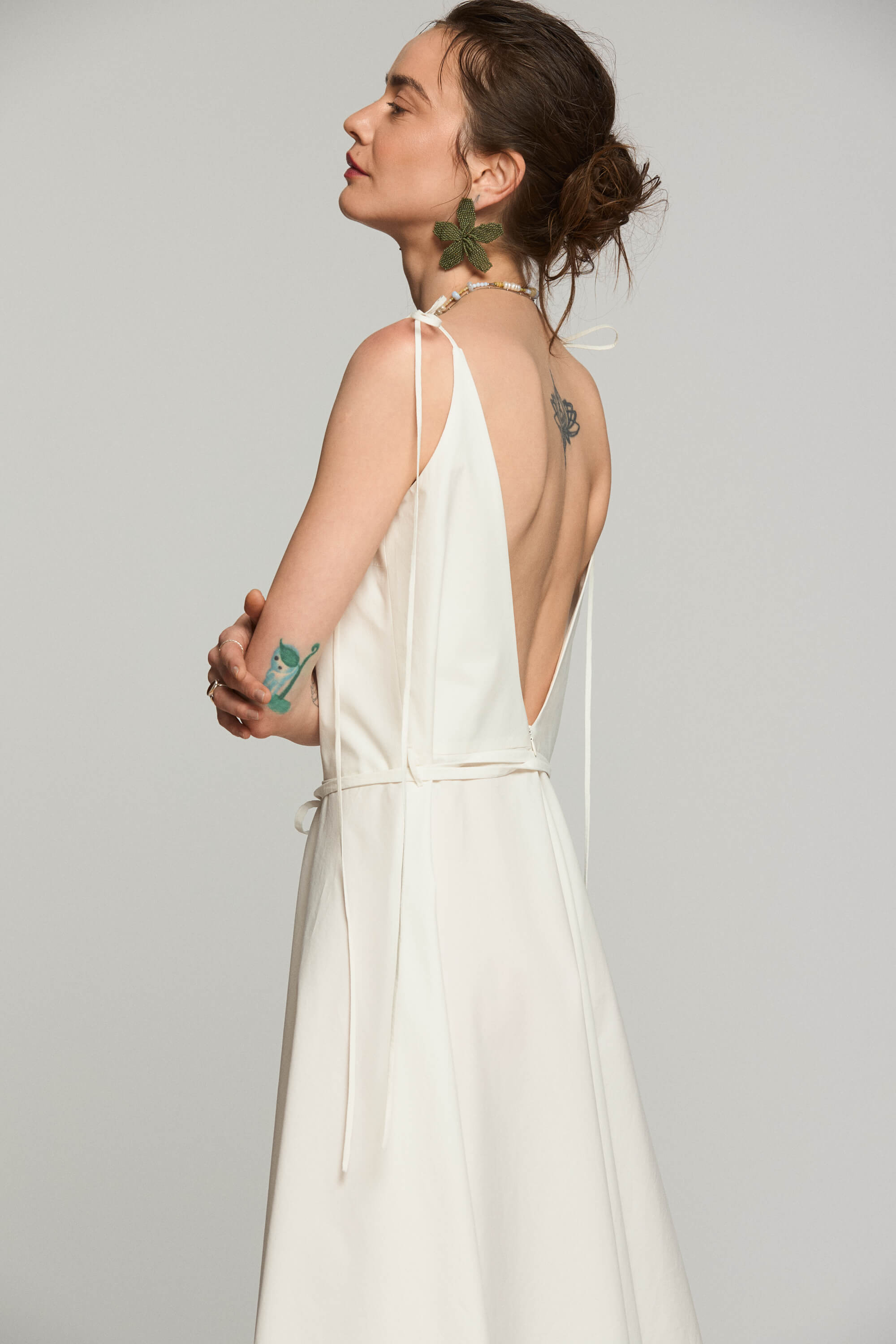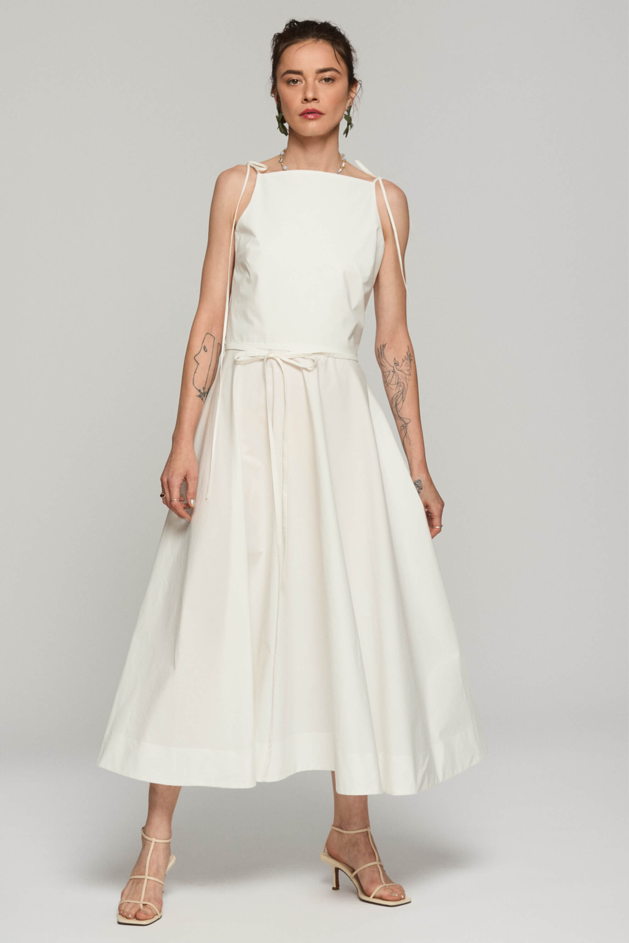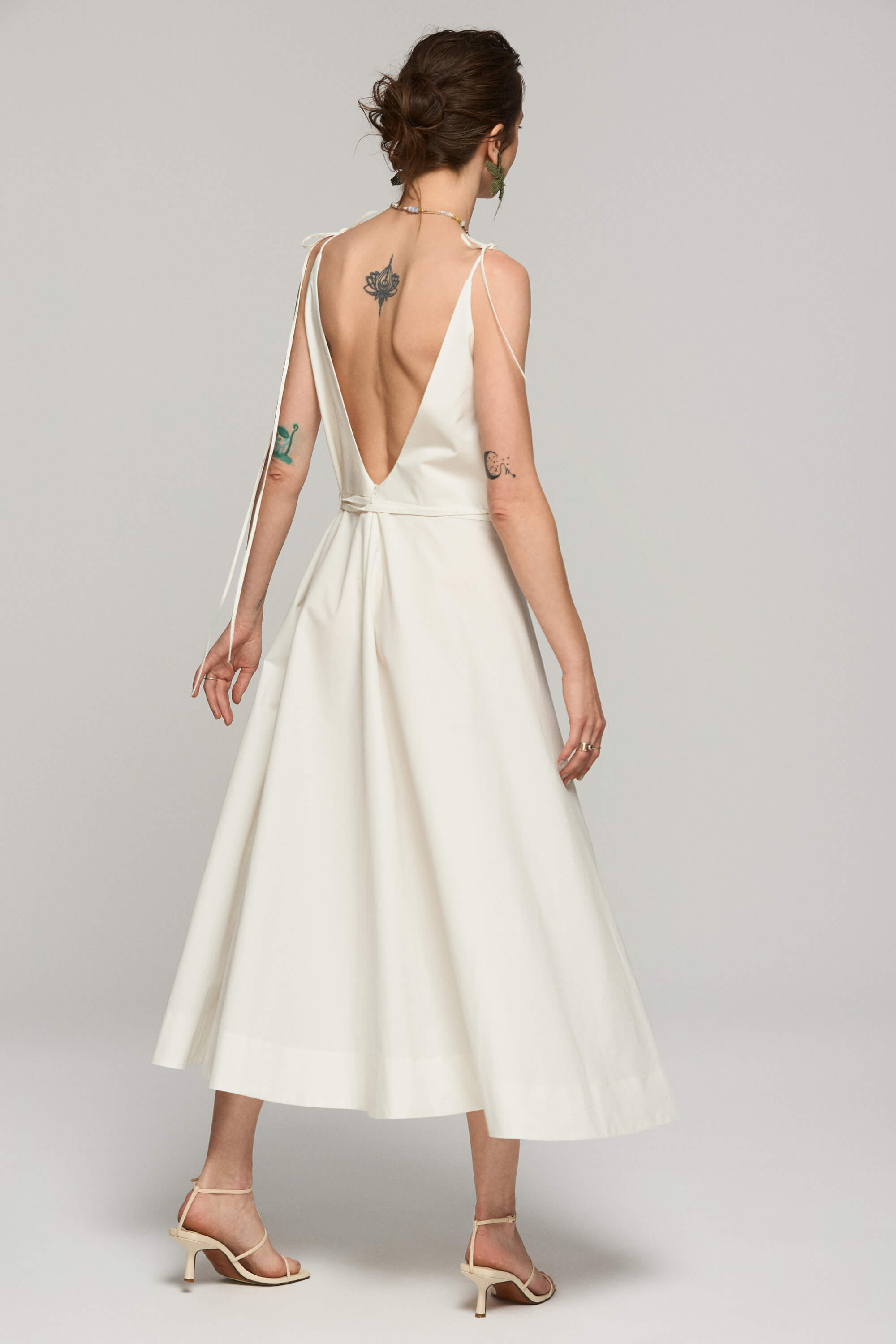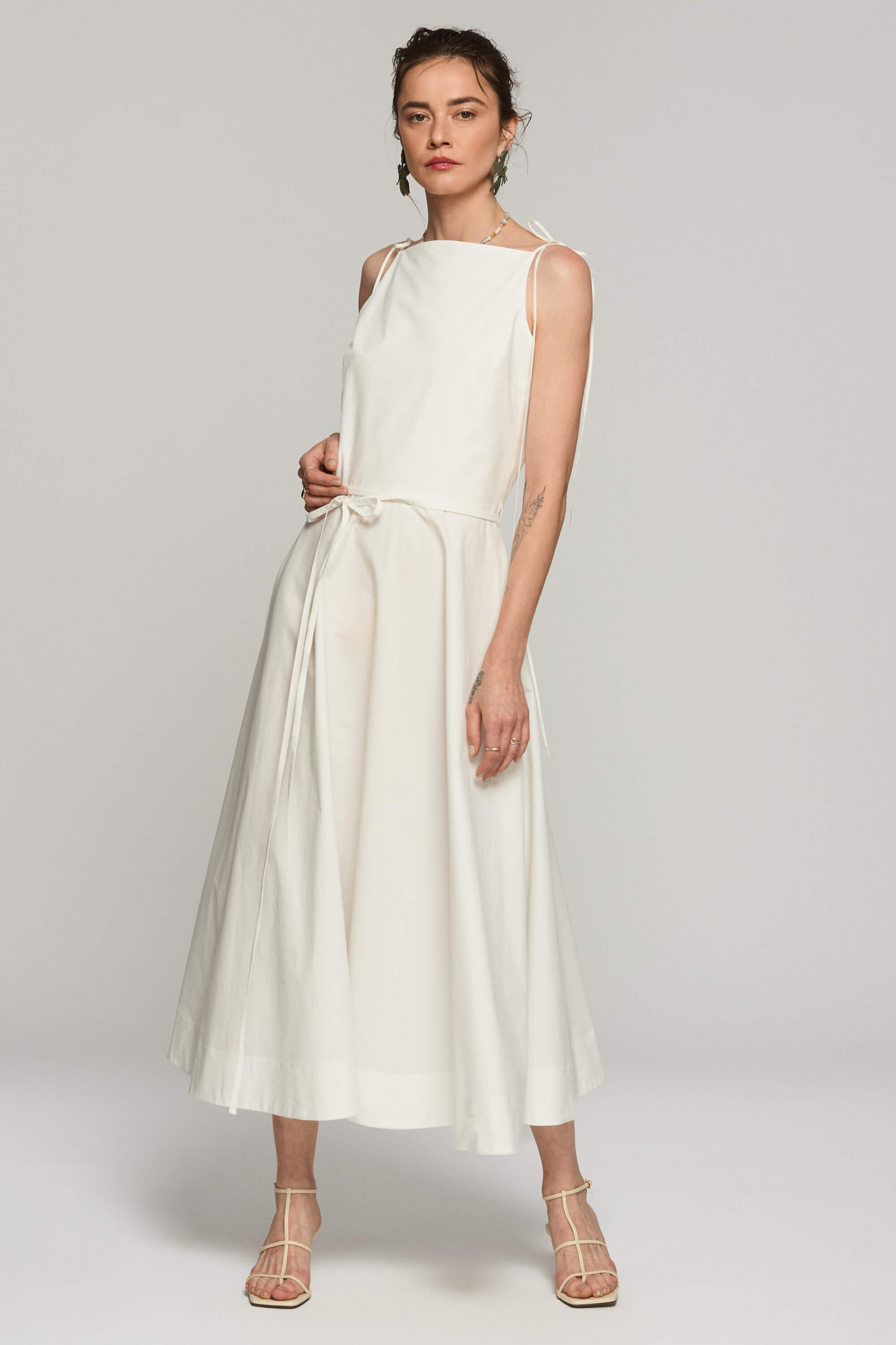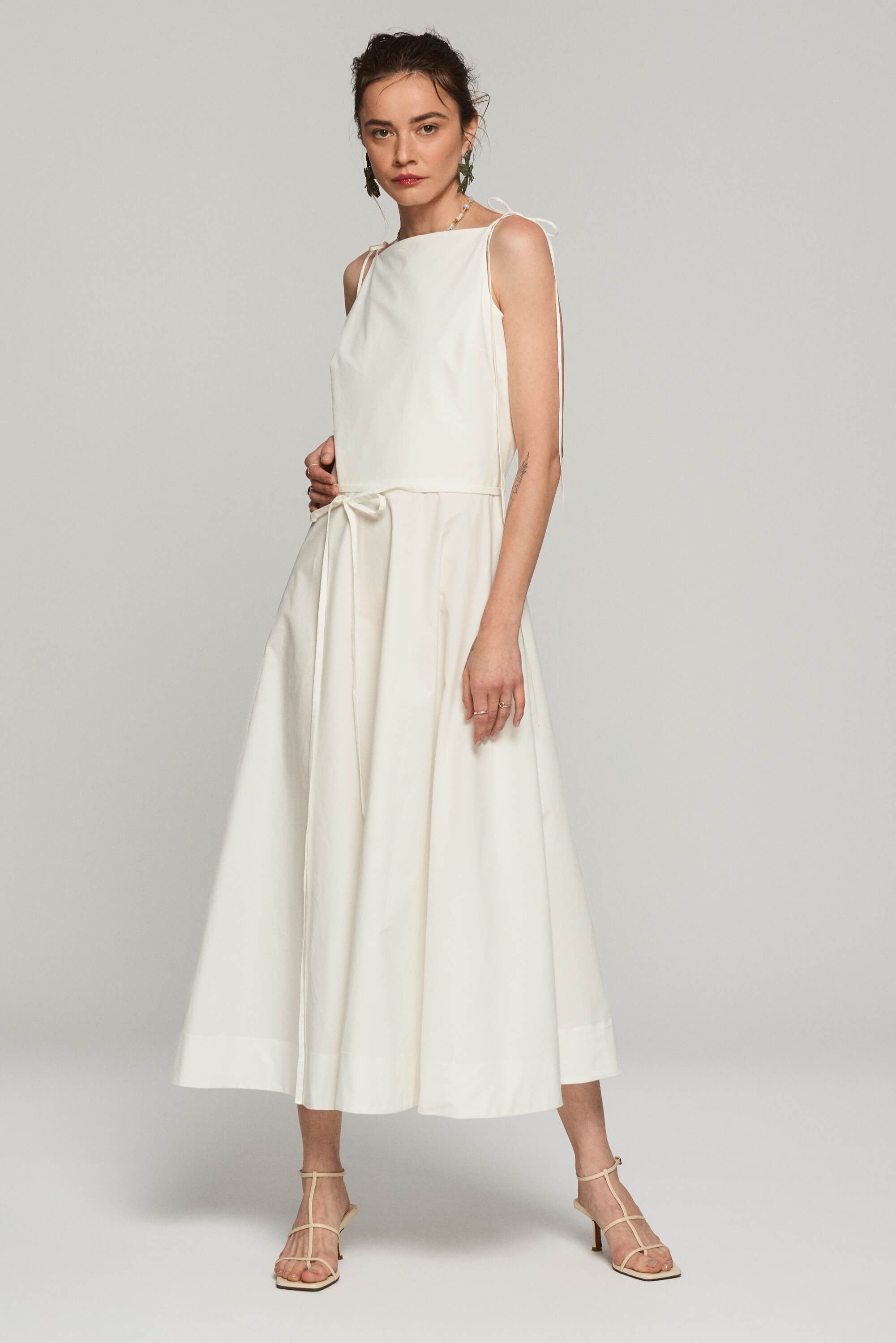 Rochie midi din bumbac, cu decolteu drept la fata, decolteu adanc la spate cu snururi ce se leaga pe umar, cordon ingust in talie si fermoar ascuns la spate.