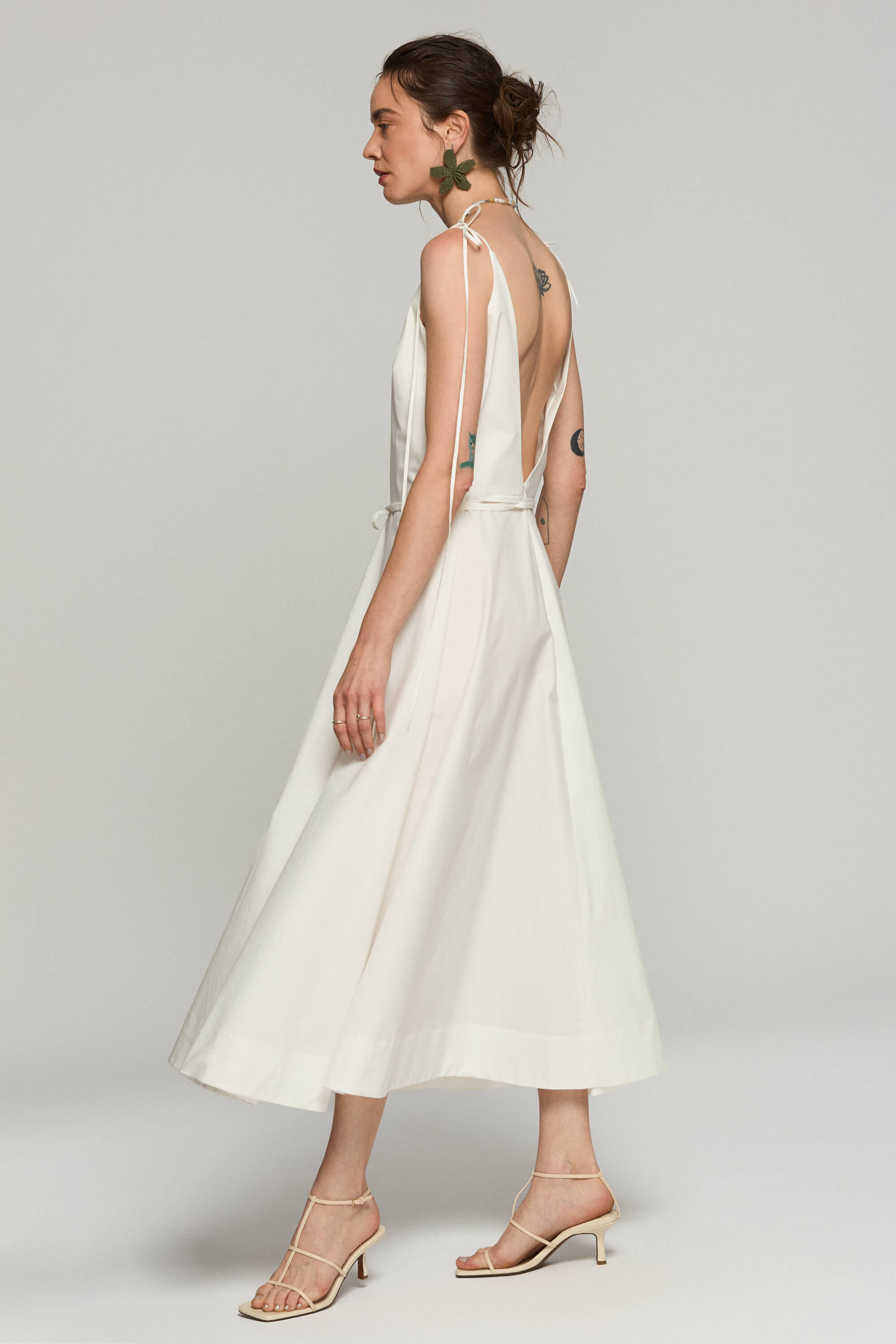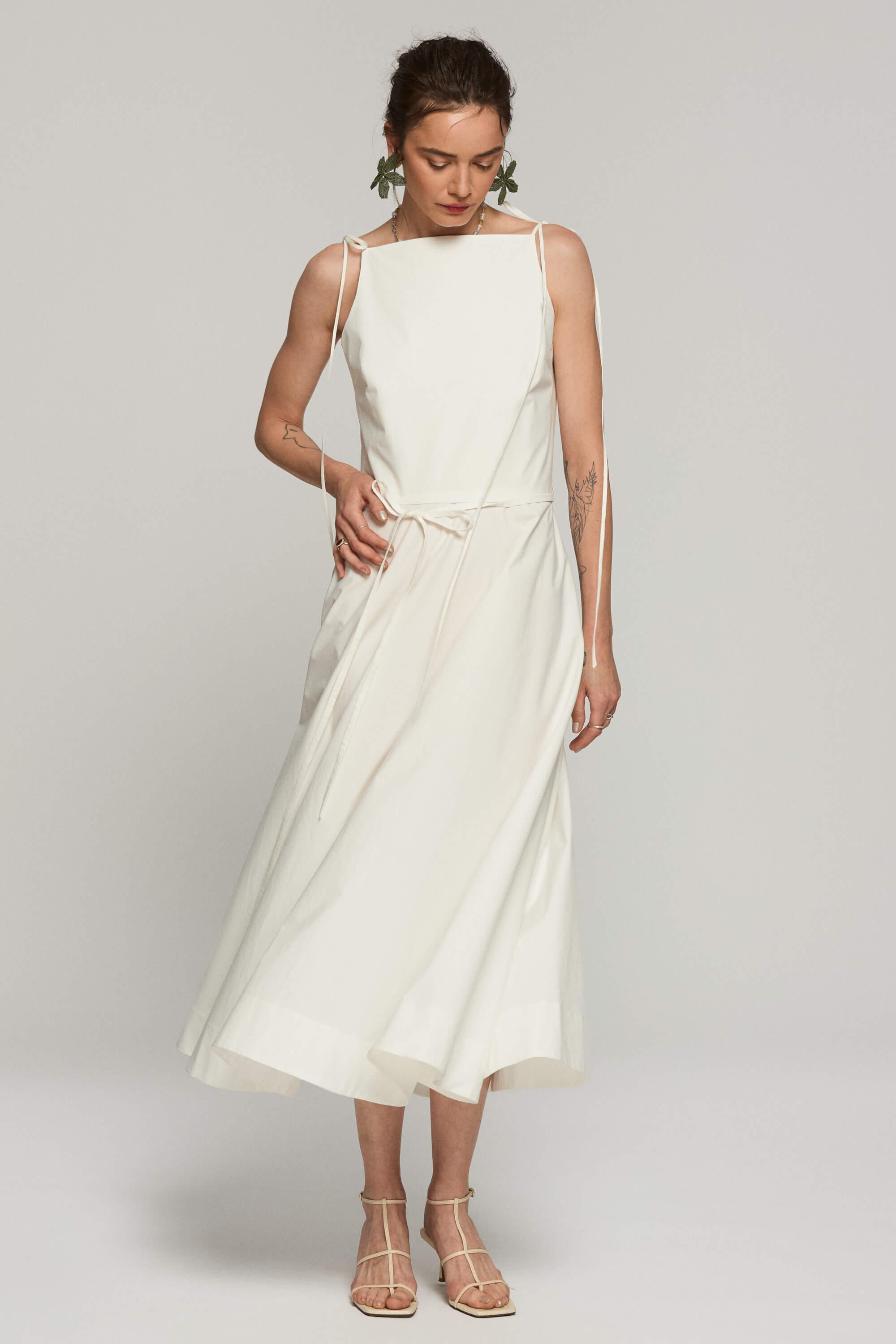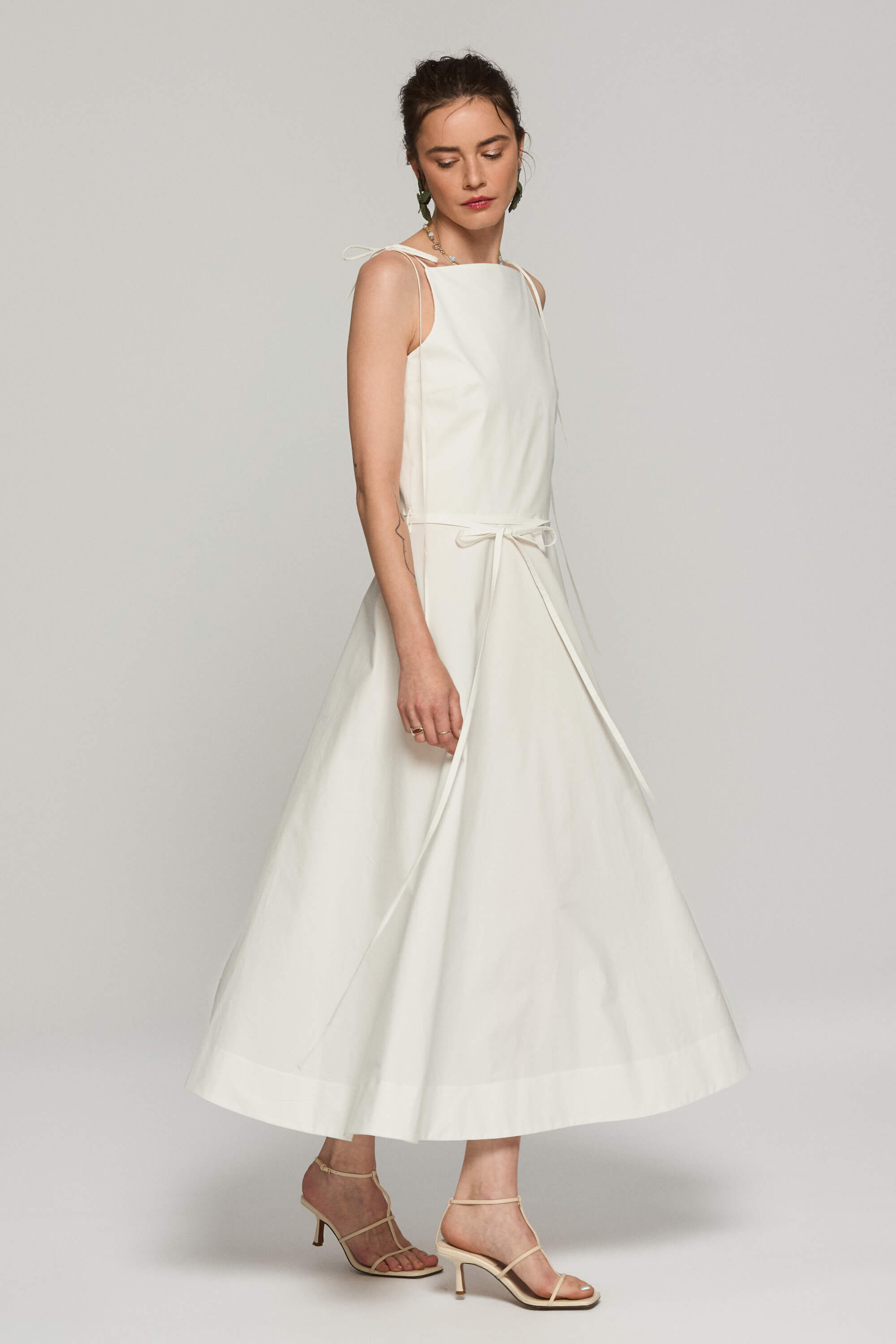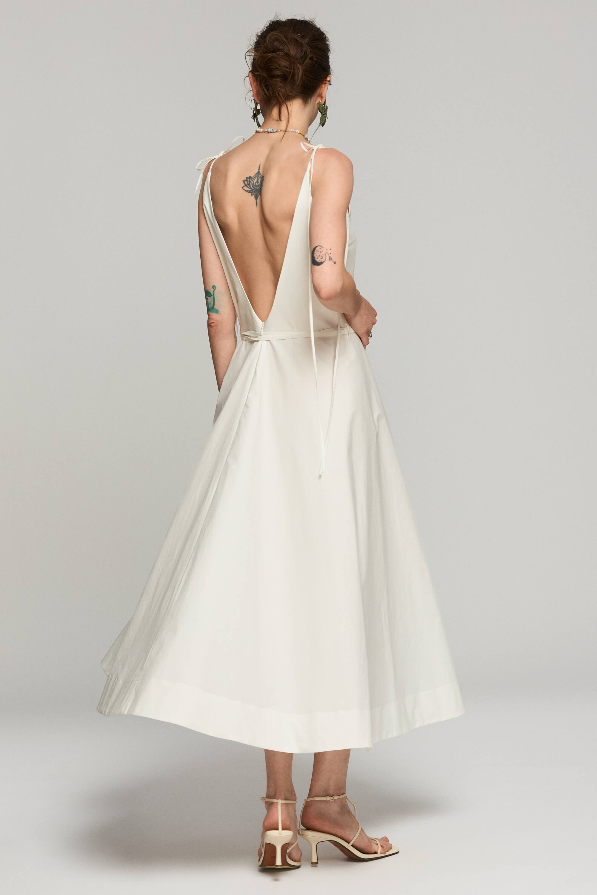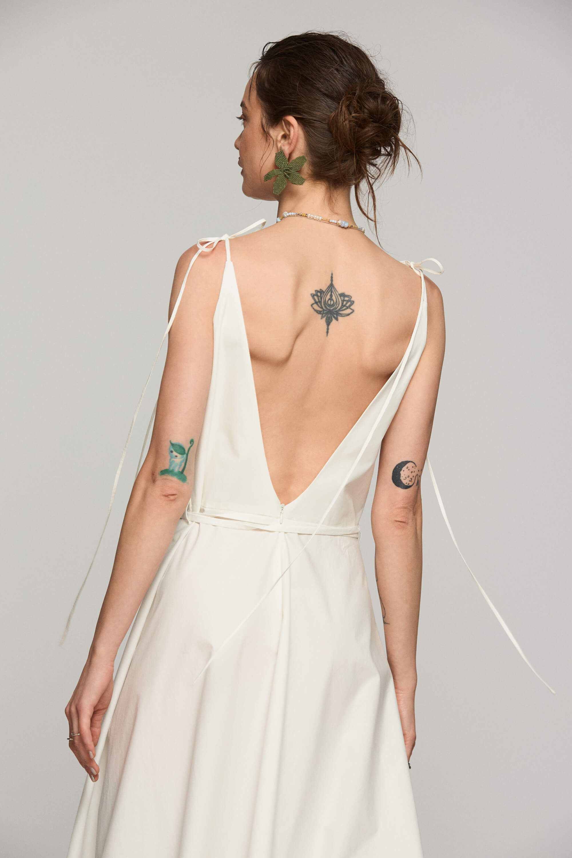 Rochie midi din bumbac, cu decolteu drept la fata, decolteu adanc la spate cu snururi ce se leaga pe umar, cordon ingust in talie si fermoar ascuns la spate.