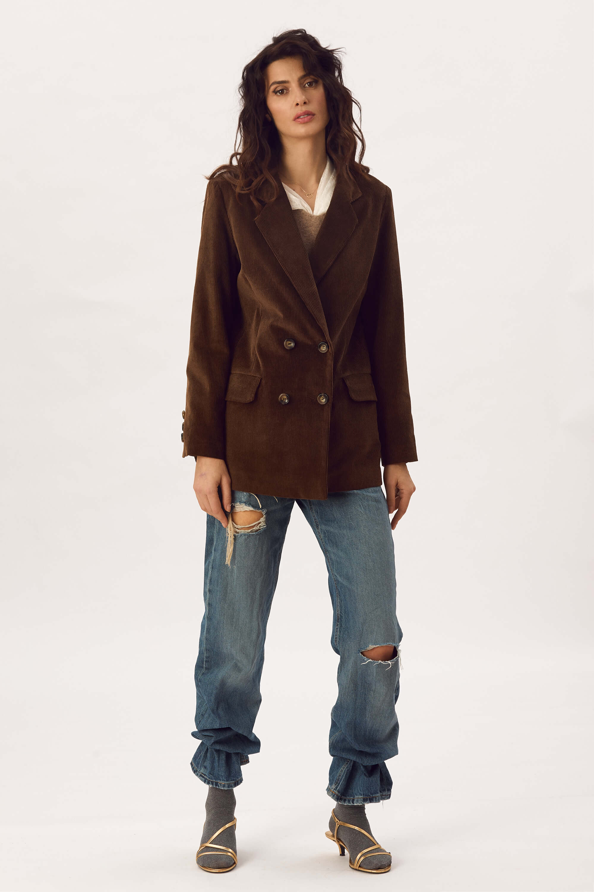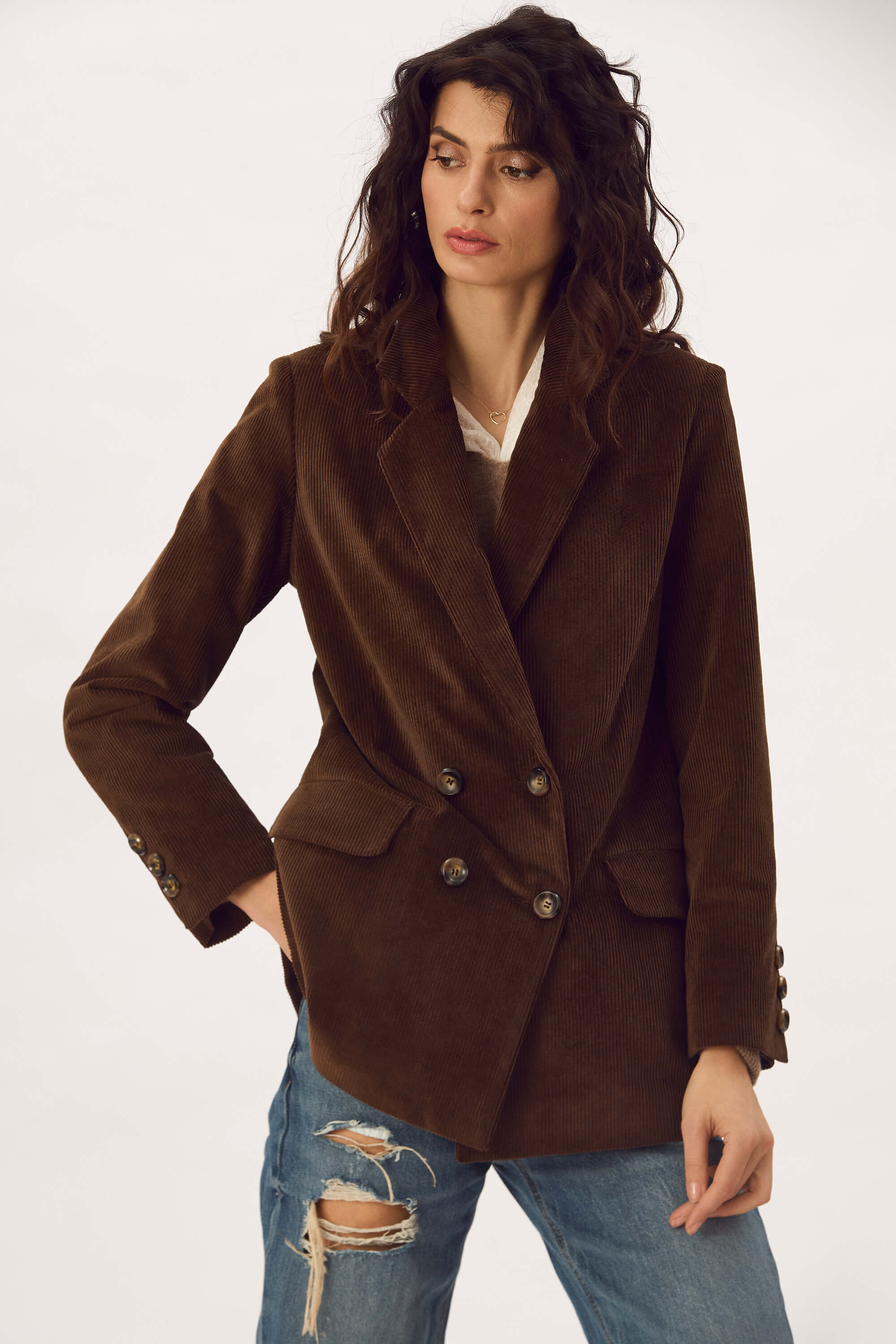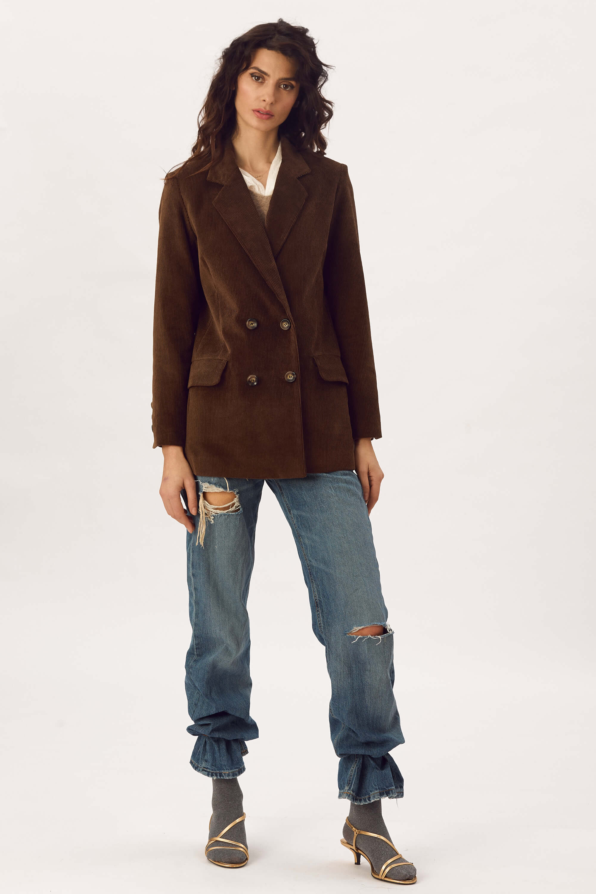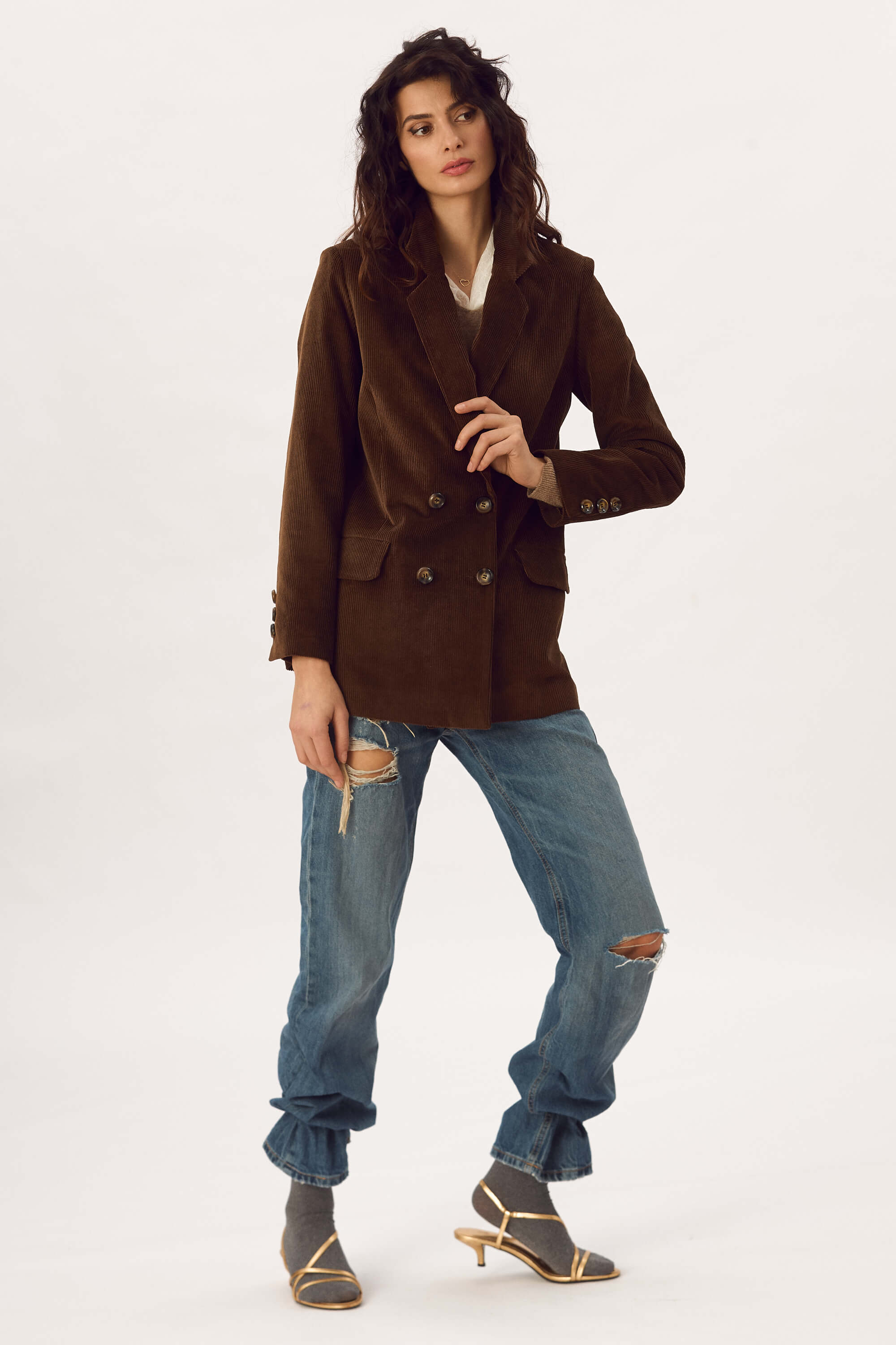 Sacou drept din catifea reiata de bumbac, la doua randuri de nasturi, cu guler si revere crestate, buzunare frontale cu clapa si slit la spate. Captusit.
