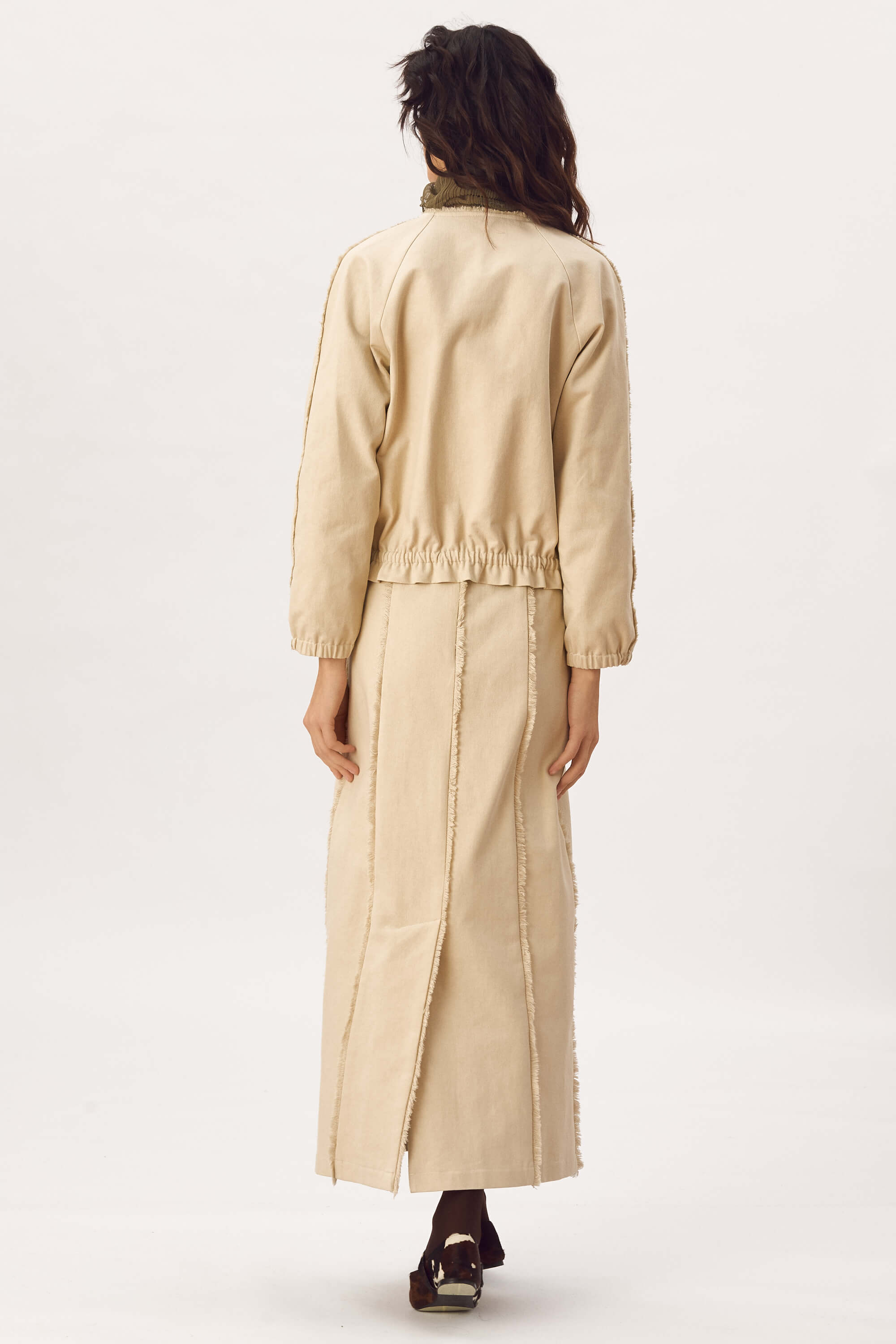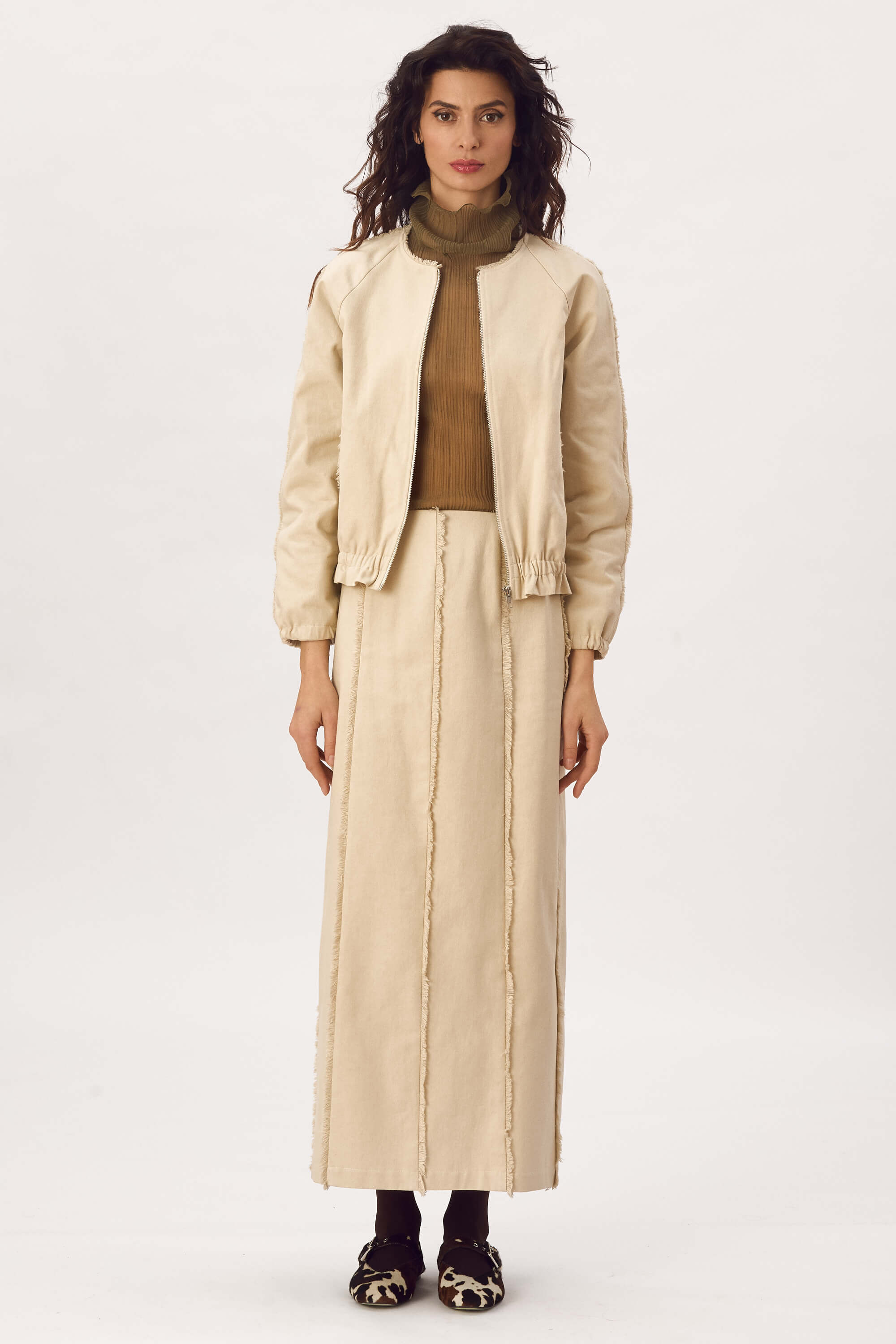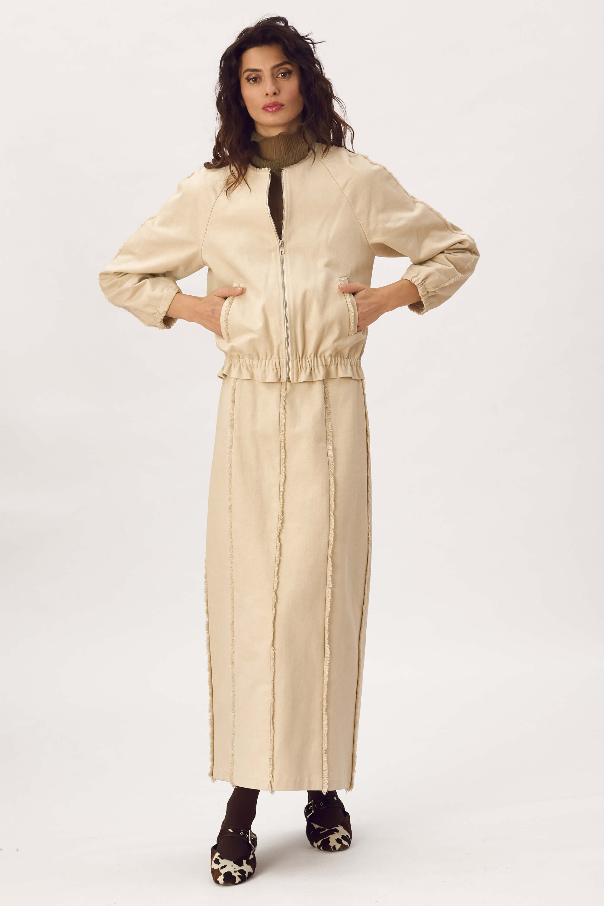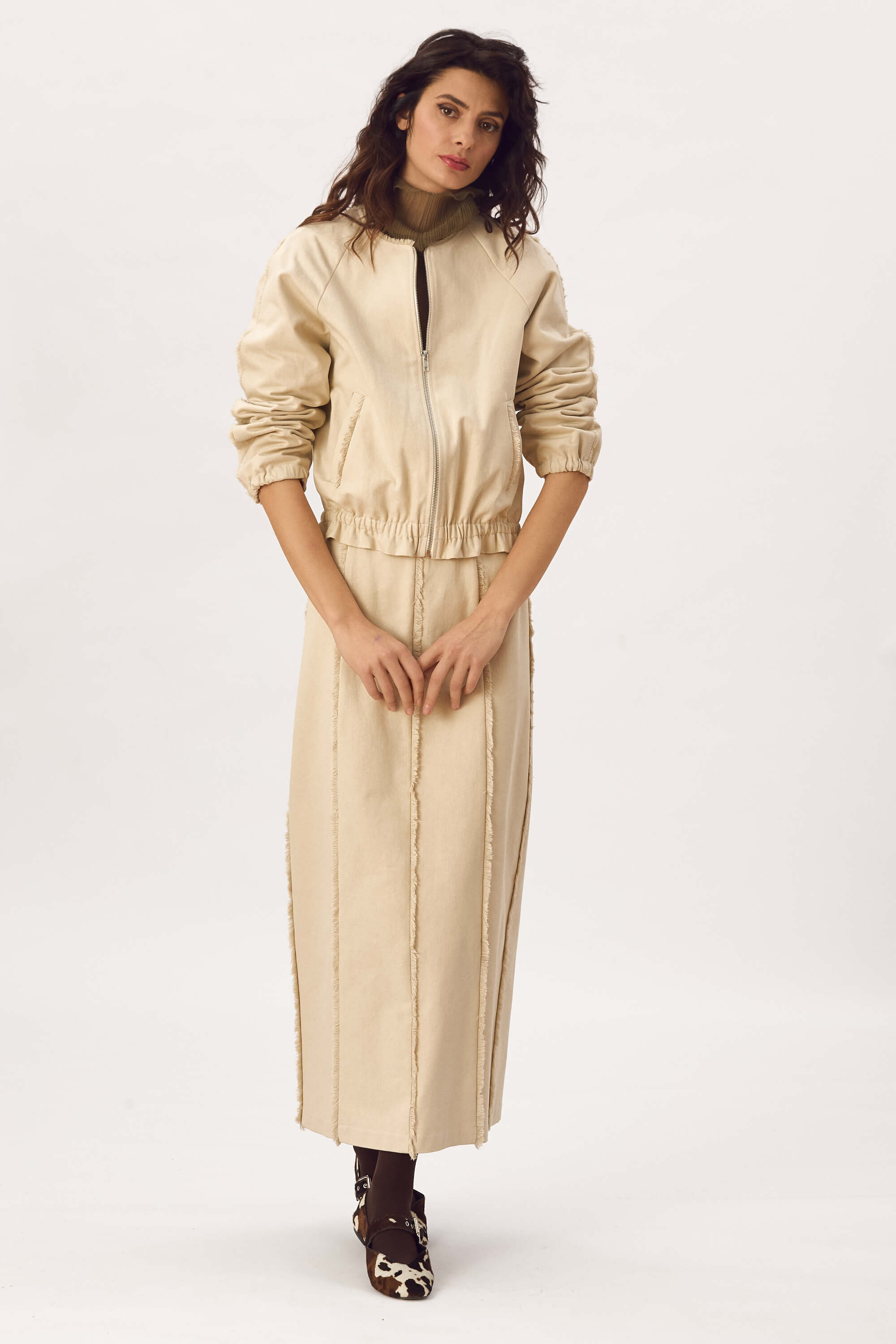 Jacheta tip bomber, din bumbac cu franjuri decorativi in jurul gatului, pe maneci si la buzunare, inchidere cu fermoar, maneci raglan, buzunare cu refilet si elastic imbracat la mansete si la baza. Captusit. Fusta lunga din bumbac cu franjuri decorativi, fara buzunare, inchidere cu fermoar la spate si slit la spate.