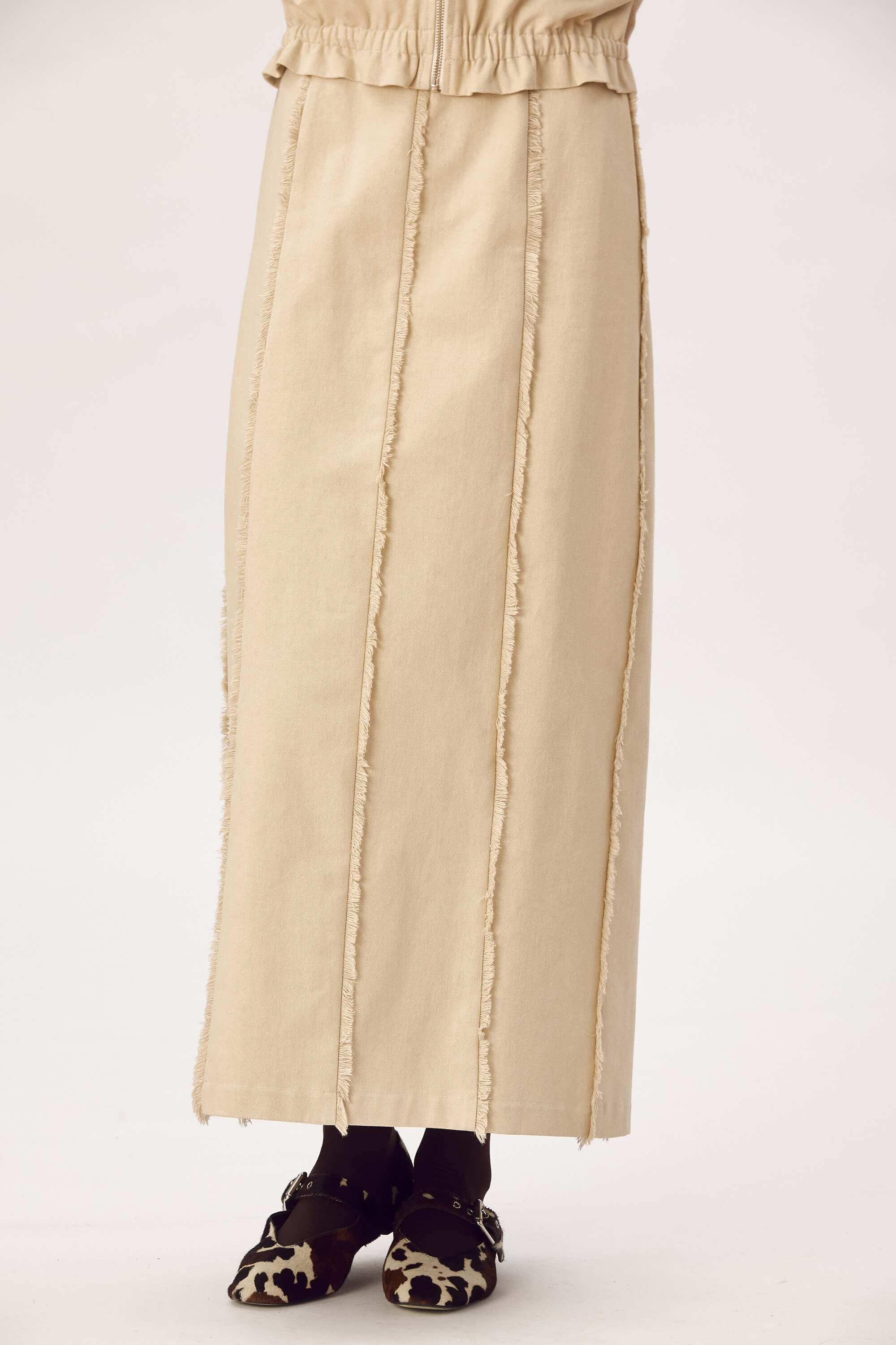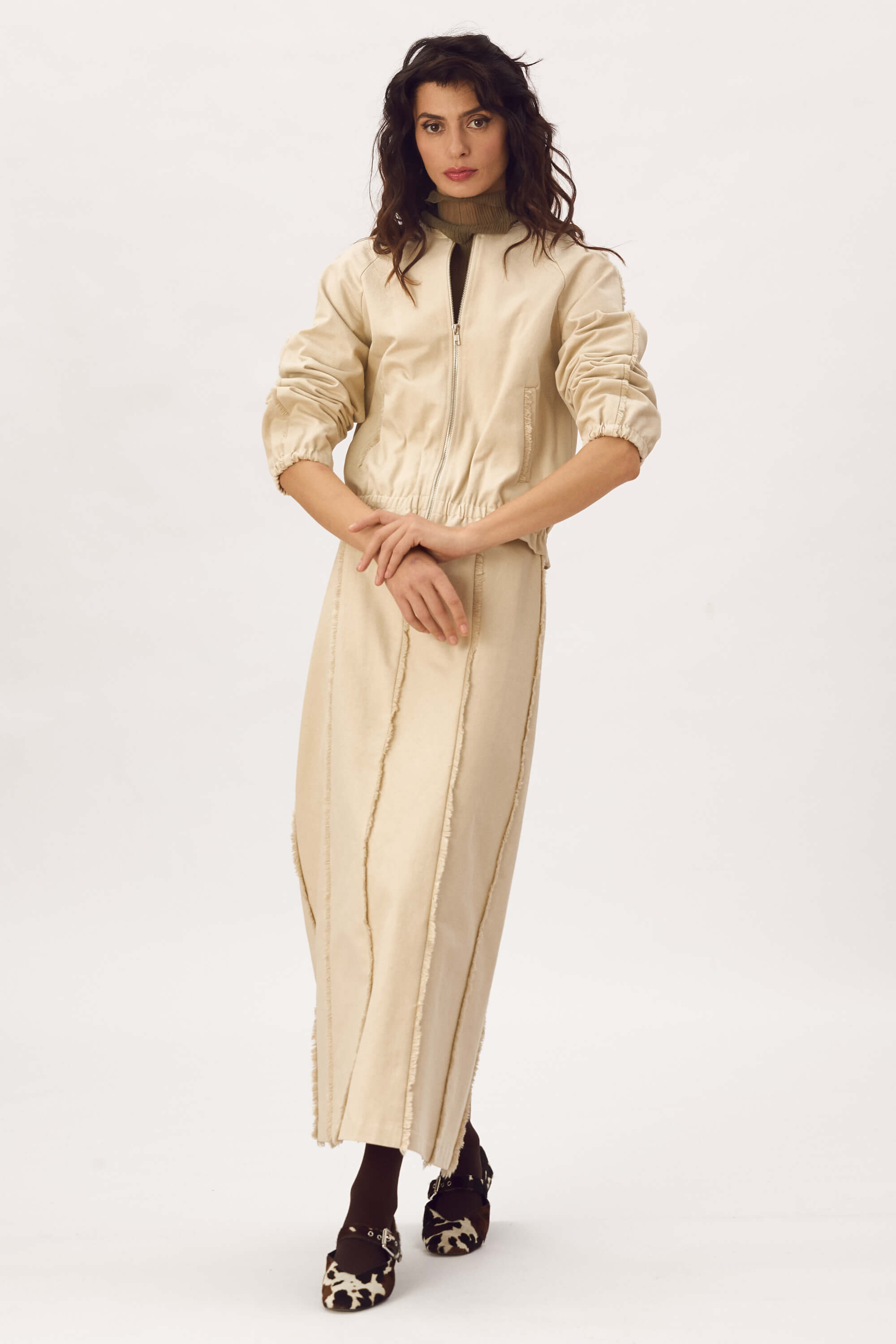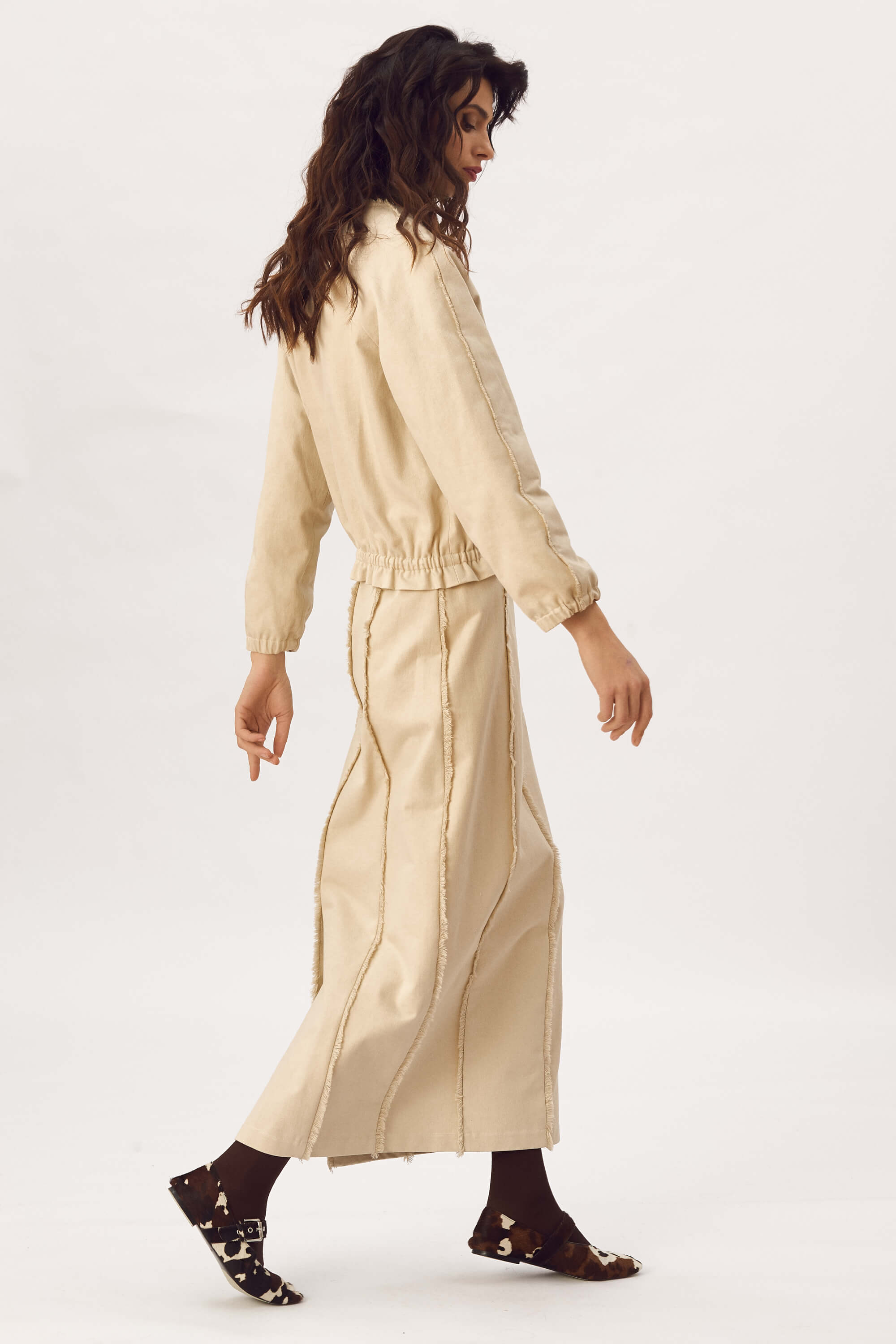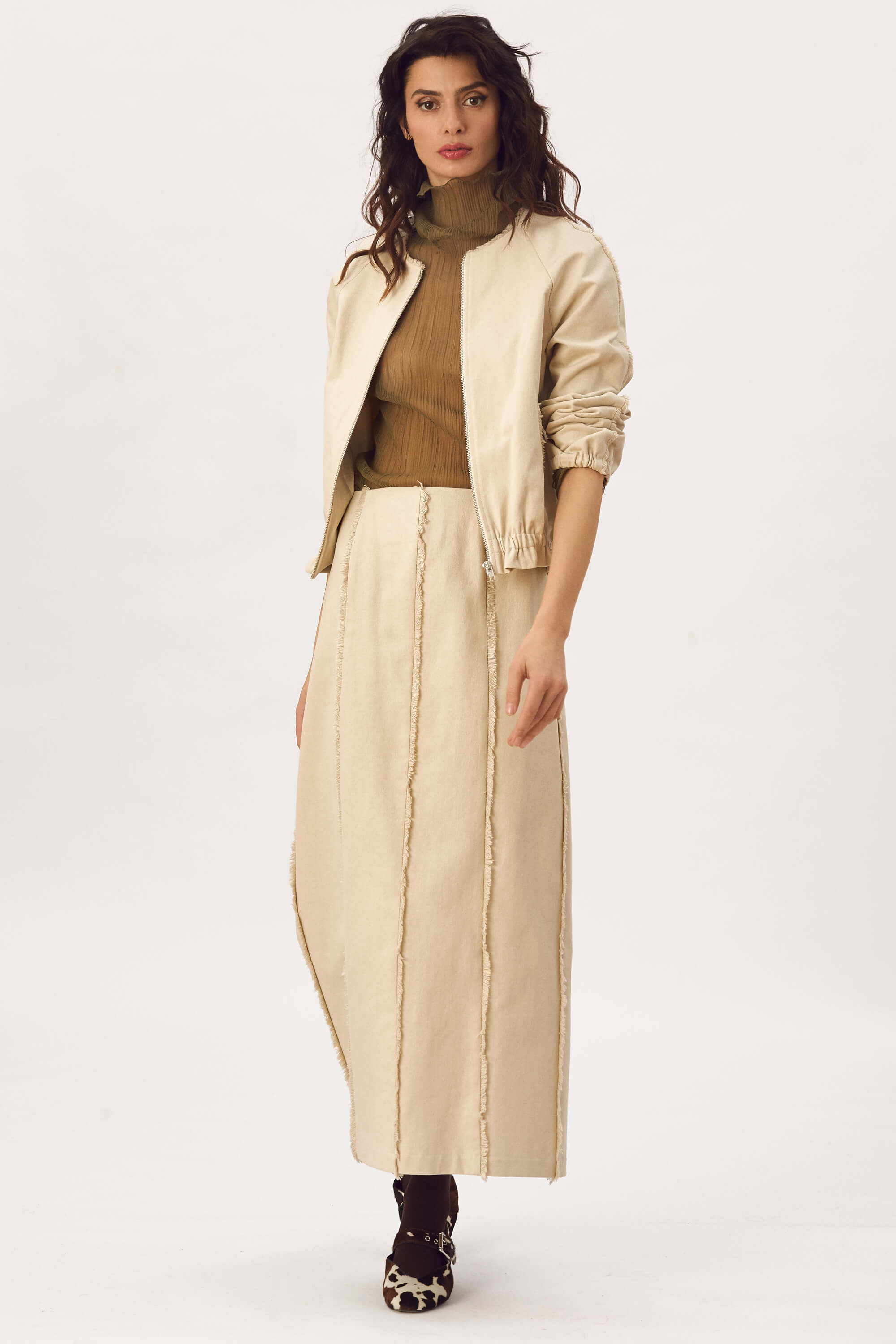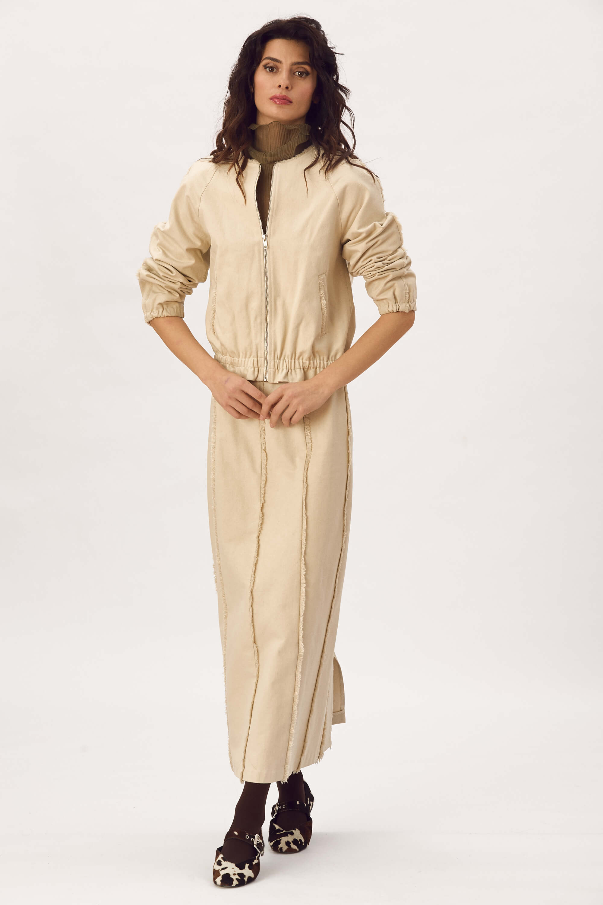 Jacheta tip bomber, din bumbac cu franjuri decorativi in jurul gatului, pe maneci si la buzunare, inchidere cu fermoar, maneci raglan, buzunare cu refilet si elastic imbracat la mansete si la baza. Captusit. Fusta lunga din bumbac cu franjuri decorativi, fara buzunare, inchidere cu fermoar la spate si slit la spate.