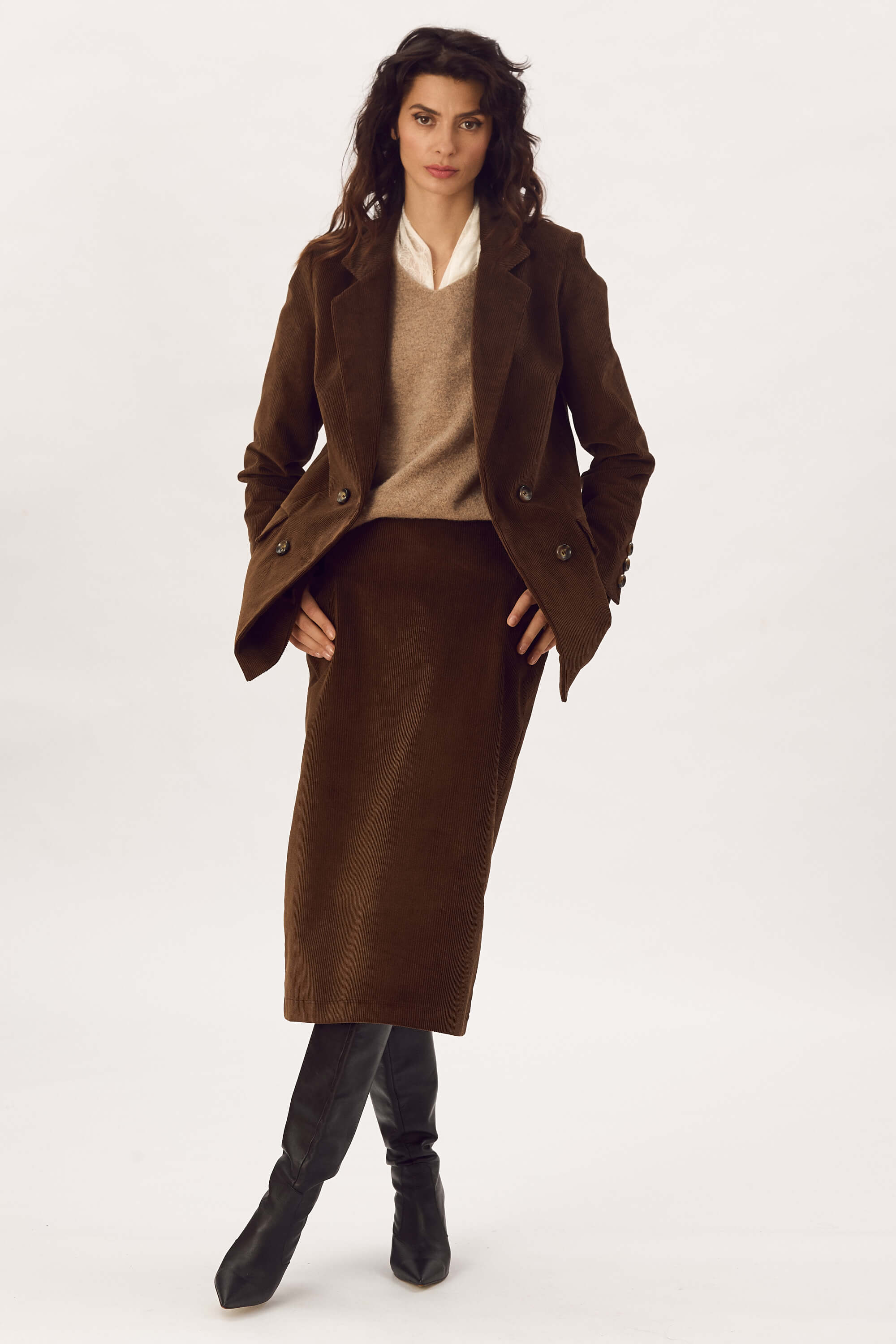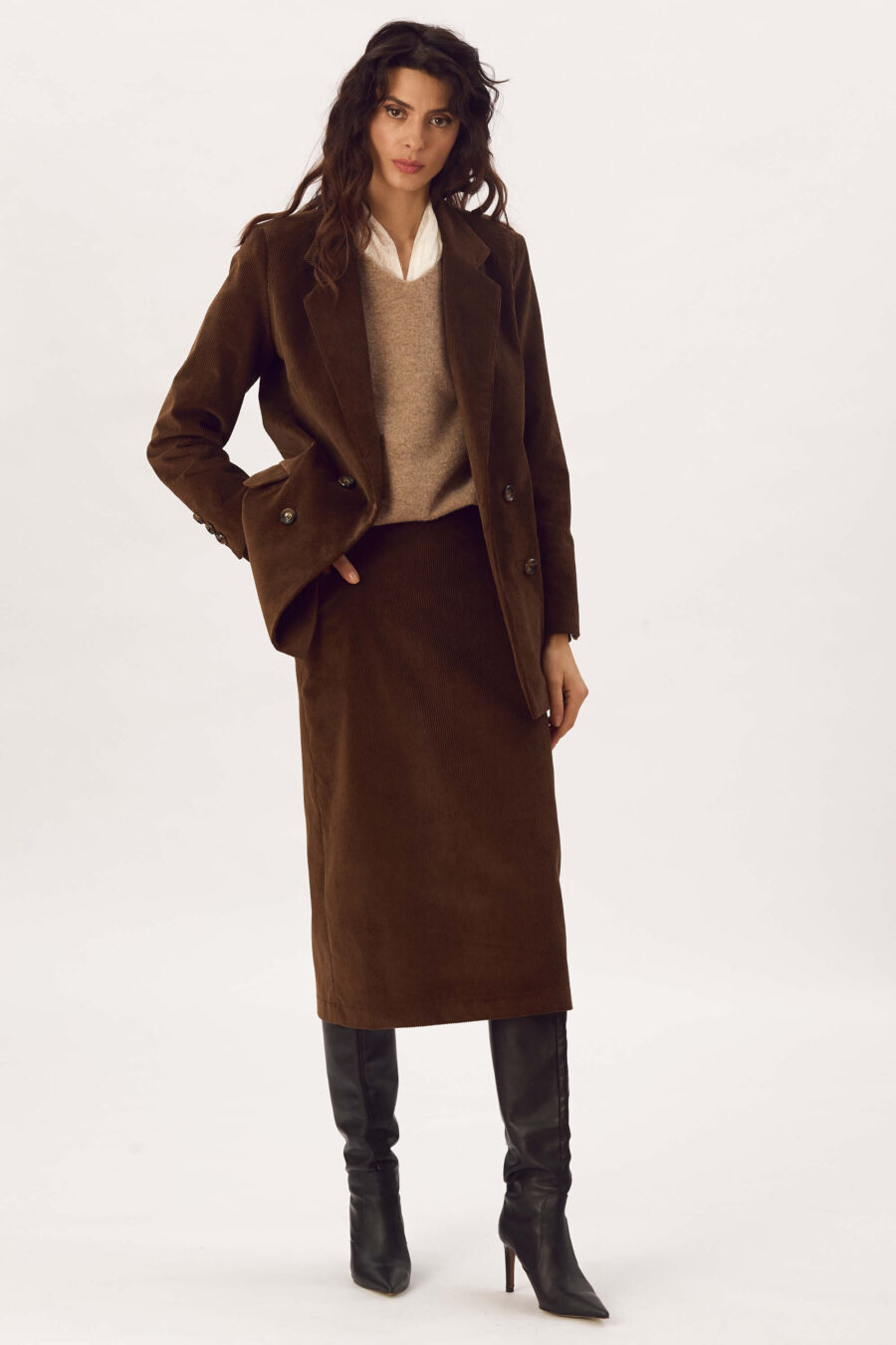 Fusta midi, din catifea reiata de bumbac, croiala dreapta la baza, cu fenta la spate, buzunare cu refilet laterale si fermoar ascuns la spate.