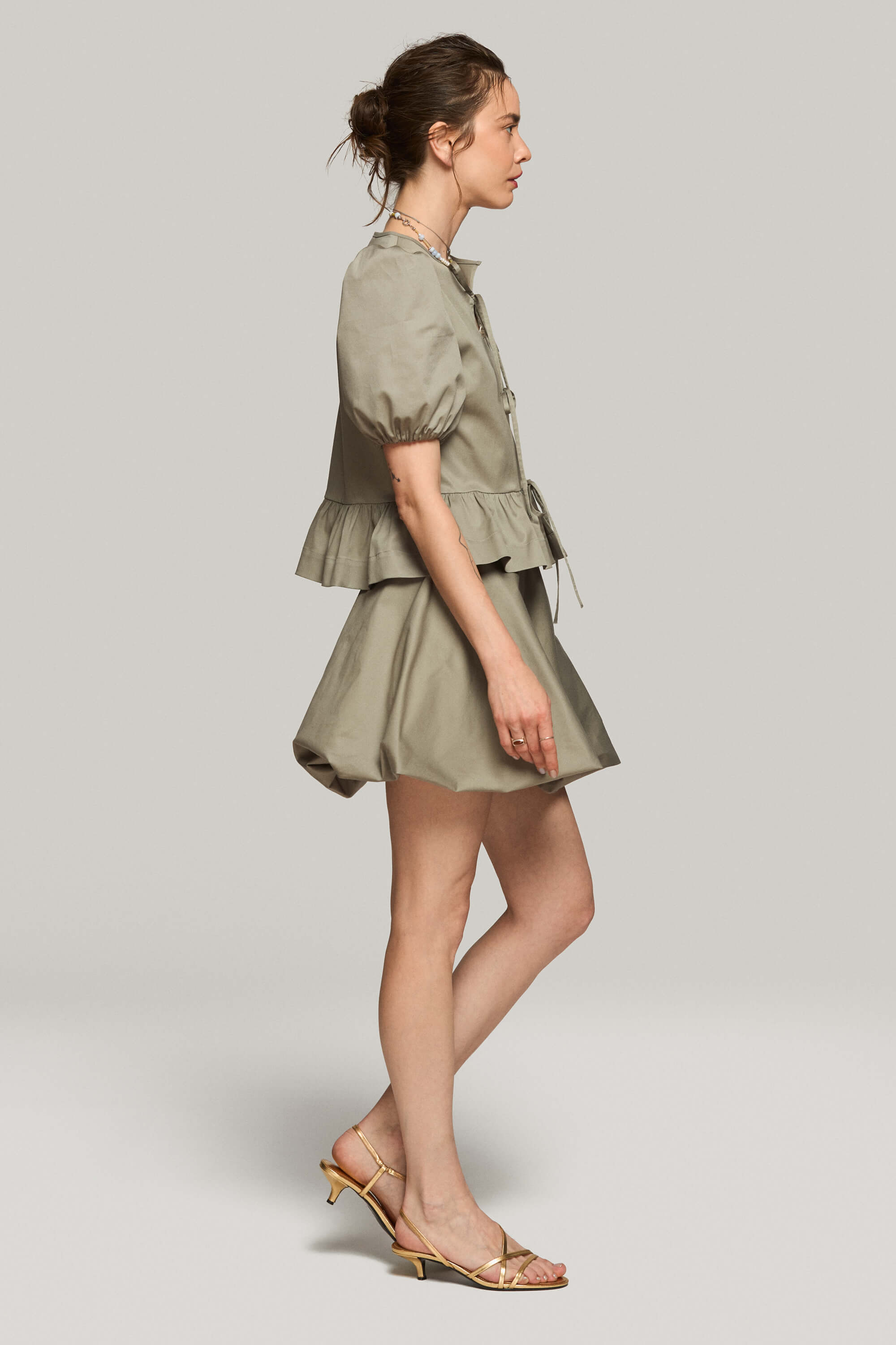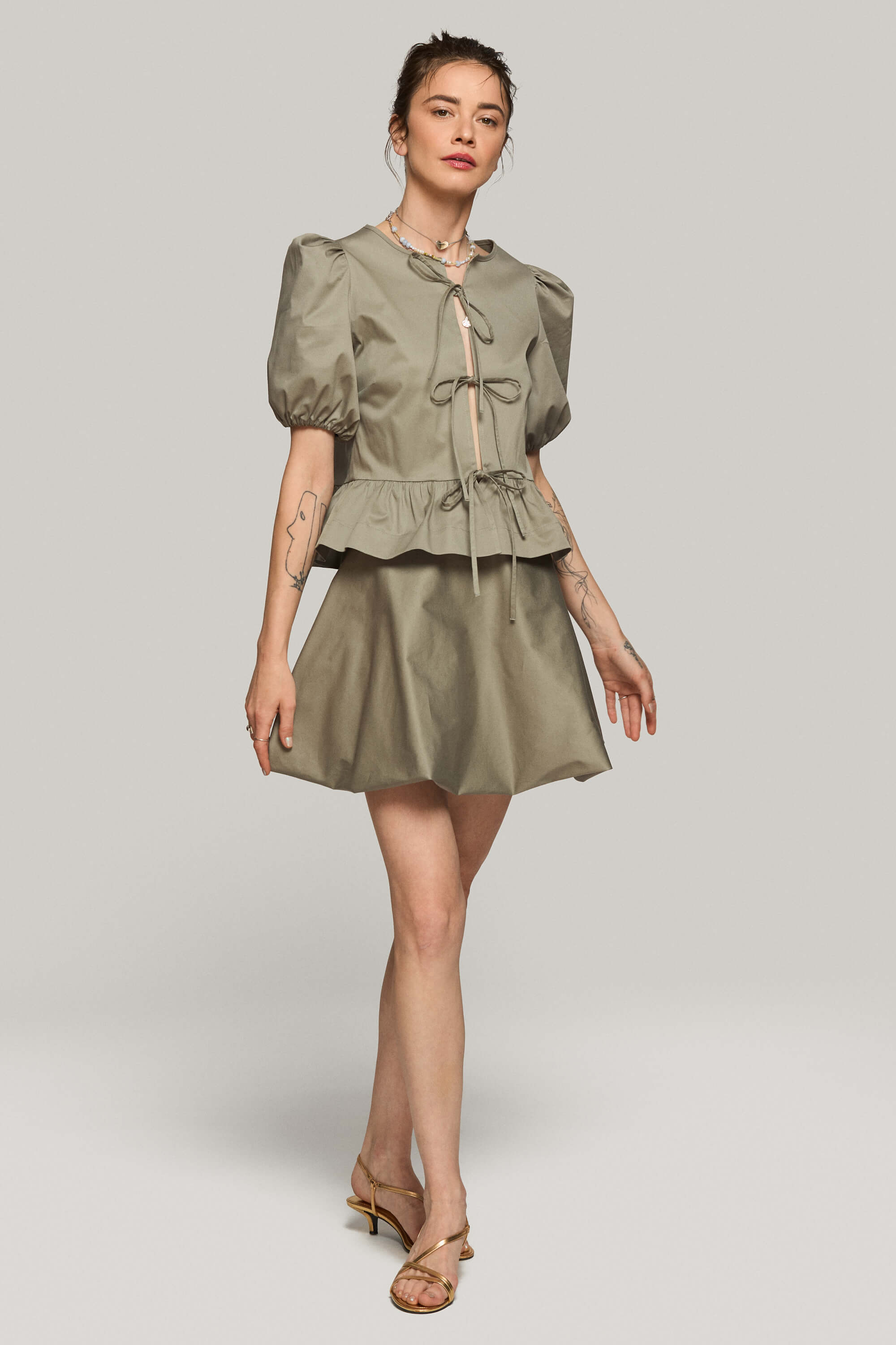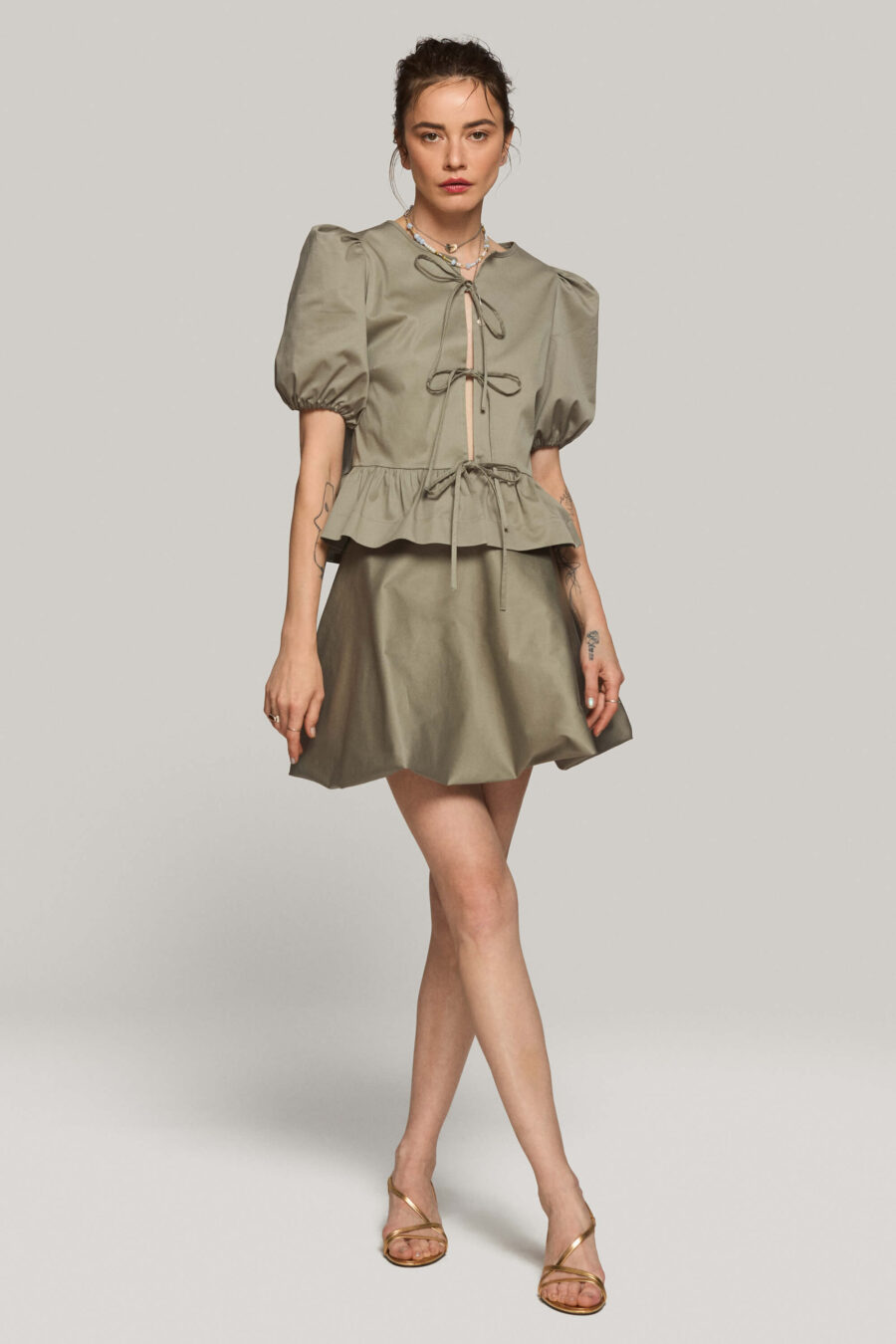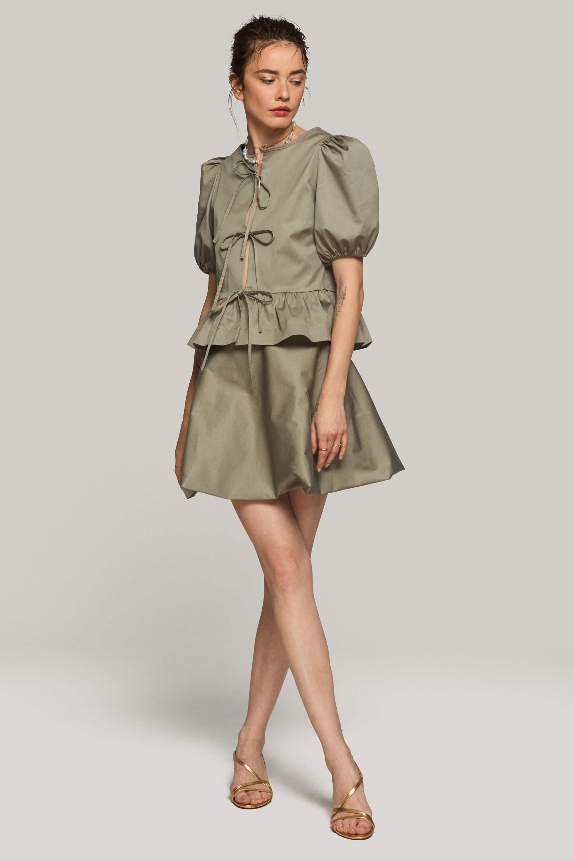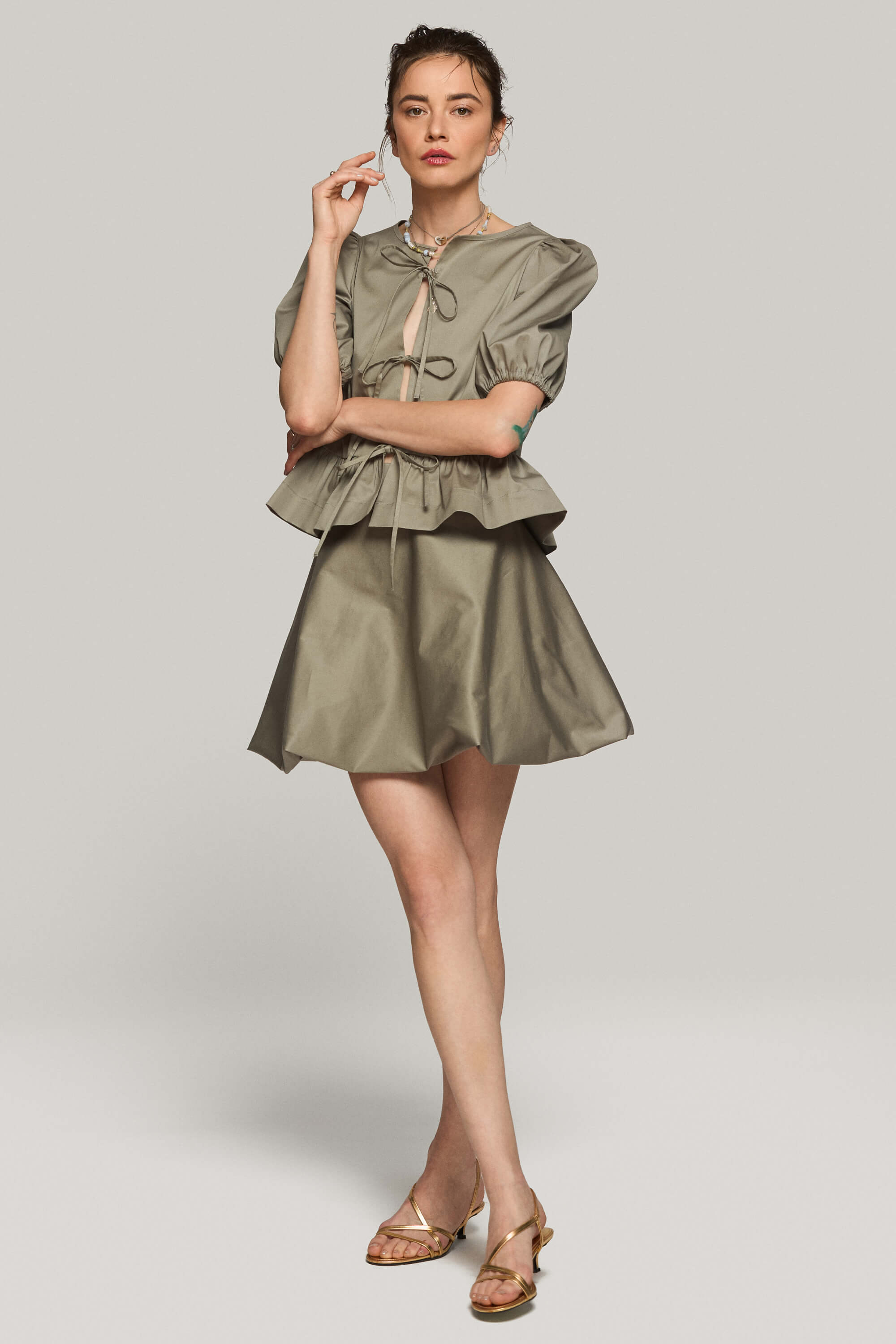 Fusta scurta din bumbac satinat, cu tiv tip balon pentru o silueta voluminoasa si inchidere cu fermoar ascuns la spate.