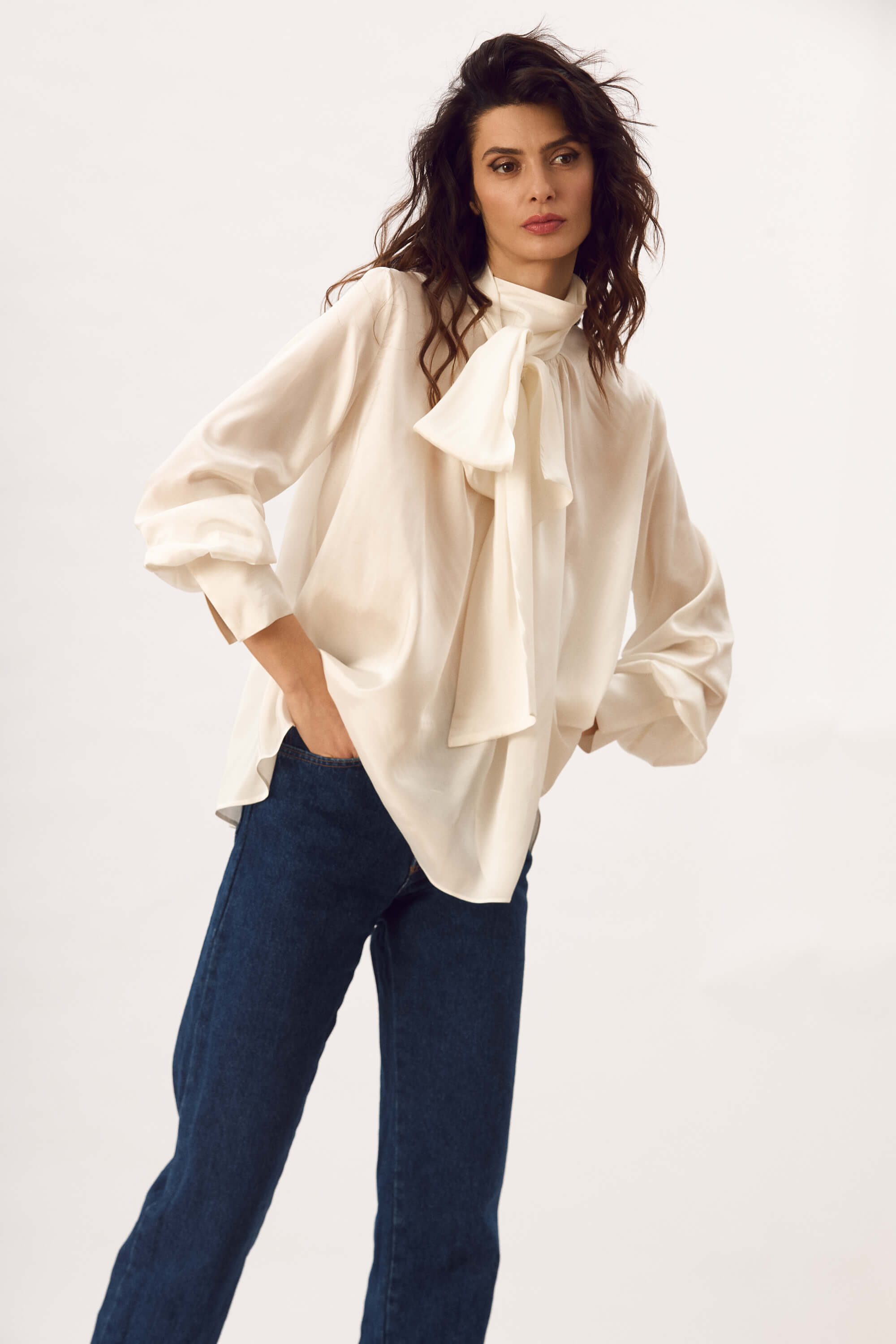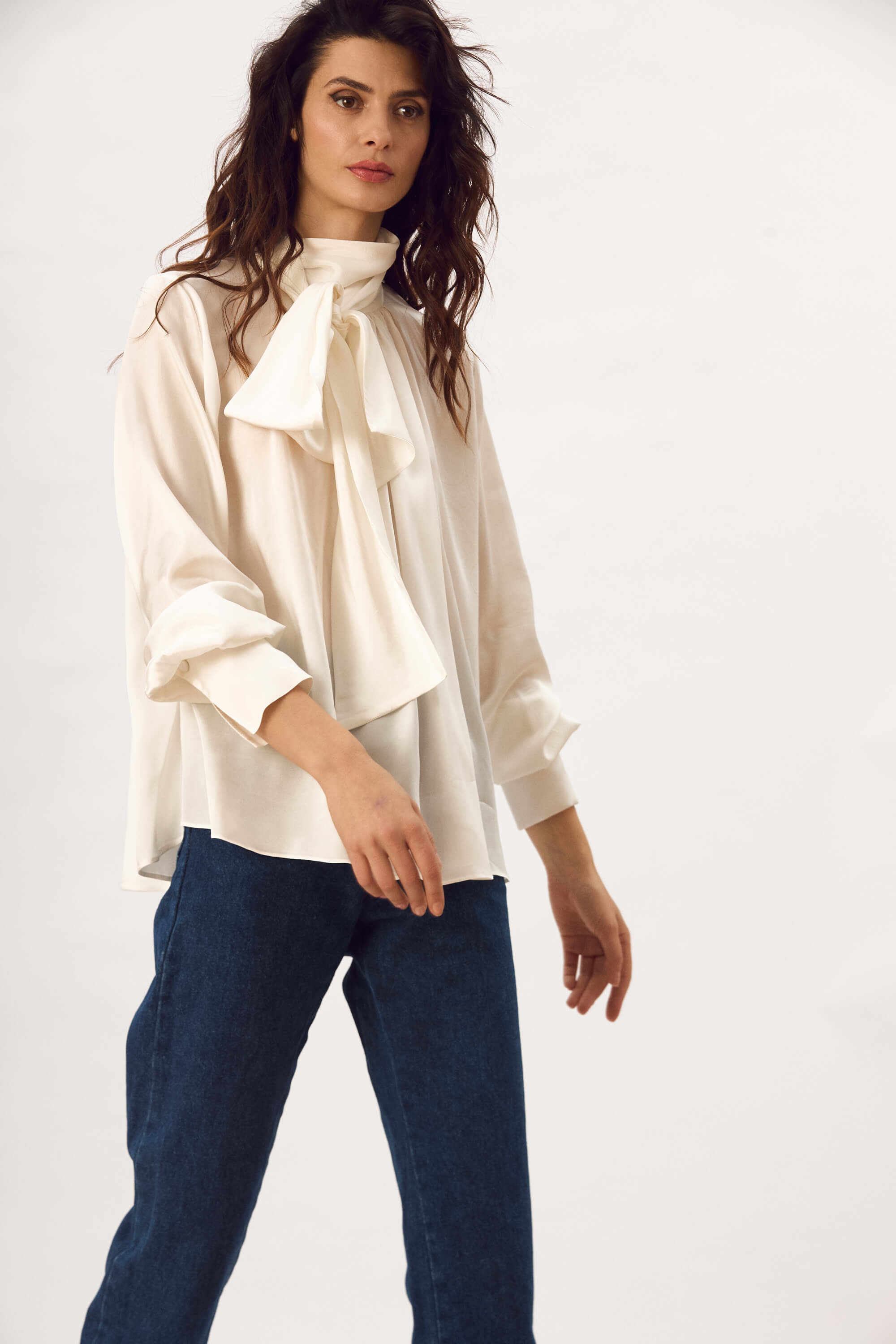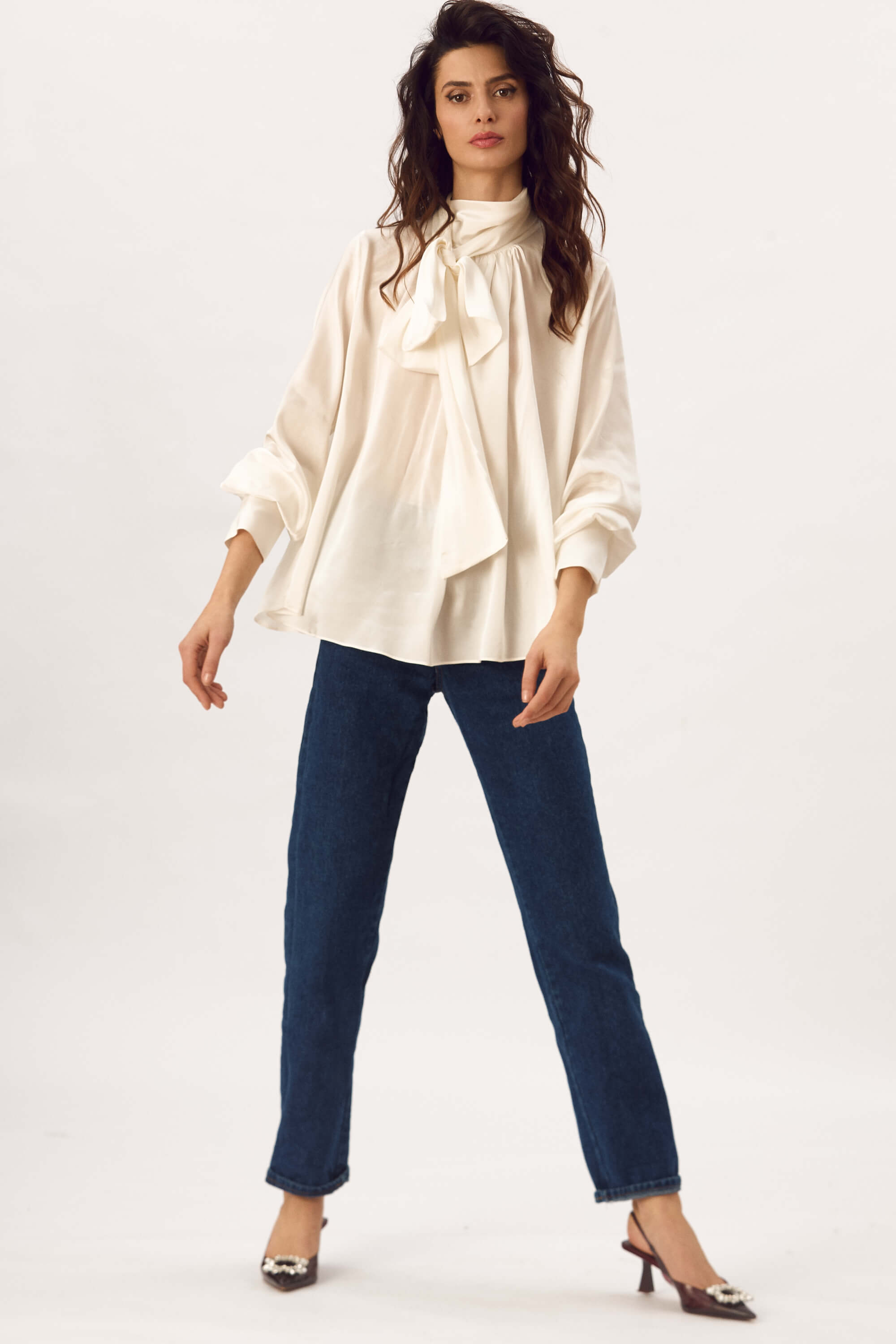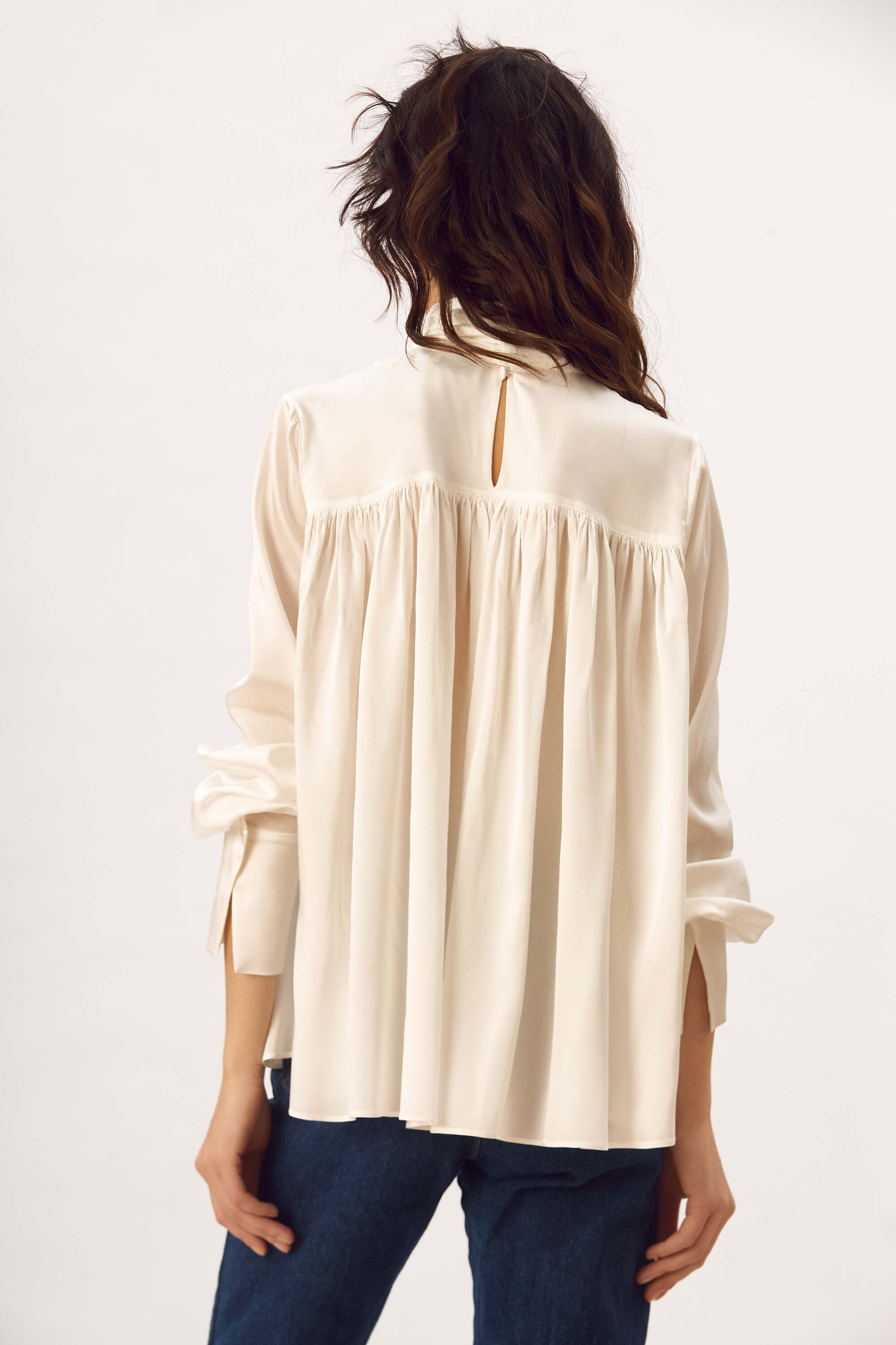 Bluza lejera din matase naturala, cu guler inalt cu esarfa, fenta cu nasture ascuns in spatele gatului, maneci lungi cu mansete cu nasturi, cusaturi incretite in fata si la spate pentru a crea un efect drapat.