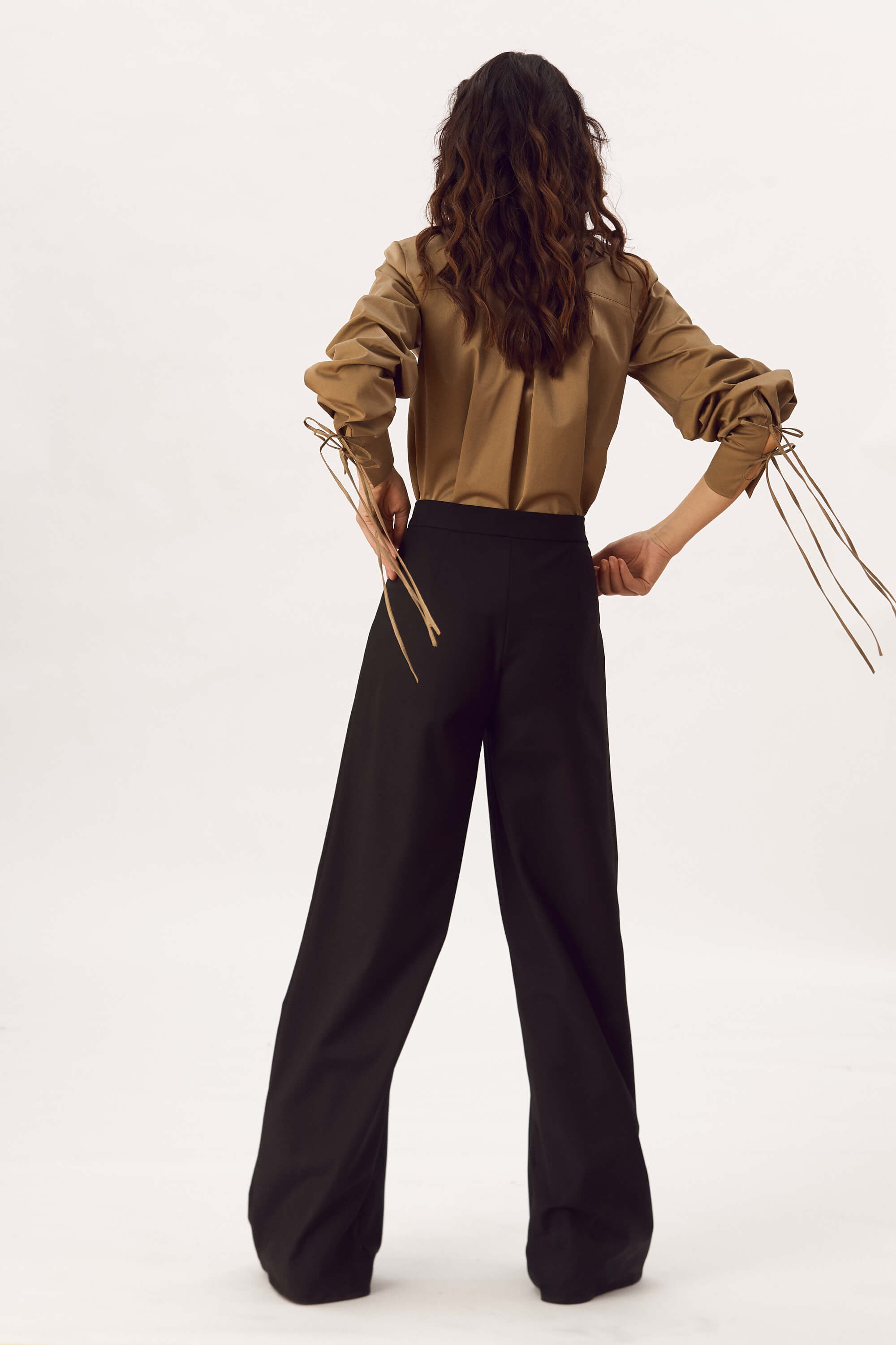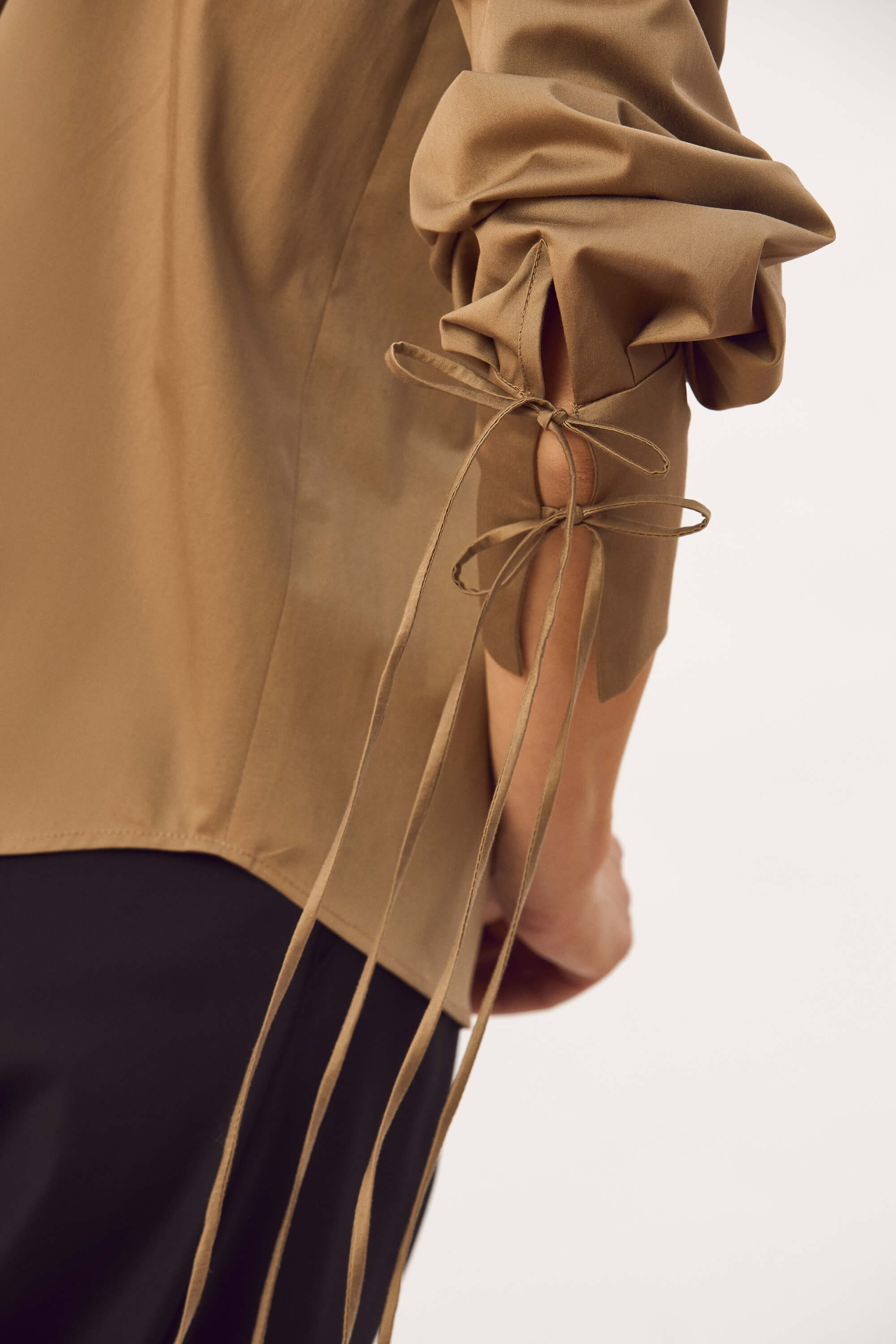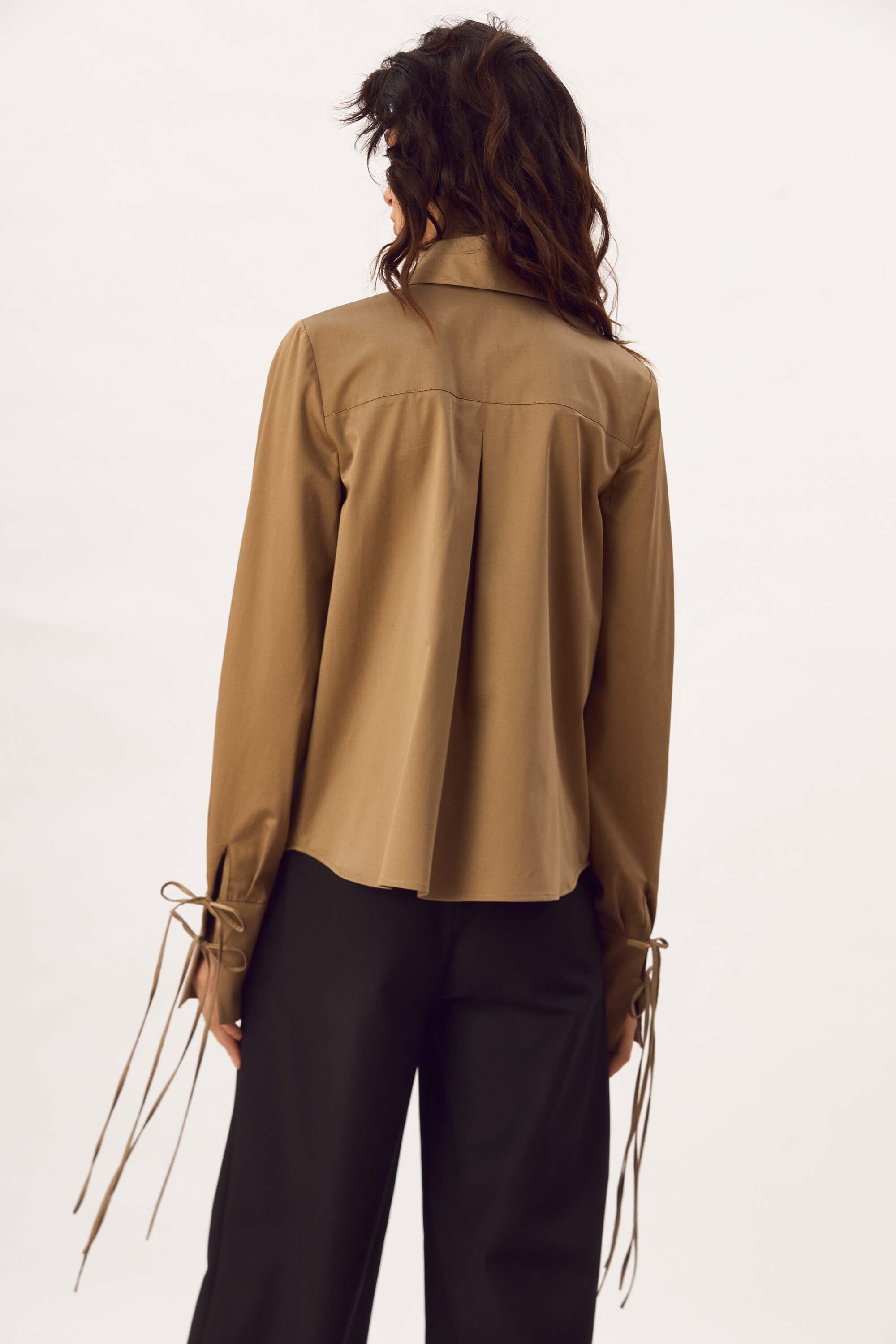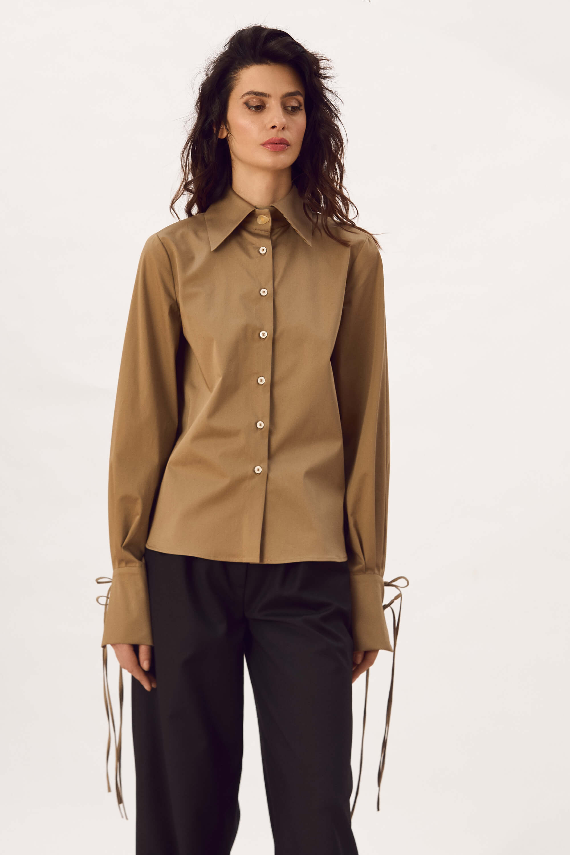 Camasa din bumbac satinat, cu guler, cu nasturi pe toata lungimea in fata, cu platca la spate si pliu, mansete cu snururi inguste ce se leaga.